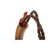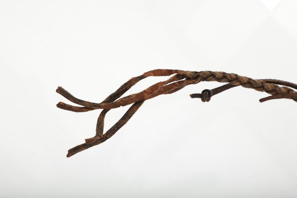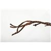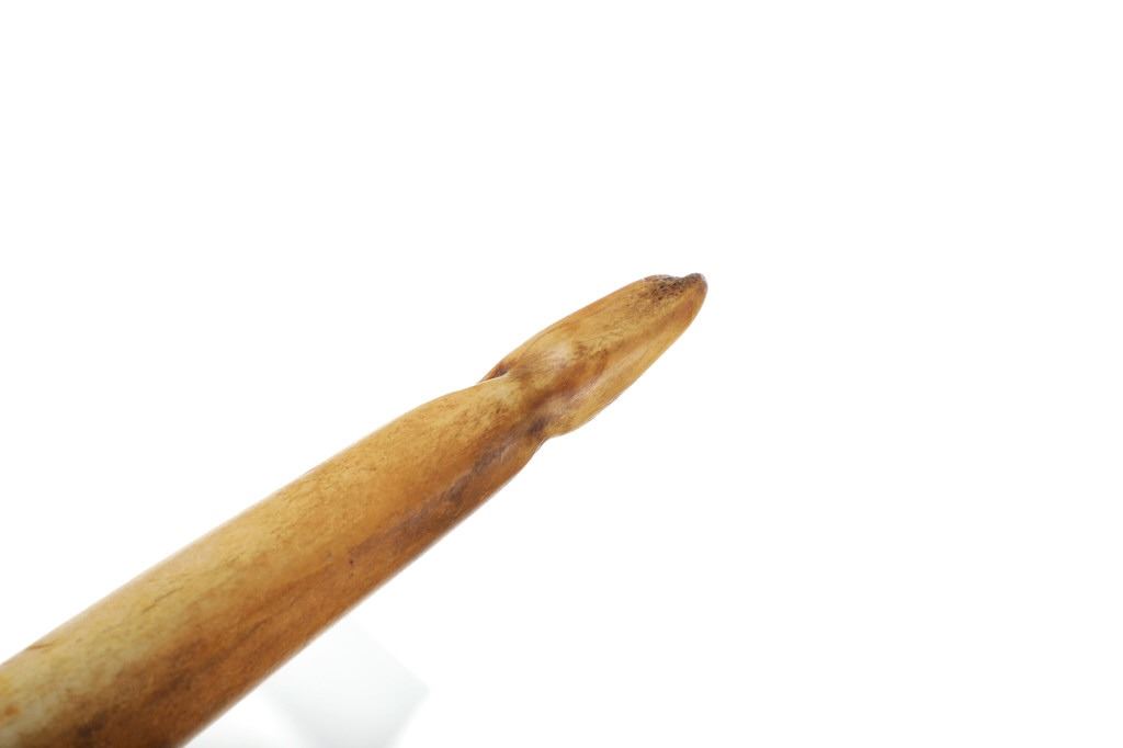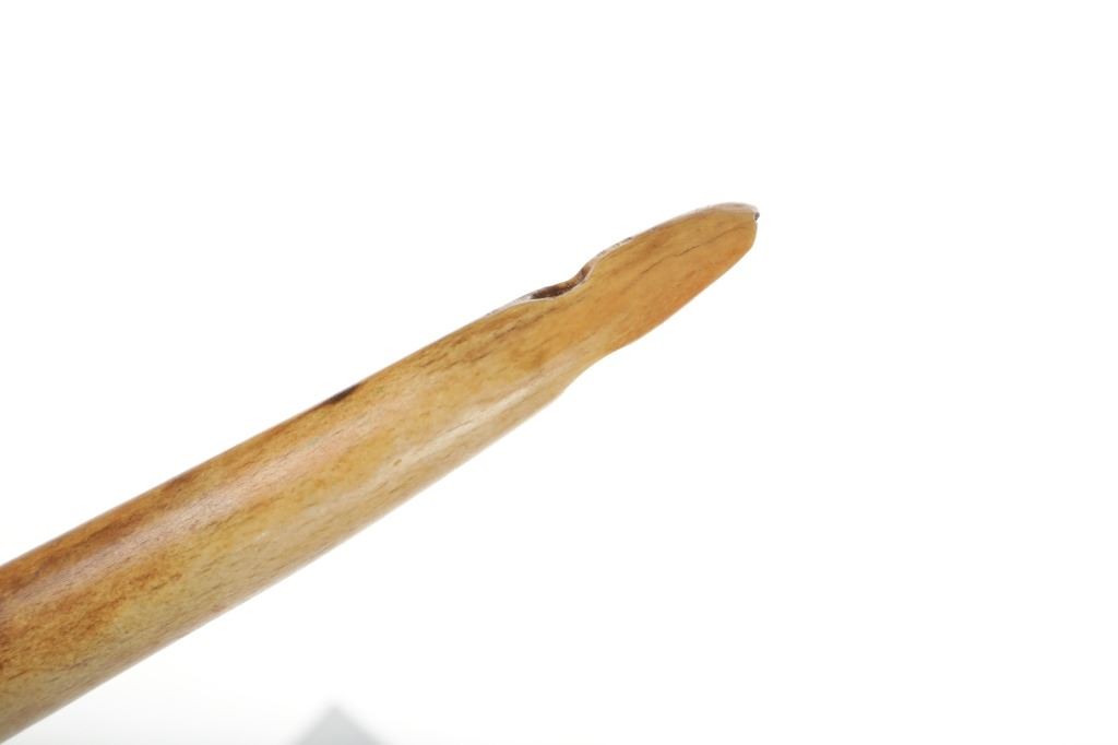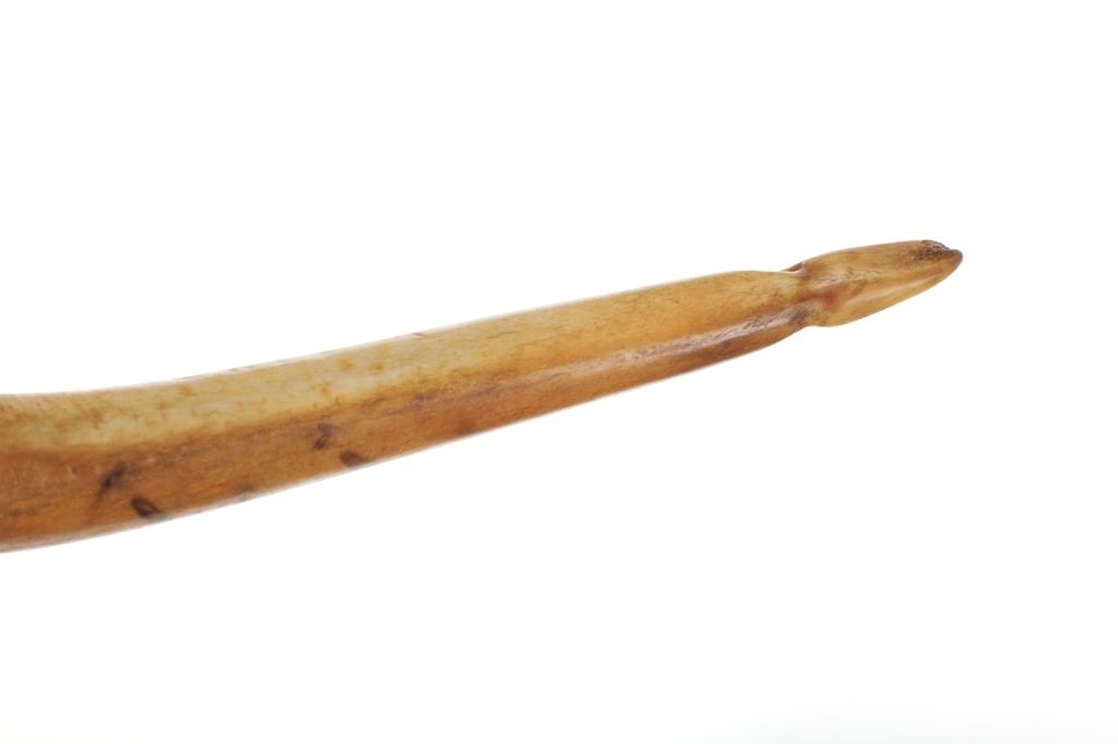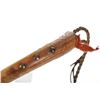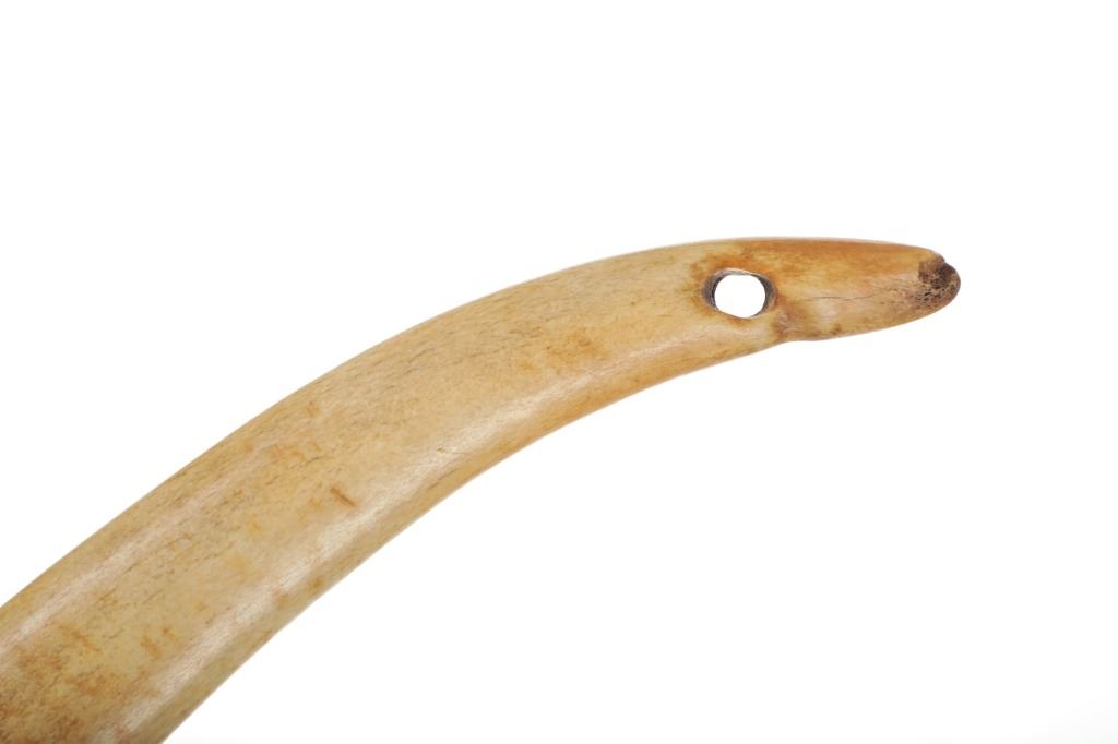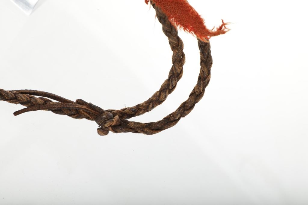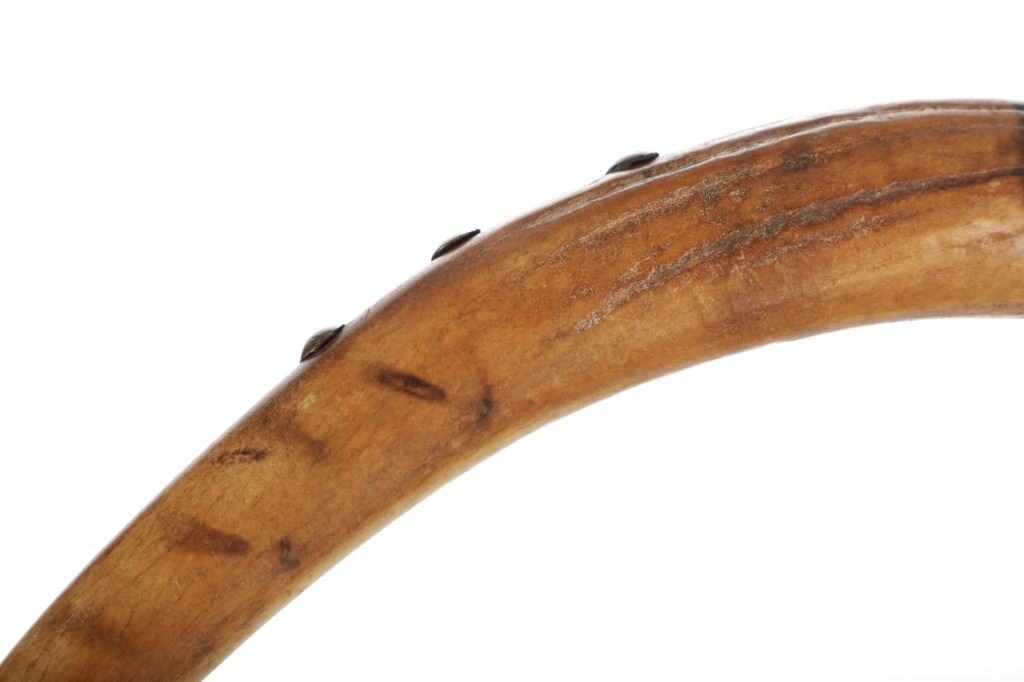 This is an excellent circa 1870 Southern Cheyenne Elk antler studded quirt from the Bruce VanLandingham Sundog collection. The piece is comprised of a Rocky Mountain Elk antler tine having two strands of braided harness leather bull whips secured in the end with a wooden dowl and strips of old red stroud wool trade clothe. The top of the quirt shows three solid square shank old brass trade tacks and the base of the quirt shows a hand drilled pierced hole which would have held a beaded wrist throng at one time. The antler has a dark yellow to red brown patina coloring from honest age and use with ridges of the antler being worn smooth along most of the piece and a heavy weight overall. The Indian Wars era piece shows well preserved condition and displays excellently. Provenance: From the renowned Sundog Fine Art Bozeman, Montana collection by Bruce VanLandingham. Bruce VanLandingham was a pillar in the American Indian collecting community and a respected expert. Along with being an avid collector, Bruce was also the sole owner of Sundog Fine Art Gallery in Bozeman, which was both part museum and gallery, this piece is directly from the collection. Measures overall 23.5"L. Museum collection number E1048.