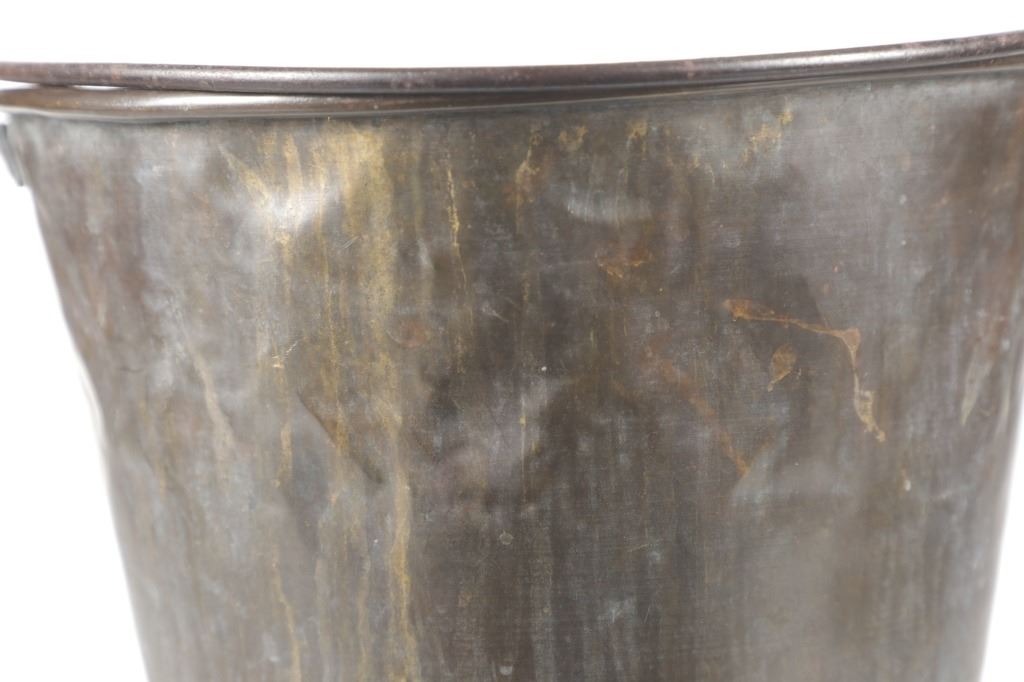 Featured in this lot is this circa 1874 swivel handle marked copper bucket. The bucket features a wonderfully and professionally crafted copper construction that shows a wrought iron swivel handle and a rolled lip. The bucket is marked on the bottom (what is readable) as follows: May 27, 1874 - ... Bro's - ...Dry, CT. The condition of this copper bucket is good with some patina due to age and some dents to the frame of the bucket and the mark is shown fairly worn out with only partially observed but otherwise shows good overall condition. The measurements of this bucket is 8 1/8" x 11 3/4" x 13 3/8". The collective weight of this bucket is 2lb 14oz.