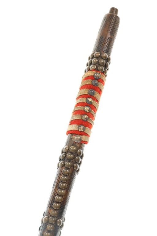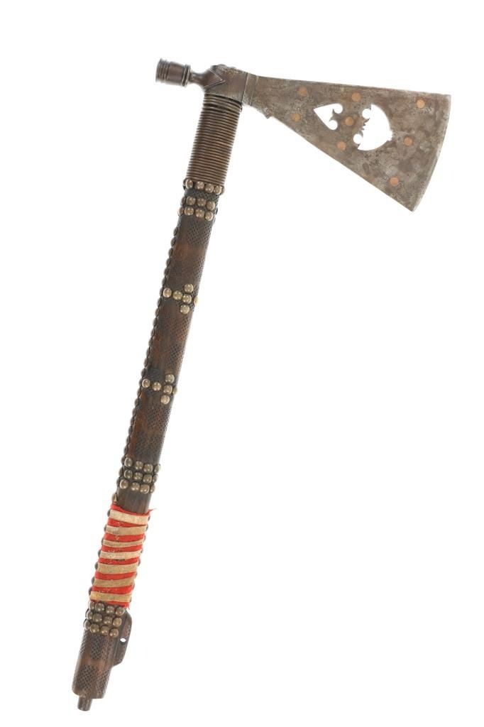 This is a fantastic circa 1875 double batwing cutout pipe tomahawk collected from the Crow in Montana. The piece exhibits a 10 ¾ inch long forged iron head that has eight copper inserts in the blade. The haft is adorned with old hot file branding, a small wrap of copper telegraph wire, brass tacks, and a wrap of old red stroud cloth around the gripping area secured with buckskin lacing and tacks. This is a large, heavy tomahawk with minor wear and oxidation to the blade and haft. Nice deep chocolate patina. From a large weapons and beadwork collection in Ohio. The double batwing cutout tomahawk is exceedingly rare with few known to exist in museums or private collections. These tomahawks rarely come up for public sale making them a very scarce and unique American Indian collectible. Cowan’s Auctions offered a Southern Plains Style Pipe Tomahawk with Inlay and Double-Cutout in their 4/5/2013 sale attributed to circa 1870 and sold for an astounding $42,000. A similar tomahawk is photographed in Hartzler and Knowles Indian Tomahawks and Frontiersmen Belt Axes (1991 figure 60). This example is also very similar to the example documented by Harold L. Peterson in his 1965 book, “American Indian Tomahawk” on page 119 figure 191. A photo of Baldwin's example in his book is included for reference. This tomahawk measures 23 inches long overall.