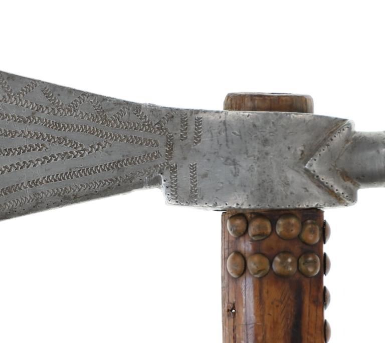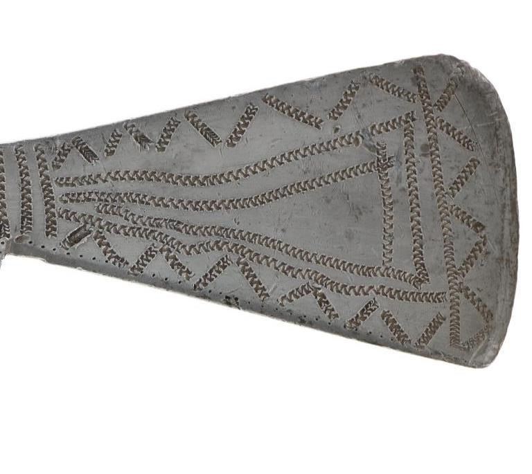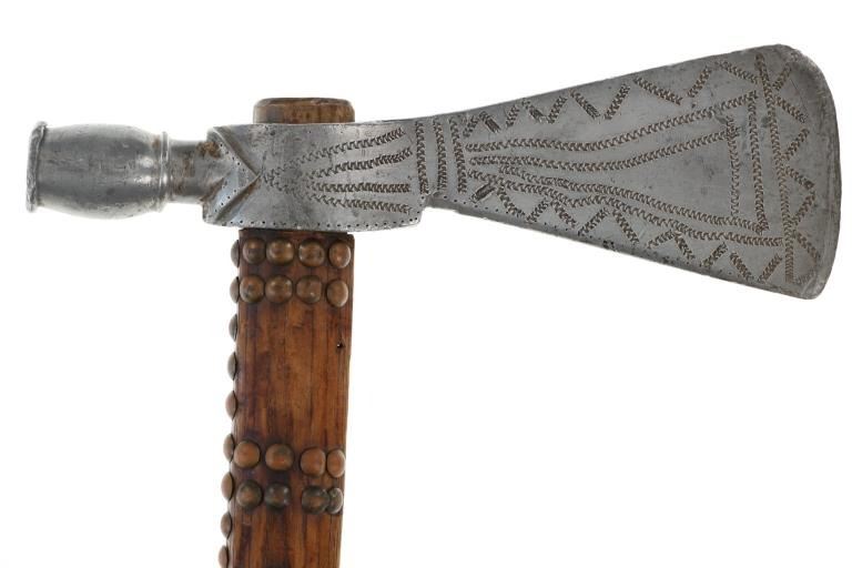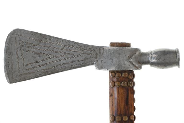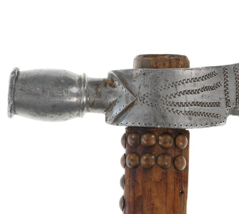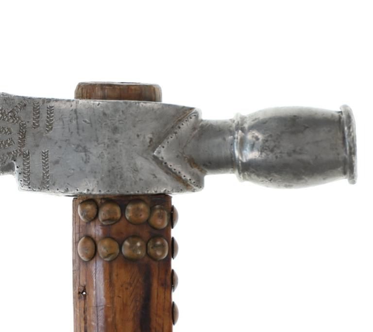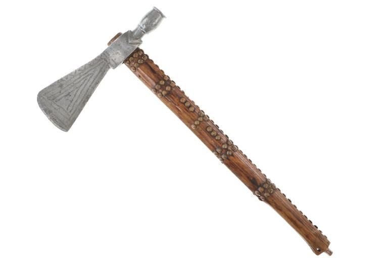 The lot features an original circa 1875- cast pewter fully rocker engraved pipe tomahawk in classic Western Plains pattern. The piece exhibits a large cast pewter head showing a wide western head with small rear facing spur and oblong tear drop / oval eye / eyelet hole with a gasket remnant inside. The top of the head shows a forged molded chevron with punch dot engraving having a tall large vase shaped pipe bowl with double ridge. The bowl has been drilled and widened by hand over time. The entire blade on both sides of the head are covered in rocker engraving in a geometric pattern. Fully pewter heads are immensely rare, as they are softer and rarely survive. The piece is on a solid wood, possibly hardwood haft of a later, but early age showing a hot file burned pattern with solid brass trade tack tops having metal round shanks having a dark patina. The gripping area is incised, cut in and the end shows a rectangular tapered smoking top with small spur end on the handle and pierced primitive hole which would have held a drop of some kind. Just above the gripping area is another pierced hole, which would have held a wrist throng, drop of beadwork or drop of feathers. Both drops are long missing. Provenance: Found to be an authentic circa 1875-1890 Western tomahawk by the experts at Morphys / James D. Julia. Nice original early Indian Wars era tomahawk head in rare pewter and presentation grade engraved state. Overall measures 18.75”L, the head is 9”L by 2 7/8”L across the bottom of the blade.