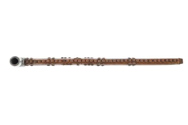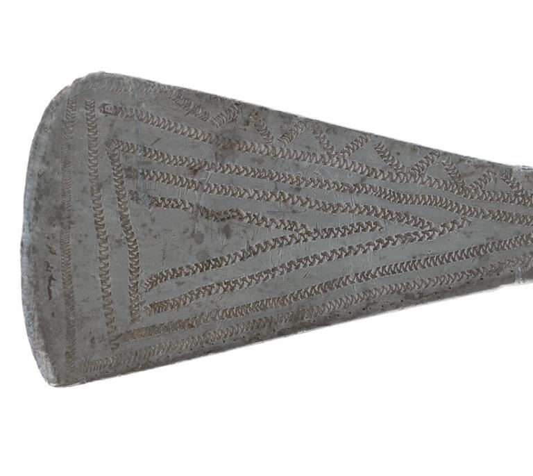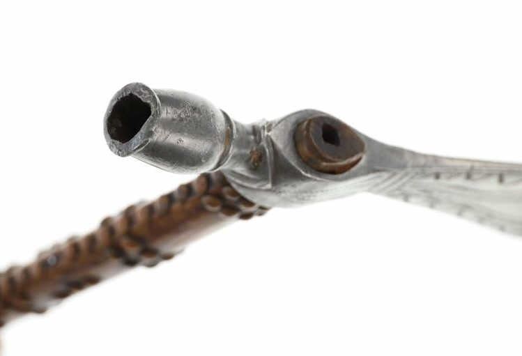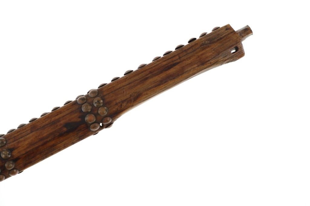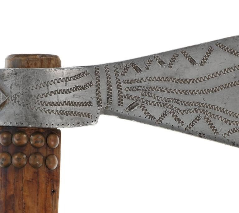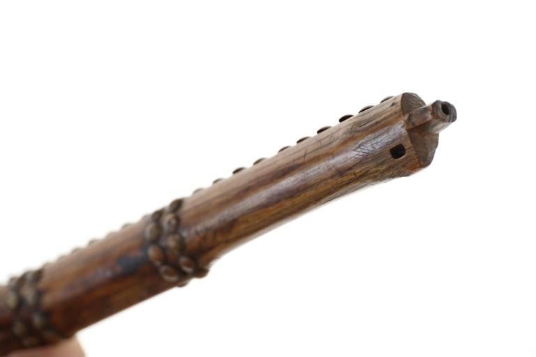The lot features an original circa 1875- cast pewter fully rocker engraved pipe tomahawk in classic Western Plains pattern. The piece exhibits a large cast pewter head showing a wide western head with small rear facing spur and oblong tear drop / oval eye / eyelet hole with a gasket remnant inside. The top of the head shows a forged molded chevron with punch dot engraving having a tall large vase shaped pipe bowl with double ridge. The bowl has been drilled and widened by hand over time. The entire blade on both sides of the head are covered in rocker engraving in a geometric pattern. Fully pewter heads are immensely rare, as they are softer and rarely survive. The piece is on a solid wood, possibly hardwood haft of a later, but early age showing a hot file burned pattern with solid brass trade tack tops having metal round shanks having a dark patina. The gripping area is incised, cut in and the end shows a rectangular tapered smoking top with small spur end on the handle and pierced primitive hole which would have held a drop of some kind. Just above the gripping area is another pierced hole, which would have held a wrist throng, drop of beadwork or drop of feathers. Both drops are long missing. Provenance: Found to be an authentic circa 1875-1890 Western tomahawk by the experts at Morphys / James D. Julia. Nice original early Indian Wars era tomahawk head in rare pewter and presentation grade engraved state. Overall measures 18.75”L, the head is 9”L by 2 7/8”L across the bottom of the blade.