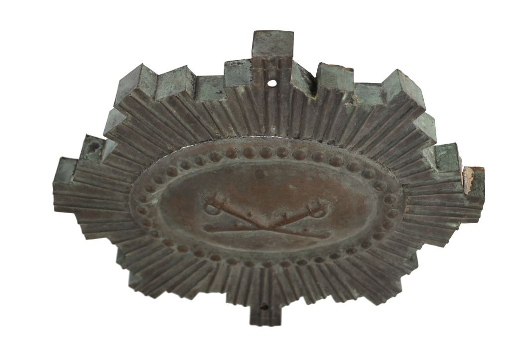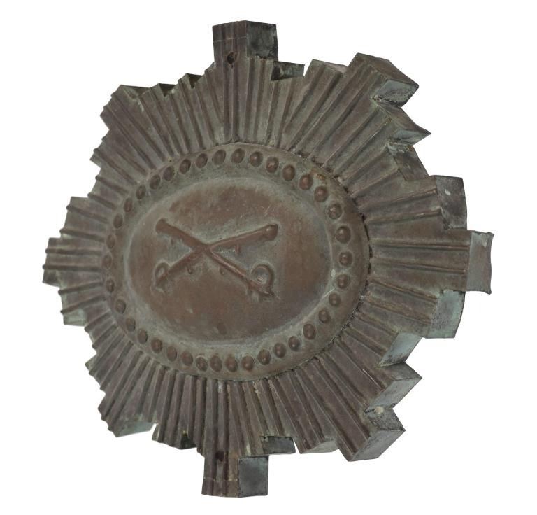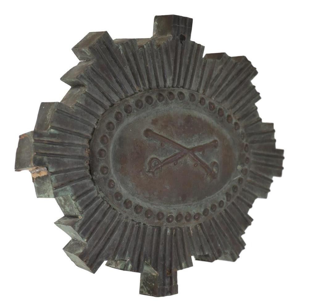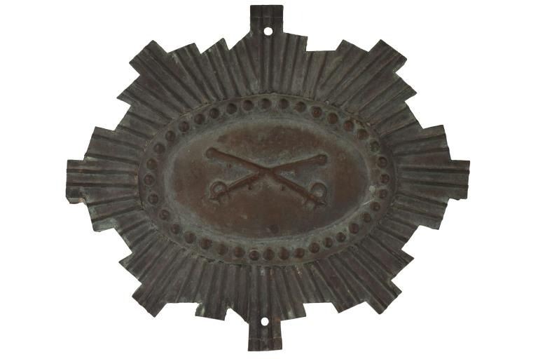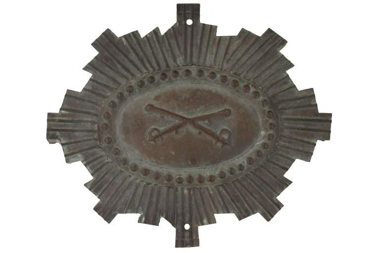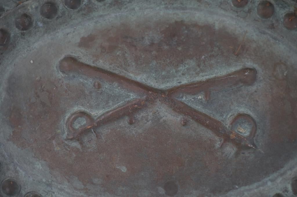 The first usage of this pattern of crossed sabers inside an oval and stepped medallion insignia was used by Sheridan’s Cavalry Corps insignia during the American Civil War in 1863 and later in badges in 1864. The condition of this cavalry sign is preserved with a break in the border above the cross sabers and shows a patina adorning the copper but otherwise shows a preserved condition. The measurements of this copper sign is 12 1/4" x 14 1/4" x 1 1/2". The collective weight of this sign is 2lb.