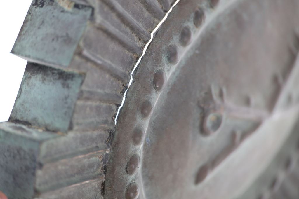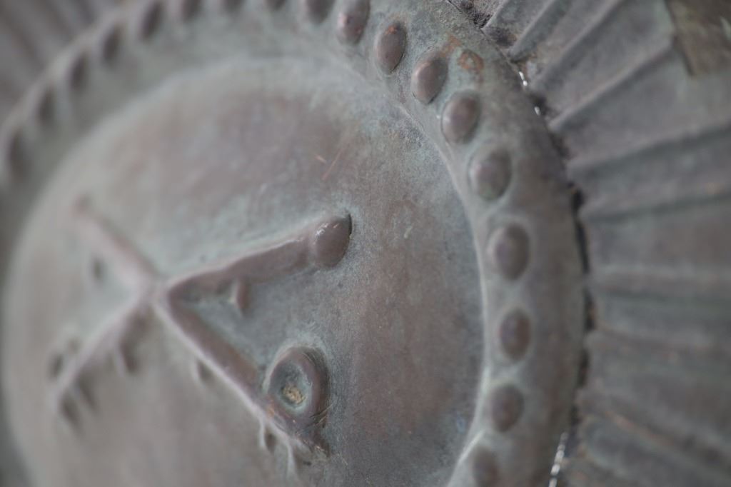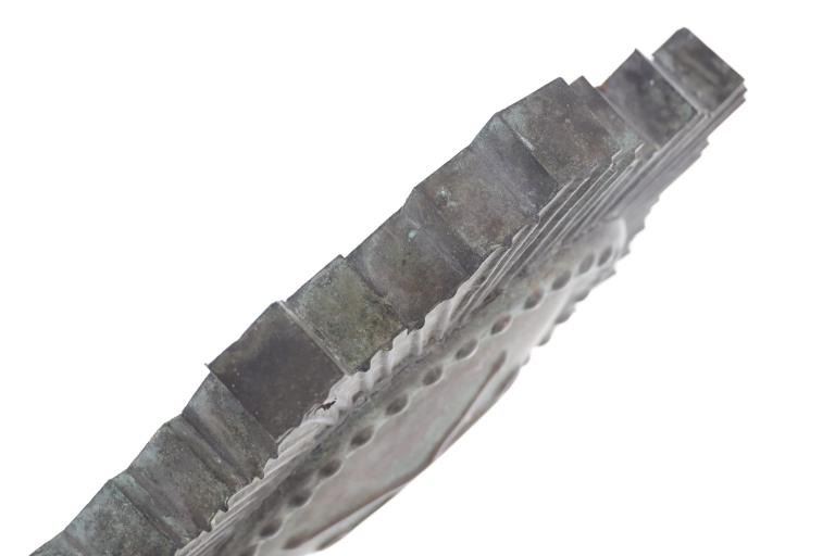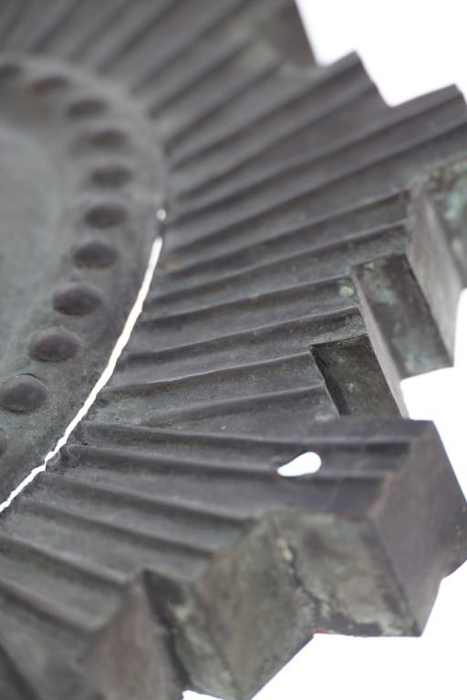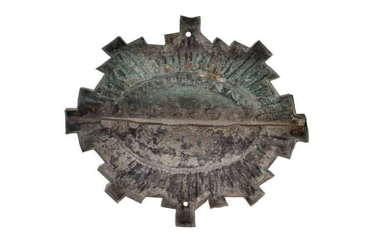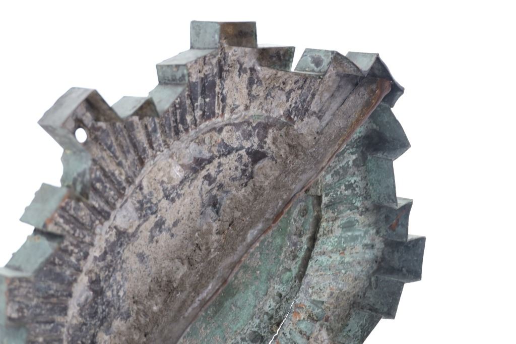 The first usage of this pattern of crossed sabers inside an oval and stepped medallion insignia was used by Sheridan’s Cavalry Corps insignia during the American Civil War in 1863 and later in badges in 1864. The condition of this cavalry sign is preserved with a break in the border above the cross sabers and shows a patina adorning the copper but otherwise shows a preserved condition. The measurements of this copper sign is 12 1/4" x 14 1/4" x 1 1/2". The collective weight of this sign is 2lb.