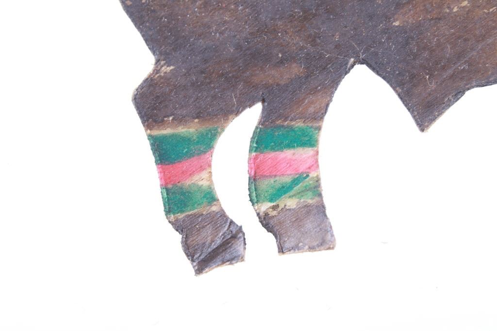 The lot features a fantastic parfleche tipi ornament of a Buffalo from the Blackfeet Native American Indians dating to circa 1880’s from the ex-collections of famed Montana artist Robert Scriver and Mitchell Kwiatkowski. The piece is comprised of a piece of parfleche rawhide remnant hand cutout into the shape of a Great American Bison Buffalo with a polychrome mineral pigment painted finish with a black, red and green coloring. The piece holds a museum collection tag which confirms the above info and a number of MK599.1. Provenance: From the ex-collection of Robert Scriver and Mitchel Kwiatkowski. Bob Scriver (1914-1999) was a famous Montana sculptor with a major Montana Blackfeet collection. Mitchell Kwiatkowski also had the other two pieces in this sale from Alfred Kroeber (1876-1960) whom he collected many things from. This is truly a unique effigy amulet piece that is well preserved. Measures 5 3/8”W by 2 7/8”.