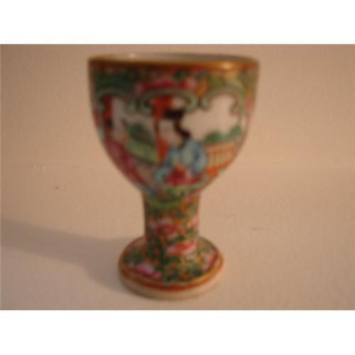 Circa 1880 Chinese Export Rose Medallion Rare Egg Cup. This unusual and seldom seen egg cup is hard to find. It measures 2 1/2" in height and 1 3/4" in diameter across the top. Good Condition with only the tiniest of a flea bite on the inside of the rim. The cup has alternating panels of figures and birds and flowers.