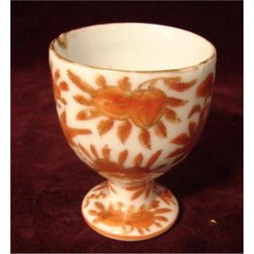 Circa 1880 Chinese Export sacred Bird and Butterfly Egg Cup. This is the first egg cup we have seen in a long time in the sacred bird and butterfly pattern in chinese export porcelain. It haseen restored in 24K Gold as is noticeable in one of the images. It measures 2 1/2" in total height and the top of the egg cup is 2" in diameter.