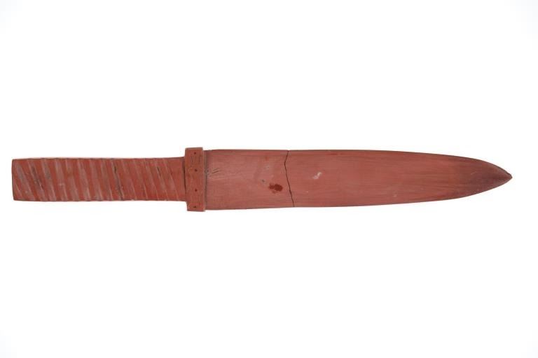 This is a dag or dagger knife carved from catlinite of a nice full size dating to circa 1880-1890’s from the Northern Plains Native American Indians from the Sundog Bruce VanLandingham collection. The piece is carved of one solid piece of catlinite pipestone showing an unusual pink-ish color to deep red with speckled pink coloring as well. The knife shows a double edged blade in dag or dagger form showing a rectangular hilt / guard that is etched or carved on both sides. The grip shows a ridged or spiral cut design. The blade shows remnants of being etched and a punch dot carved design as well. The blade has been previously broken and repaired, an old repair. Provenance: From the renowned Sundog Fine Art Bozeman, Montana collection by Bruce VanLandingham. Bruce VanLandingham was a pillar in the American Indian collecting community and a respected expert. Along with being an avid collector, Bruce was also the sole owner of Sundog Fine Art Gallery in Bozeman, which was both part museum and gallery, this piece is directly from the collection. Measures overall 10 7/8”L by 1 3/8”W.
