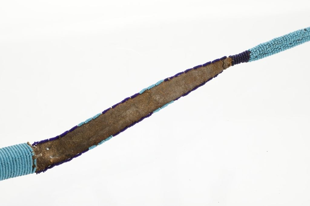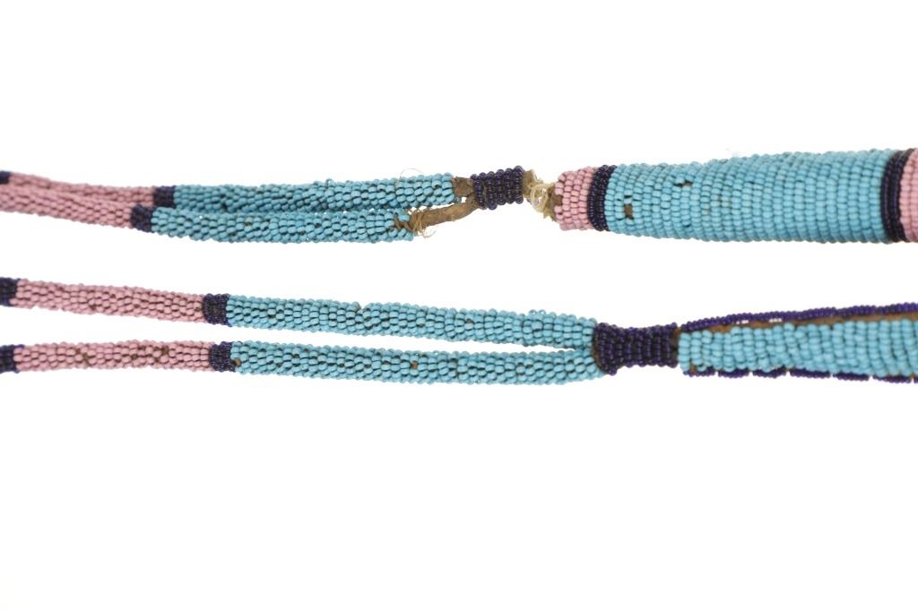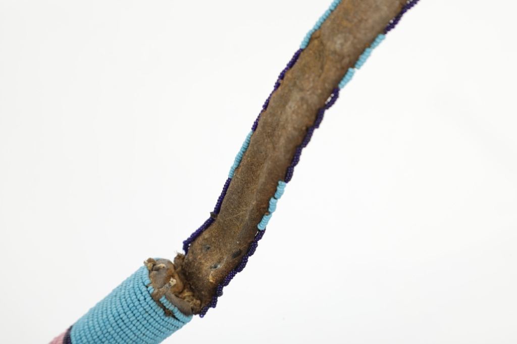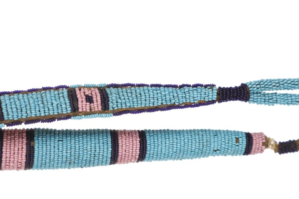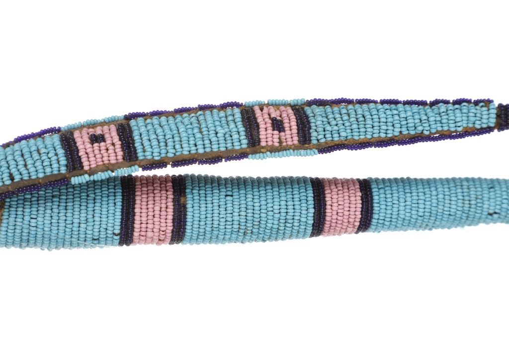 The lot features a unique fully beaded awl case with long beaded fringes and flap dating to circa 1880 from the Sioux Native American Indians. The bag is constructed from Indian tanned Buffalo hide which is covered completely in period correct 19th Century glass trade seed beads. The banded linear and geometric pattern shows a sky padre blue background with bands of Cheyenne pink and cobalt. The beadwork and bag is sinew sewn. The piece has a long top flap which holds two fully beaded thick fringes and two long thick fully beaded thick fringes on the base of the bag itself. One of the more intricate and beautifully beaded awl cases offered for public sale. Provenance: From the renowned Sundog Fine Art Bozeman, Montana collection by Bruce VanLandingham. Bruce VanLandingham was a pillar in the American Indian collecting community and a respected expert. Along with being an avid collector, Bruce was also the sole owner of Sundog Fine Art Gallery in Bozeman, which was both part museum and gallery, this piece is directly from the collection. The bag shows very slight bead loss and stiffening of the hide. Measures overall 23"L. The bottom fringe and awl case have a separation with small sinew. Museum collection number E1023.