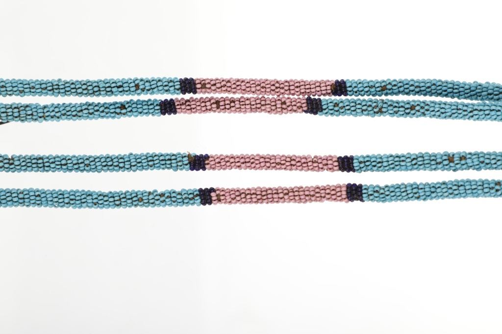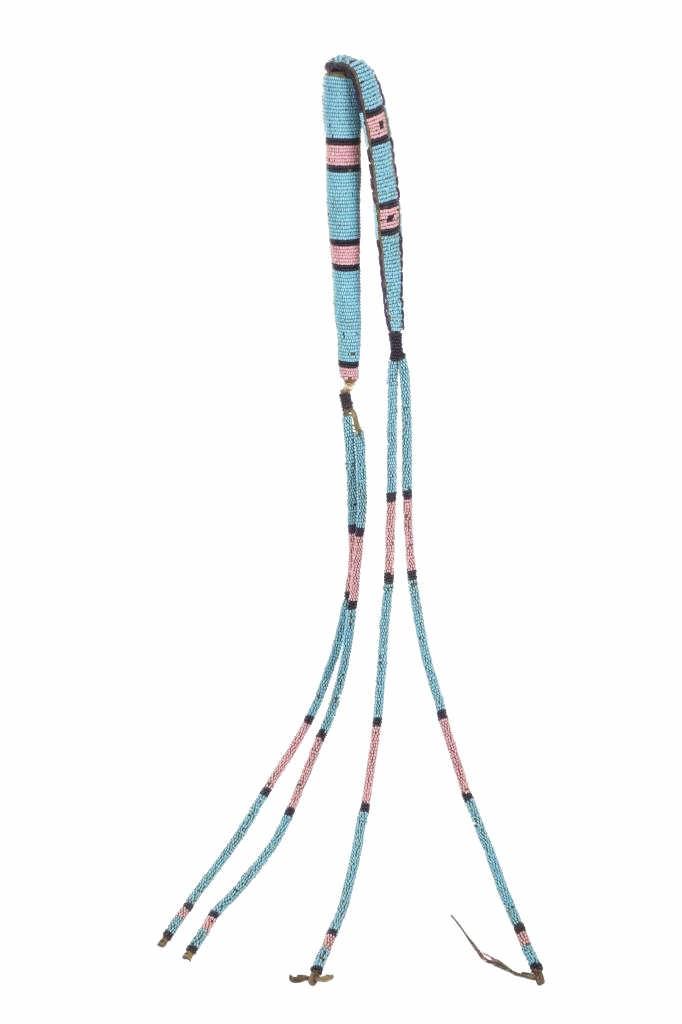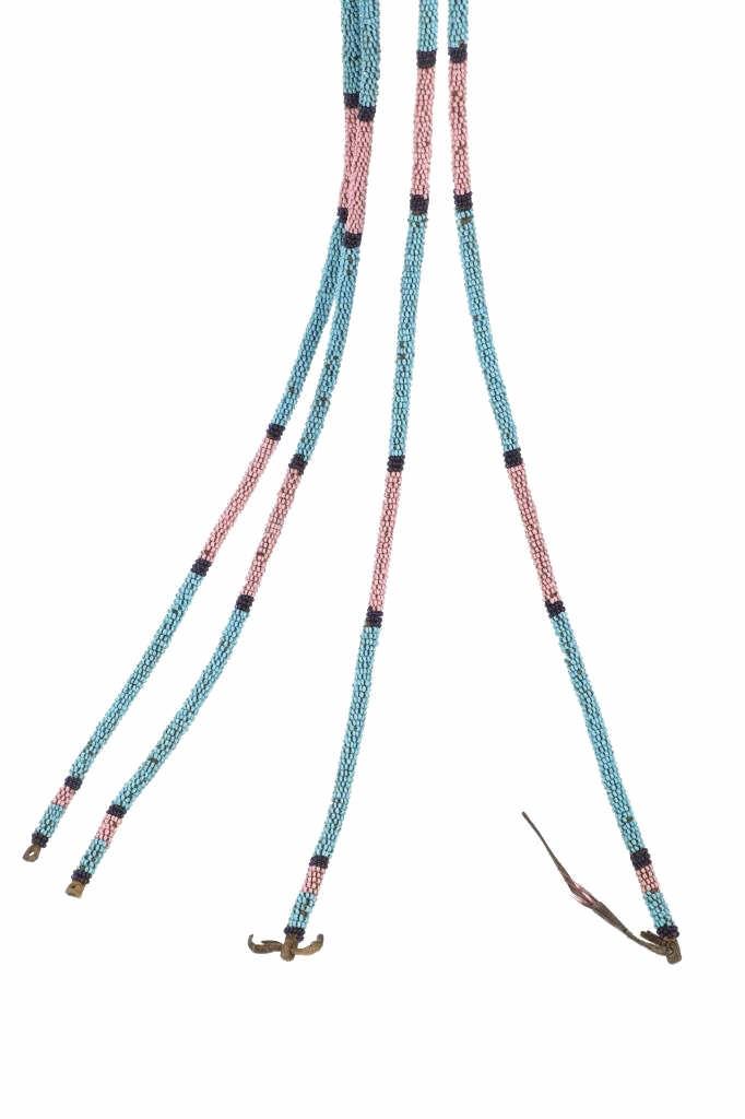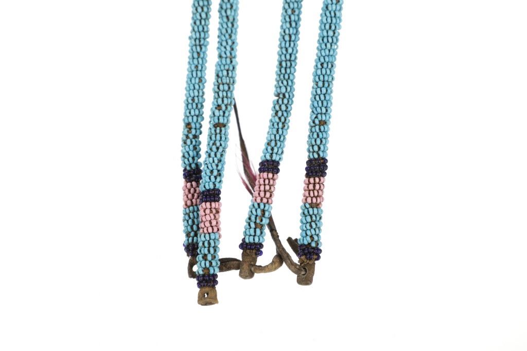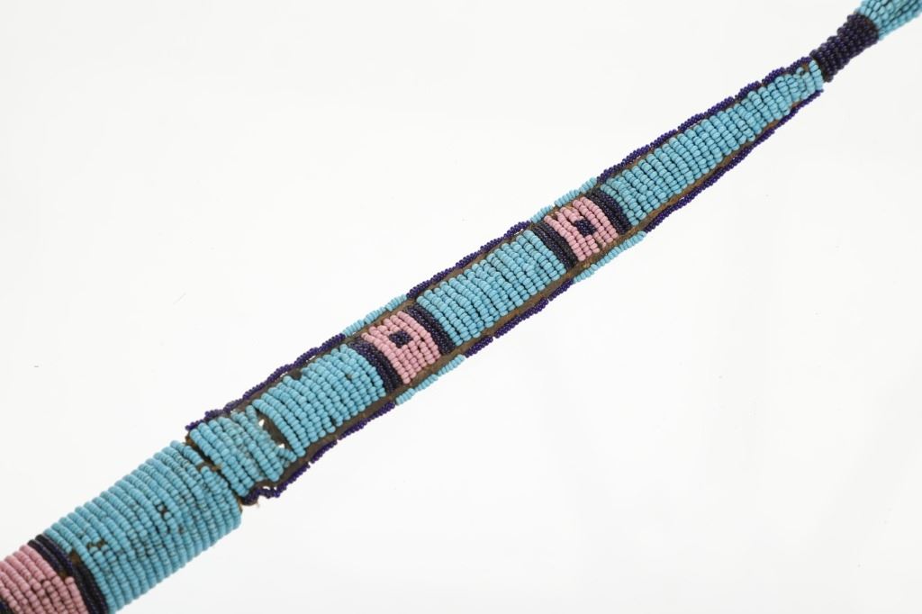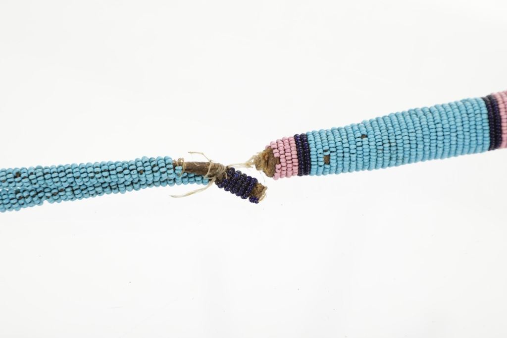 The lot features a unique fully beaded awl case with long beaded fringes and flap dating to circa 1880 from the Sioux Native American Indians. The bag is constructed from Indian tanned Buffalo hide which is covered completely in period correct 19th Century glass trade seed beads. The banded linear and geometric pattern shows a sky padre blue background with bands of Cheyenne pink and cobalt. The beadwork and bag is sinew sewn. The piece has a long top flap which holds two fully beaded thick fringes and two long thick fully beaded thick fringes on the base of the bag itself. One of the more intricate and beautifully beaded awl cases offered for public sale. Provenance: From the renowned Sundog Fine Art Bozeman, Montana collection by Bruce VanLandingham. Bruce VanLandingham was a pillar in the American Indian collecting community and a respected expert. Along with being an avid collector, Bruce was also the sole owner of Sundog Fine Art Gallery in Bozeman, which was both part museum and gallery, this piece is directly from the collection. The bag shows very slight bead loss and stiffening of the hide. Measures overall 23"L. The bottom fringe and awl case have a separation with small sinew. Museum collection number E1023.