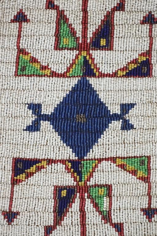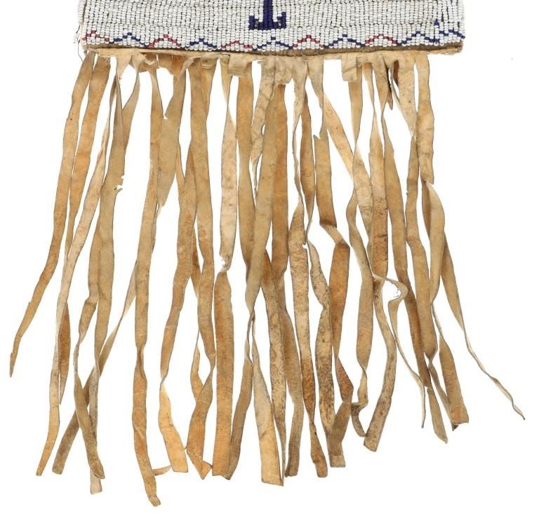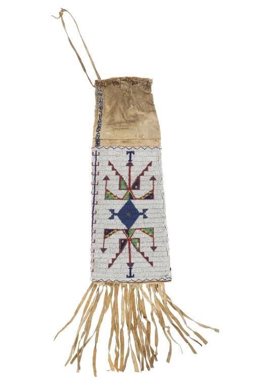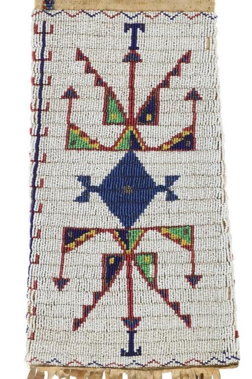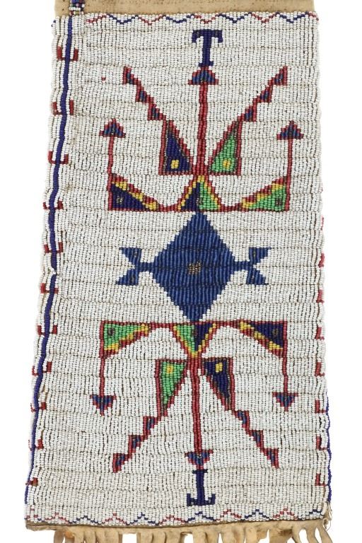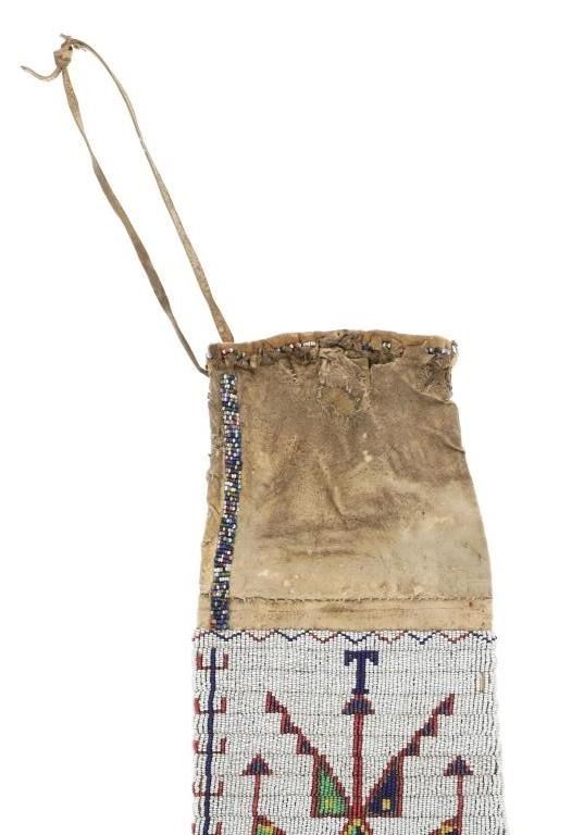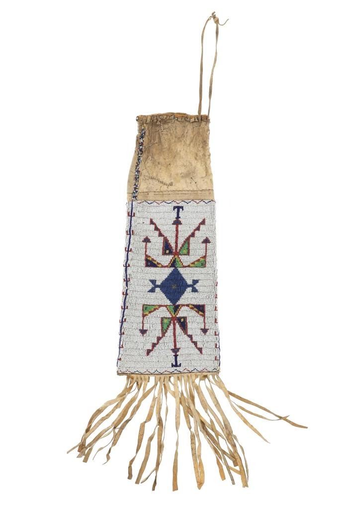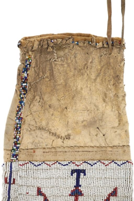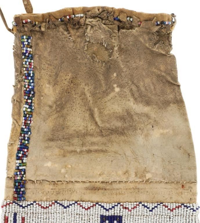 This is a fantastic 19th Century beaded Indian hide large pipe bag from the Sioux of the Northern Plains from the ex-Harrisburg Pennsylvania collection. The pipe bag has a large size with unusually large beadwork section comprised of sinew sewn Indian tanned hide and covered in period correct 1800's glass trade seed cen beads in a classic Sioux geometric pattern with Buffalo / Bison or Horse track design running up each outside edge. The beadwork is done along both sides and the outside as well as a small strip running up edge top section adn some beadwork framing the top section. There are several old Native American repairs ranging from sinew and Indian hide repairs to some trade thread repairs. The bottom edge has Indian tanned buckskin fringes secured with sinew. Most of the beadwork is present with some very slight loss. The top belt strap is still attached. Provenance: Collected by former Harrisburg, Pa., Mayor Stephen Reed from the University of Pennsylvania archives to be displayed in the Museum of the West housed by the Pennsylvania government. Eventually the items were "deaccessioned" or sold at auction in 2013 with this being one of those pieces. The has some stiffened hides with some old Native repairs but mainly is well kept. Measures overall 25"L with an additional 8" strap by about 7"W.