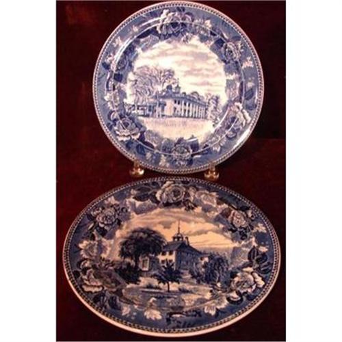 Ciorca 1890-1900 Two English Blue and White American Historical Transfer Plates measuring 9 1/4" in diameter. These plates were made by Wedgwood. One of these plates is of Mount Vernon, The Home of George Washington, Erected in 1780 and the other plate is the OLD MEETING HOUSE, Hingham, Mass. Erected in 1681. Both of these blue and white historical plates are in Good Condition and the name WEDGEWOOD is impressed on the back of the plates with the sole importer boston mark.