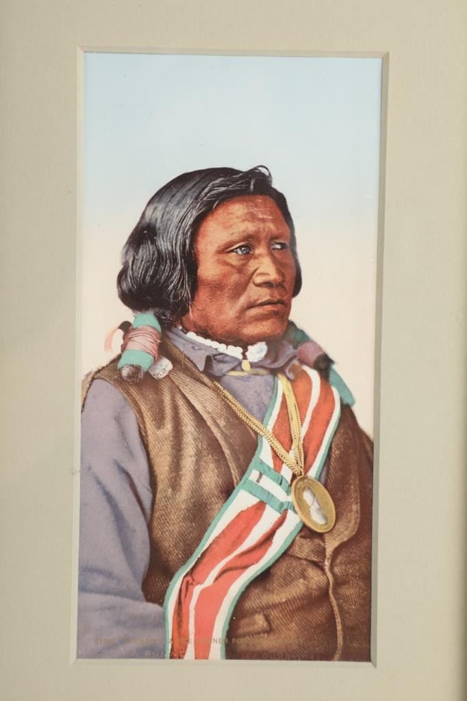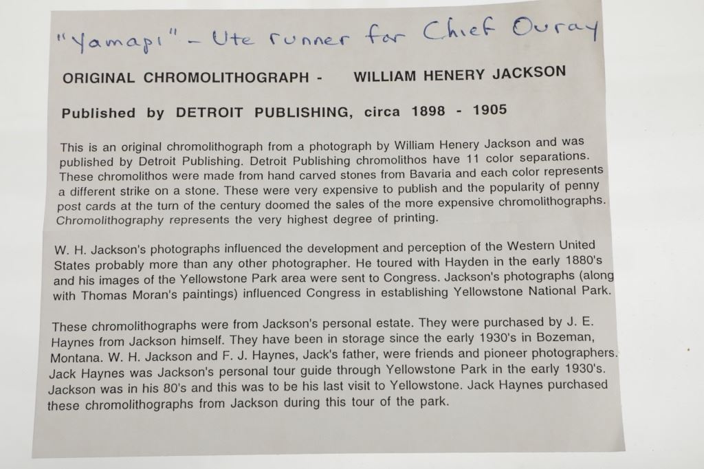This is an original scarce William Henry Jackson photograph chromolithograph of “Yamapi” A Runner for Chief Ouray, a Native American chief of the Tabeguache "Uncompahgre" band of the Ute tribe of western Colorado, circa 1880. Published by Detroit Publishing whose chromolithos have 11 color separations. These chromolithos were made from hand carved stones from Bavaria and each color represents a different strike on a stone. Chromolithography represents the very highest degree of printing. W. H. Jackson's photographs influenced the development and perception of the Western United States probably more than any other photographer. He toured with Hayden in the early 1880s and his images of the Yellowstone Park area were sent to Congress. Jackson's photographs, along with Thomas Moran's paintings, influenced Congress in establishing Yellowstone National Park.