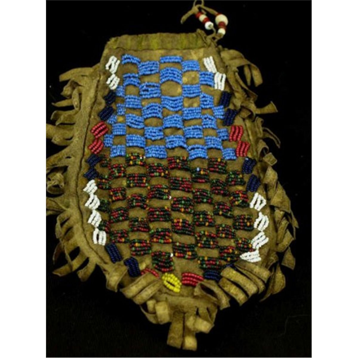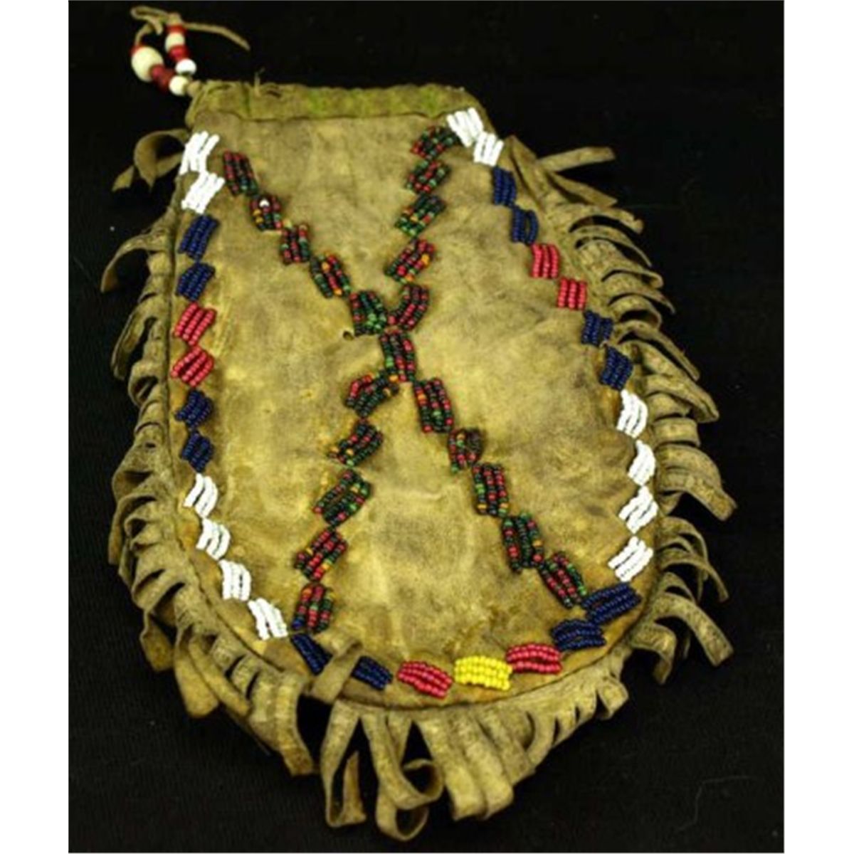 C. 1880's Sioux bag check board design to front the reverse with diagonal X pattern, drawstring top trimmed in yellow cloth, outside fringed edge, 8" overall length.