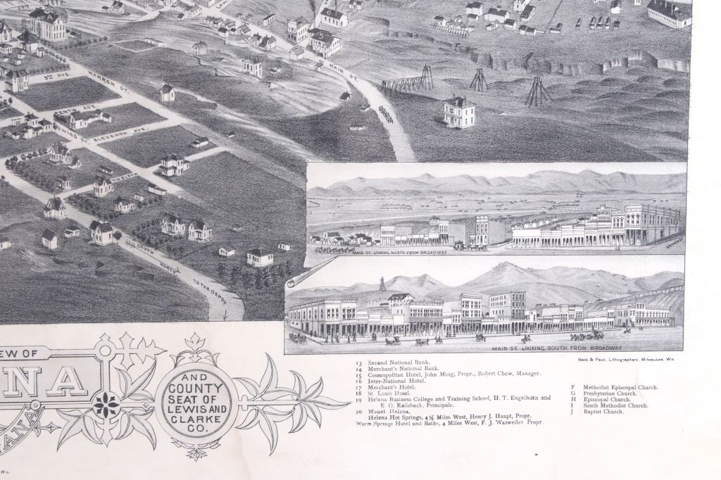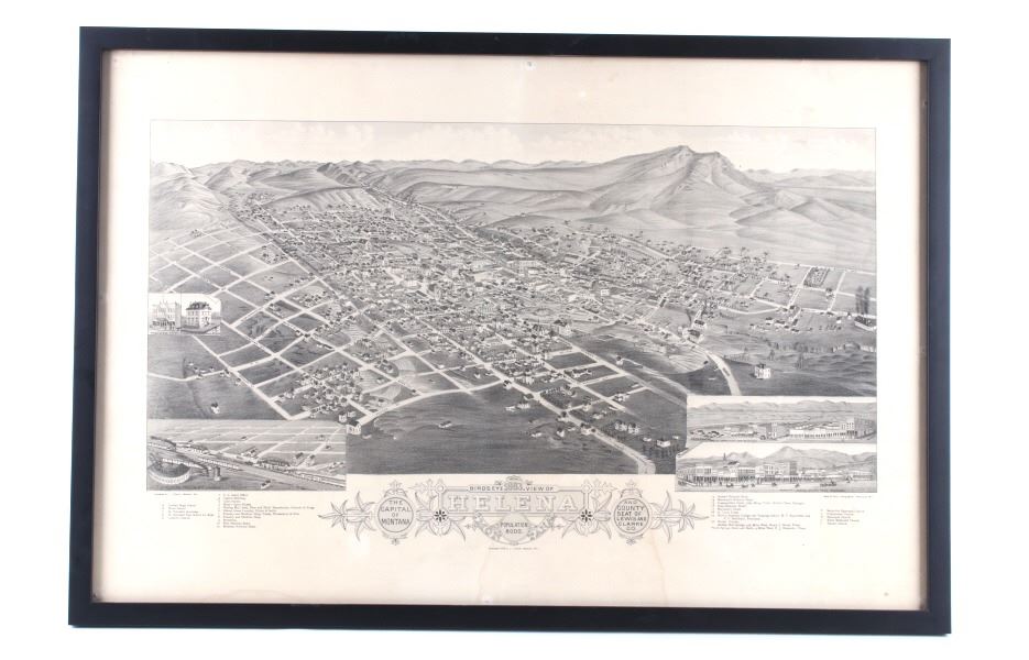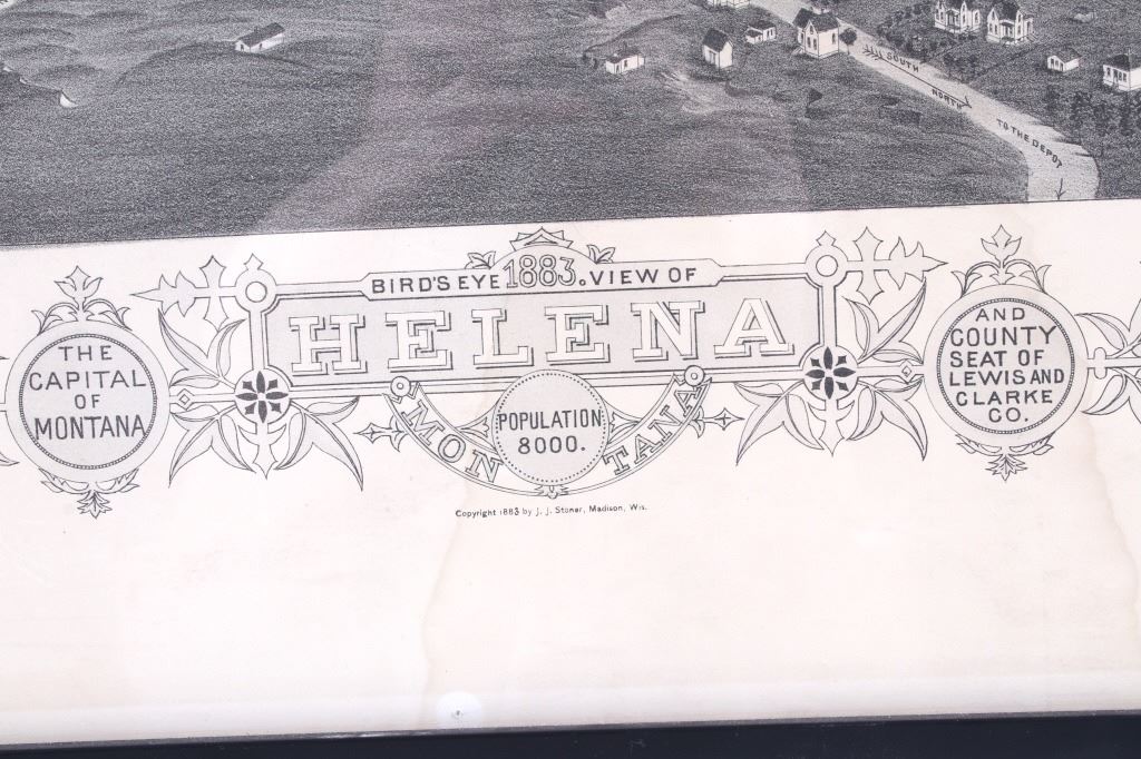 This is an original circa 1883 Birds Eye View of Helena, Montana Territory map by J.J. Stoner. This original, authentic example is very uncommon, dating to the Territory days of Montana with very few of the larger examples in such well preserved condition still remaining. The map shows a perspective map of Helena, Montana which is the Capital of Montana Territory. Marked bottom middle, “Copyright 1883 J. J. Stoner, Madison, Wis.” and bottom left, “Published by J. J. Stoner, Madison, Wis.” as well as on the right-side bottom, “Beck & Paul, Lithographers, Milwaukee, Wis.” The map has a large Helena banner which note “The Capitol of Montana and County Seat of Lewis and Clarke Co.” as well as a key on the bottom left and right. These maps are also referred to as aerial maps, perspective maps, birdseye maps, birds eye maps, panoramic maps. The only other example dating to circa 1883 which pre-dated Montana’s Statehood was the 1883 Helena Birds Eye by J.J. Stoner which was smaller at 16”H by 27”W sold at Millea Bros in 2017 for $1,375. This original example is well kept with only a small water stain on the bottom portion and has been professionally framed for preservation. The frame measures 31.25” by 21.25” and the visible art area is about 29.5” by 19.75”. One of the better Montana Perspective View Maps.