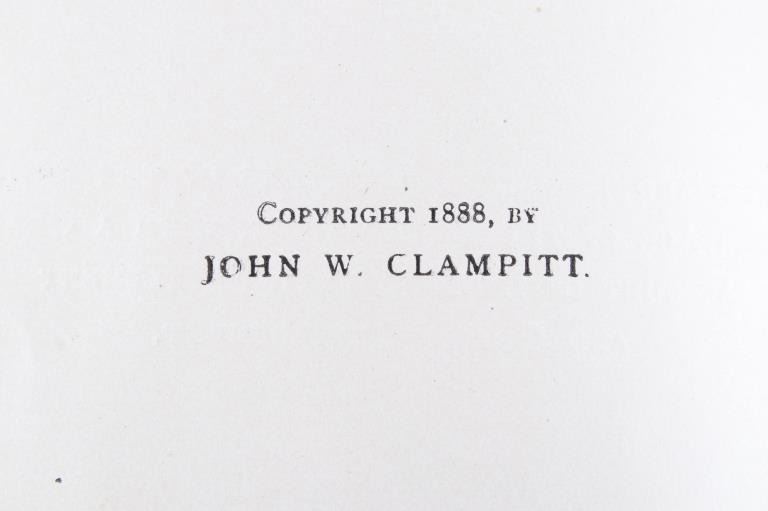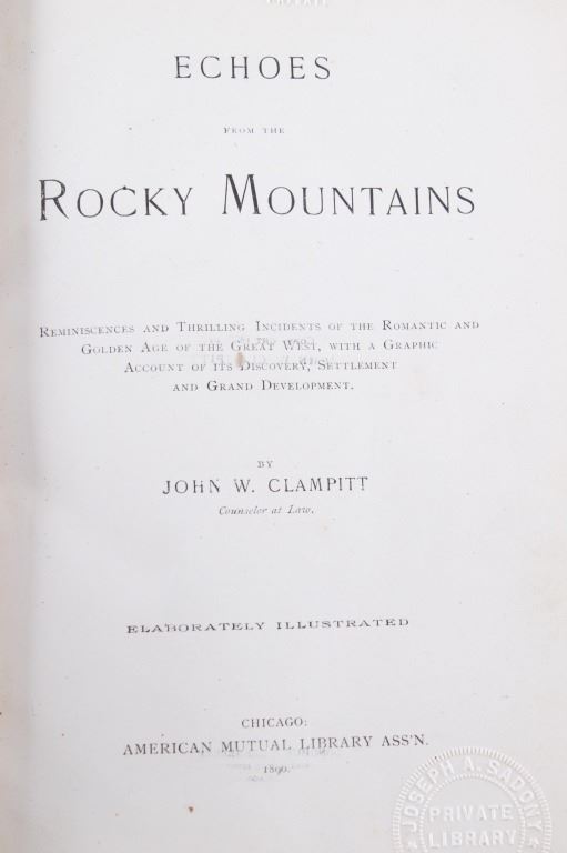 Included in this lot is a first edition hardcover of “Echoes from the Rocky Mountains” by John W. Clampitt (1839-1906). The full title reads, "Echoes from the Rocky Mountains: Reminiscences and Thrilling Incidents of the Romantic and Golden Age of the Great West, with a graphic account of its discovery, settlement, and grand development". The book was published in 1889 and contains over 100 black and white illustrations. The book features accounts and stories from a wide array of sources. The piece covers topics such as Yellowstone, Yosemite, and the Pony Express, along with many others. The book shows fair condition for its age, with wear across the cover. The spine of the book is covered with leather. The book measures 9 3/4" tall by 7" wide and 2 1/4" thick.