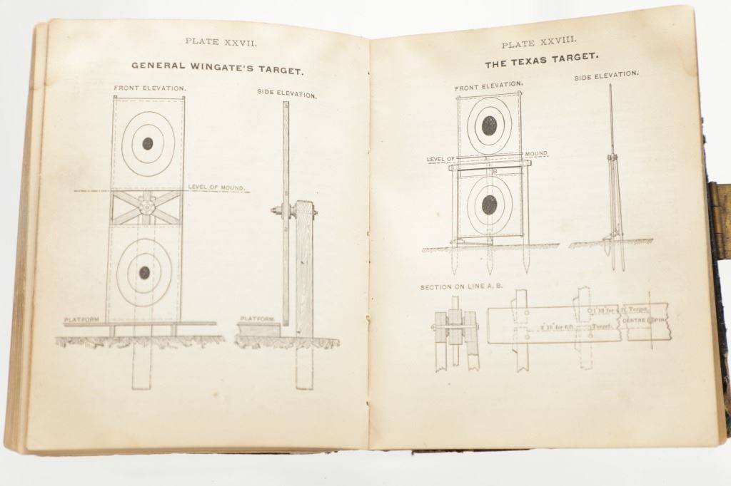 Featured in this lot is the rare book, "Small Arms Firing Regulations", by Captain Stanhope E. Blunt, 1889. "By Authority Firing Regulations For Small Arms For The United States Army Prepared By Command Of Brigadier-General S. V. Benet Chief Of Ordnance, U. S. Army By Captain Stanhope E. Blunt, Ordnance Department Inspector Of Small Arms Practice at the Headquarters of the Army Third Edition New York Charles Scribner's Son's 1889". 368 pages and illustrated with line drawings, it contains just about everything you'd ever want to know about target practice with the US Model 1873, 1884, and 1888 Trapdoor Springfield Rifles in 45-70. This book is in overall good condition, has a brass clasp closure. The blue cloth boundgold gilt embossed cover shows some scuffing, some of the front matter pages have tears, remainder of the pages appear intact, foxing noted throughout. Measures 3.5"W x 4.75"L x .75"D