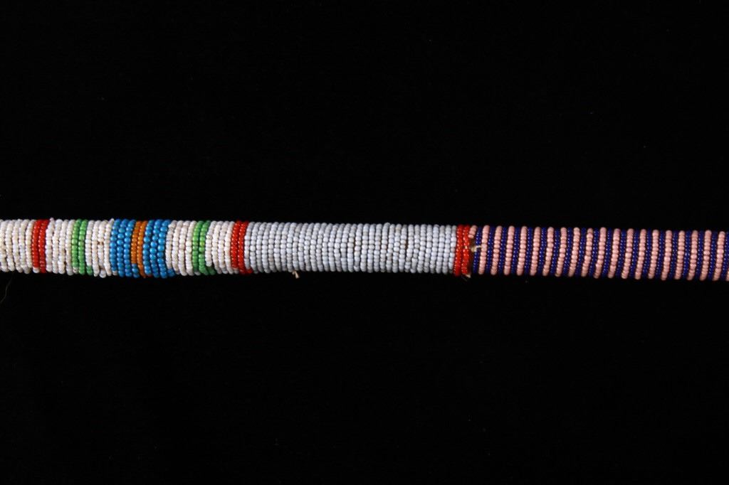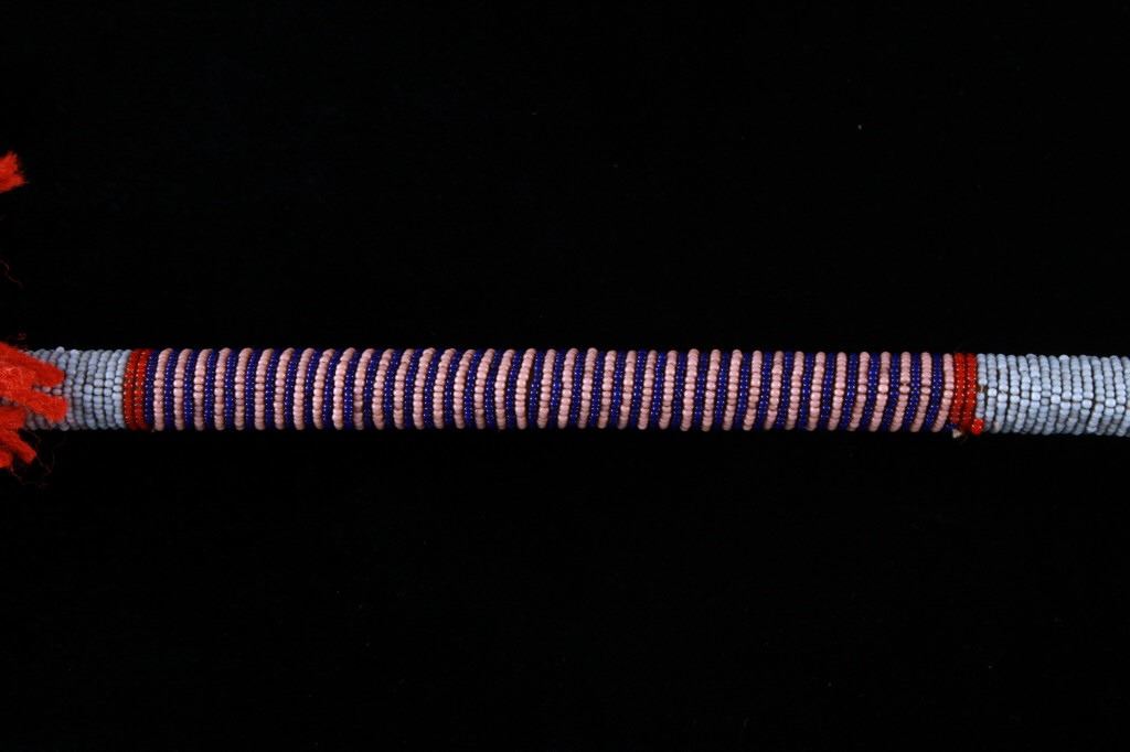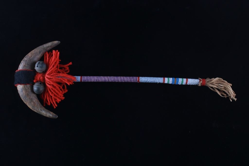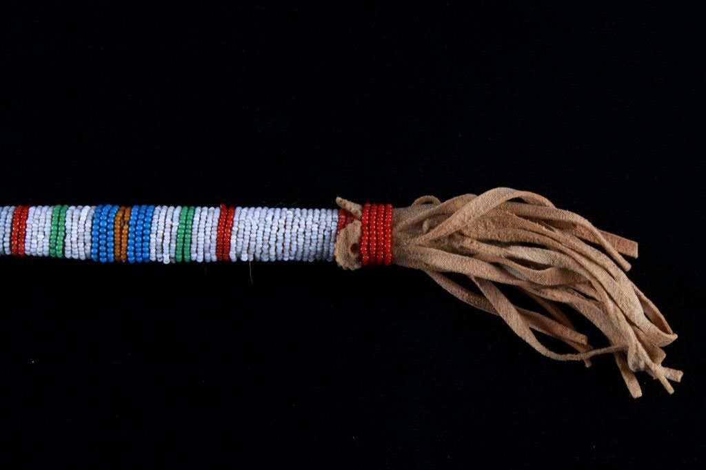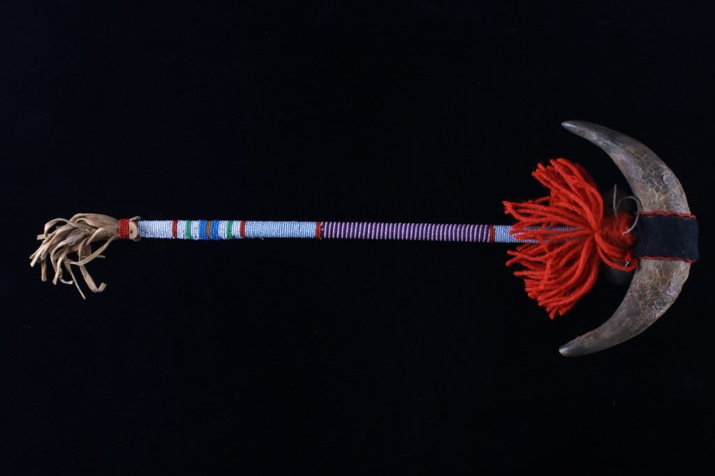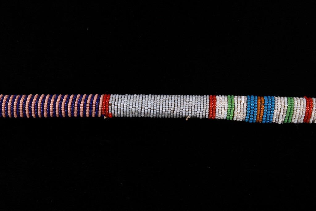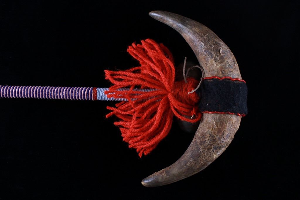 The lot features a Buffalo Bison horn beaded dance club from the Sioux Indians of the circa late 1890 to early 1900's. The piece shows a wood haft handle that is covered in Indian tanned hide which is then further covered in early 1900's glass trade seed beads in a geometric banded beadwork pattern. At the top shows two downward turned Great American Bison Buffalo horns held onto the club with a wrapping of wool and hide with red white heart glass trade seed beaded edge. Below the buffalo horn top is a wrapping of red Germantown wool yarn and two 19th Century solid brass trade bells. The beadwork shows colors of light blue, red white heart, Cheyenne greasy pink, cobalt, greasy yellow, light green, and medium blue. The bottom of the club has scallop cut edge Indian tanned hide fringes. The piece dates to the turn of the century and is well preserved with nice supple hides and little to no bead loss. Provenance: From a large Cowboy Western and Native American collection in Iowa. Measures overall 23"L by 8"W by 2.25"D.