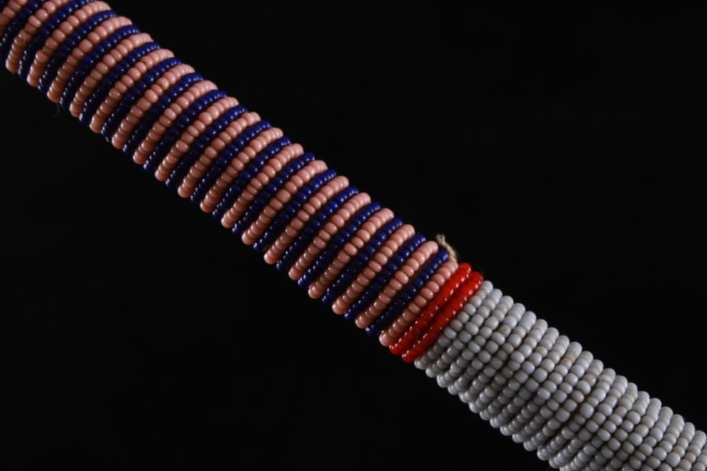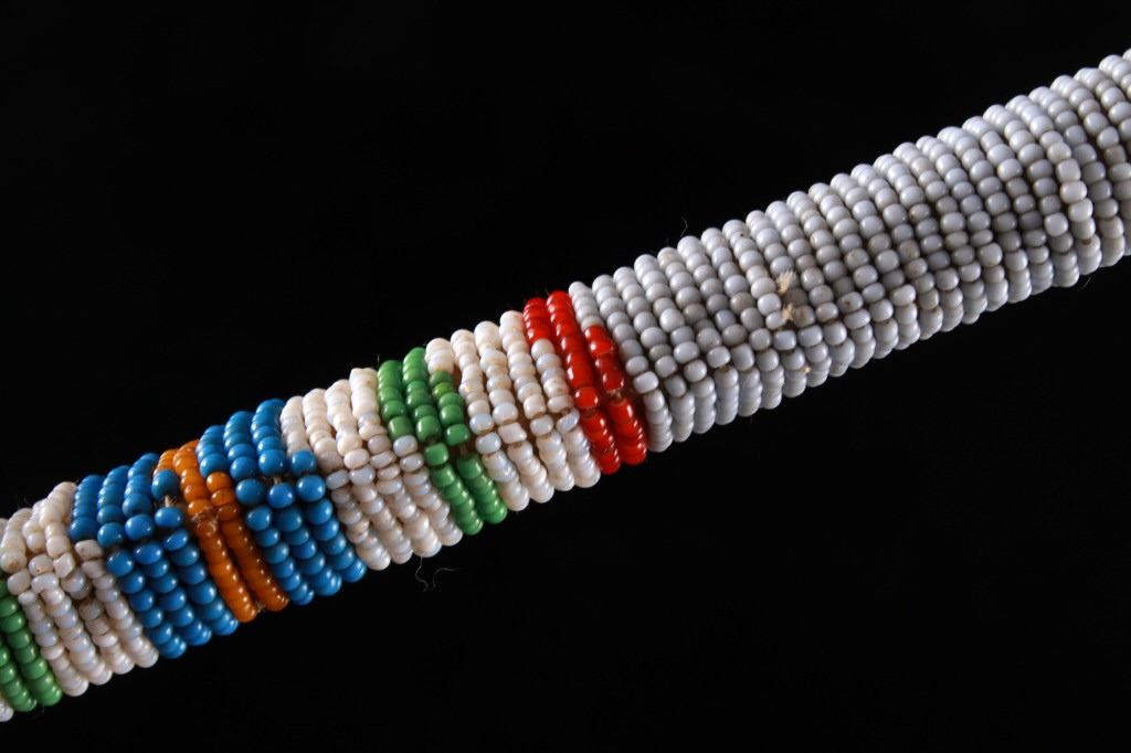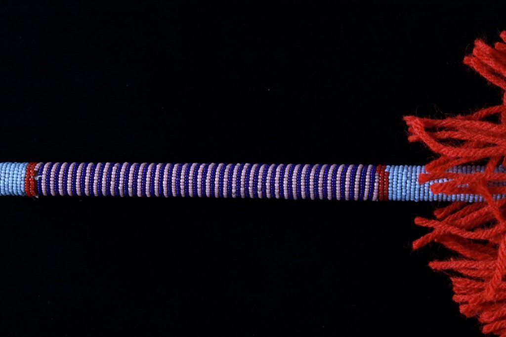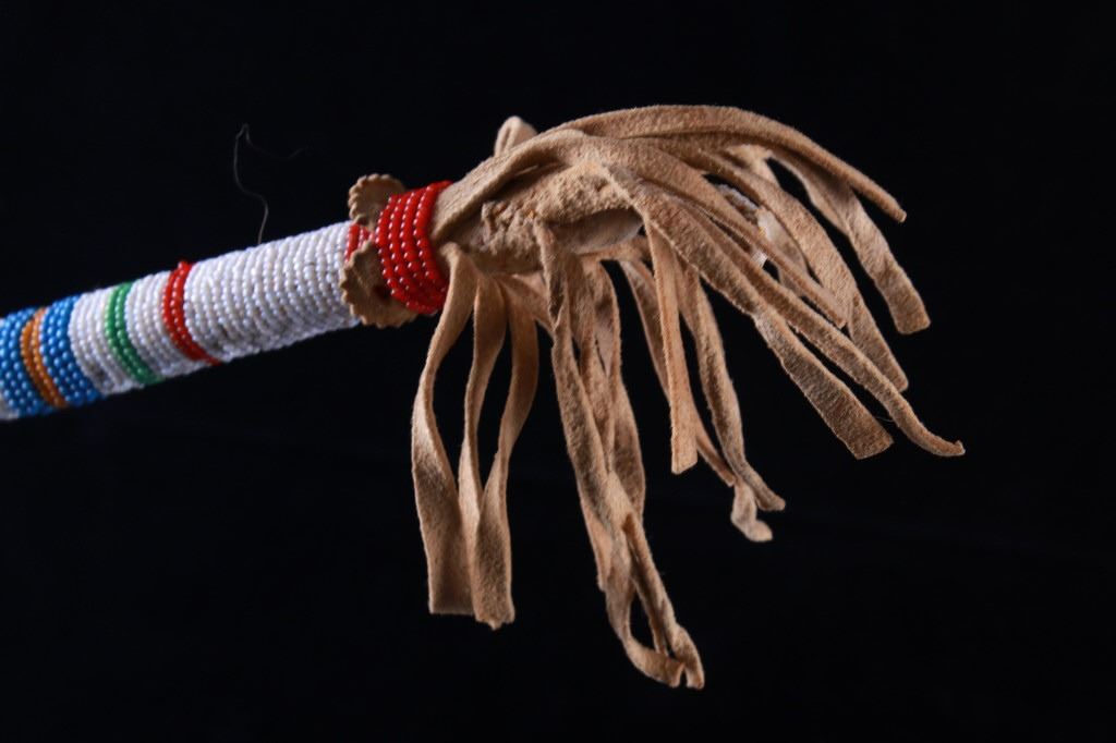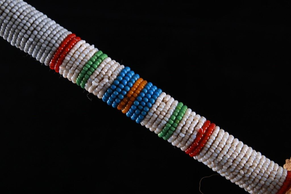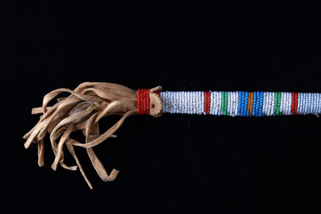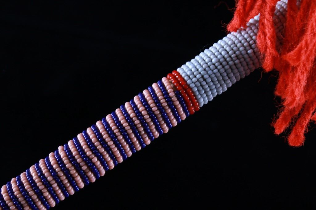 The lot features a Buffalo Bison horn beaded dance club from the Sioux Indians of the circa late 1890 to early 1900's. The piece shows a wood haft handle that is covered in Indian tanned hide which is then further covered in early 1900's glass trade seed beads in a geometric banded beadwork pattern. At the top shows two downward turned Great American Bison Buffalo horns held onto the club with a wrapping of wool and hide with red white heart glass trade seed beaded edge. Below the buffalo horn top is a wrapping of red Germantown wool yarn and two 19th Century solid brass trade bells. The beadwork shows colors of light blue, red white heart, Cheyenne greasy pink, cobalt, greasy yellow, light green, and medium blue. The bottom of the club has scallop cut edge Indian tanned hide fringes. The piece dates to the turn of the century and is well preserved with nice supple hides and little to no bead loss. Provenance: From a large Cowboy Western and Native American collection in Iowa. Measures overall 23"L by 8"W by 2.25"D.