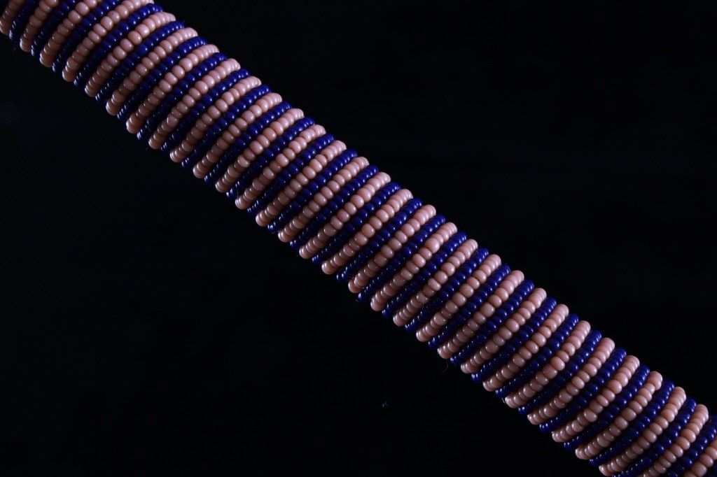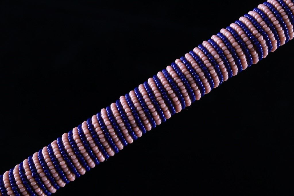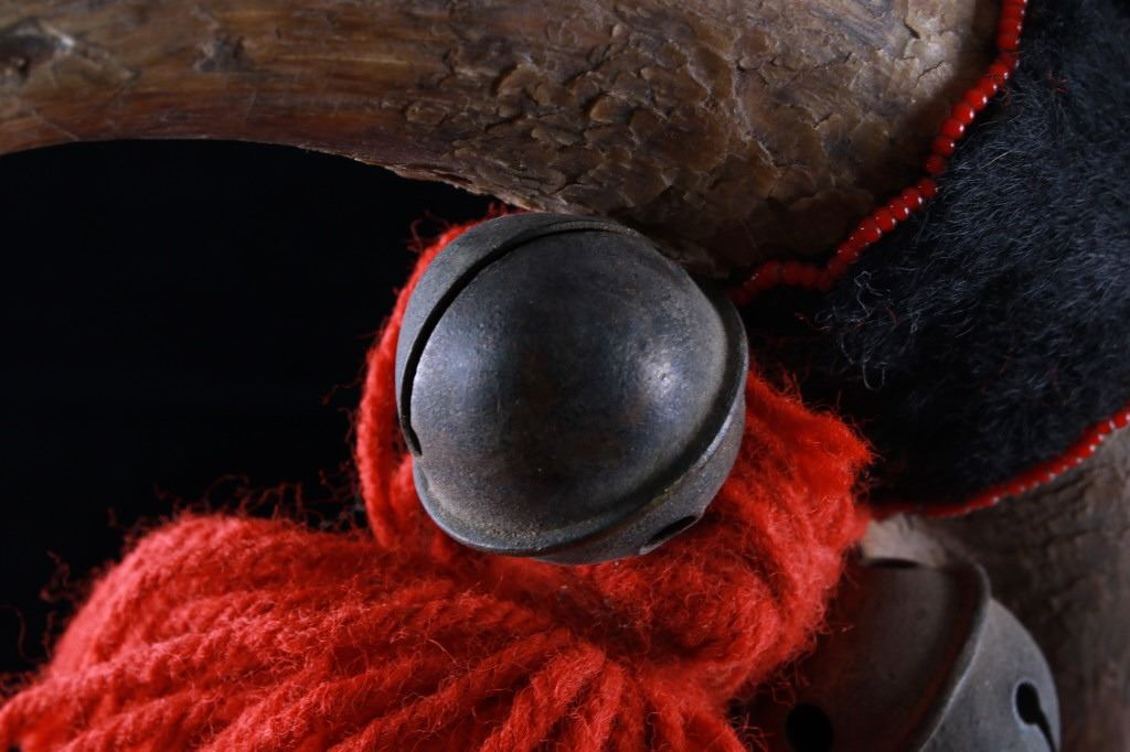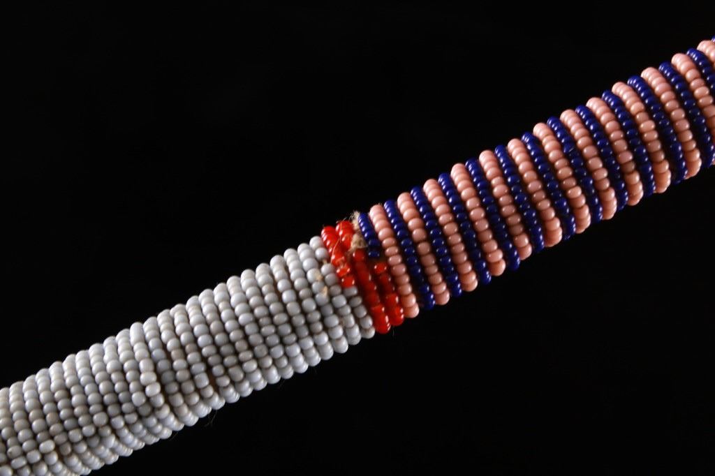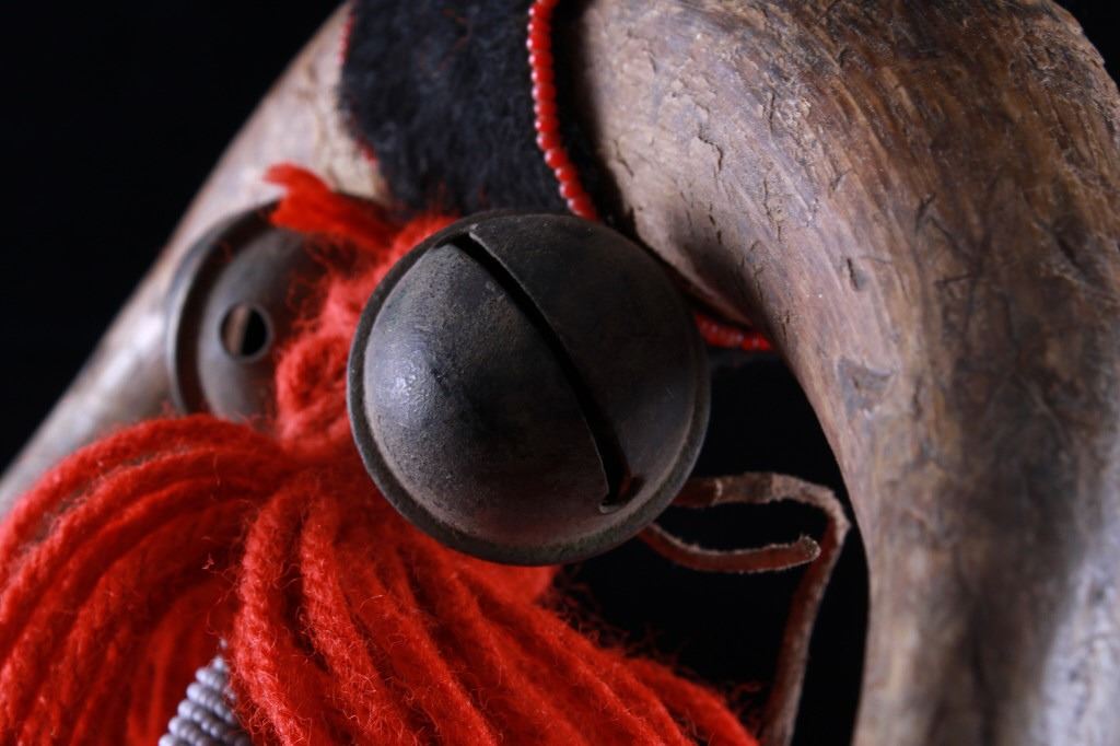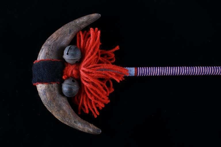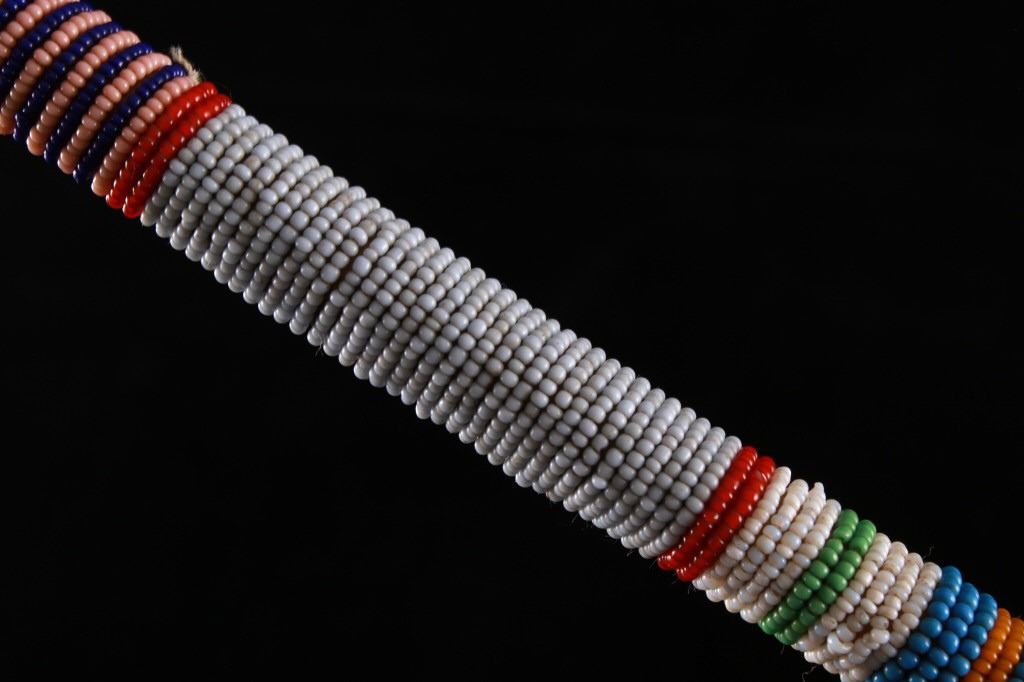 The lot features a Buffalo Bison horn beaded dance club from the Sioux Indians of the circa late 1890 to early 1900's. The piece shows a wood haft handle that is covered in Indian tanned hide which is then further covered in early 1900's glass trade seed beads in a geometric banded beadwork pattern. At the top shows two downward turned Great American Bison Buffalo horns held onto the club with a wrapping of wool and hide with red white heart glass trade seed beaded edge. Below the buffalo horn top is a wrapping of red Germantown wool yarn and two 19th Century solid brass trade bells. The beadwork shows colors of light blue, red white heart, Cheyenne greasy pink, cobalt, greasy yellow, light green, and medium blue. The bottom of the club has scallop cut edge Indian tanned hide fringes. The piece dates to the turn of the century and is well preserved with nice supple hides and little to no bead loss. Provenance: From a large Cowboy Western and Native American collection in Iowa. Measures overall 23"L by 8"W by 2.25"D.
