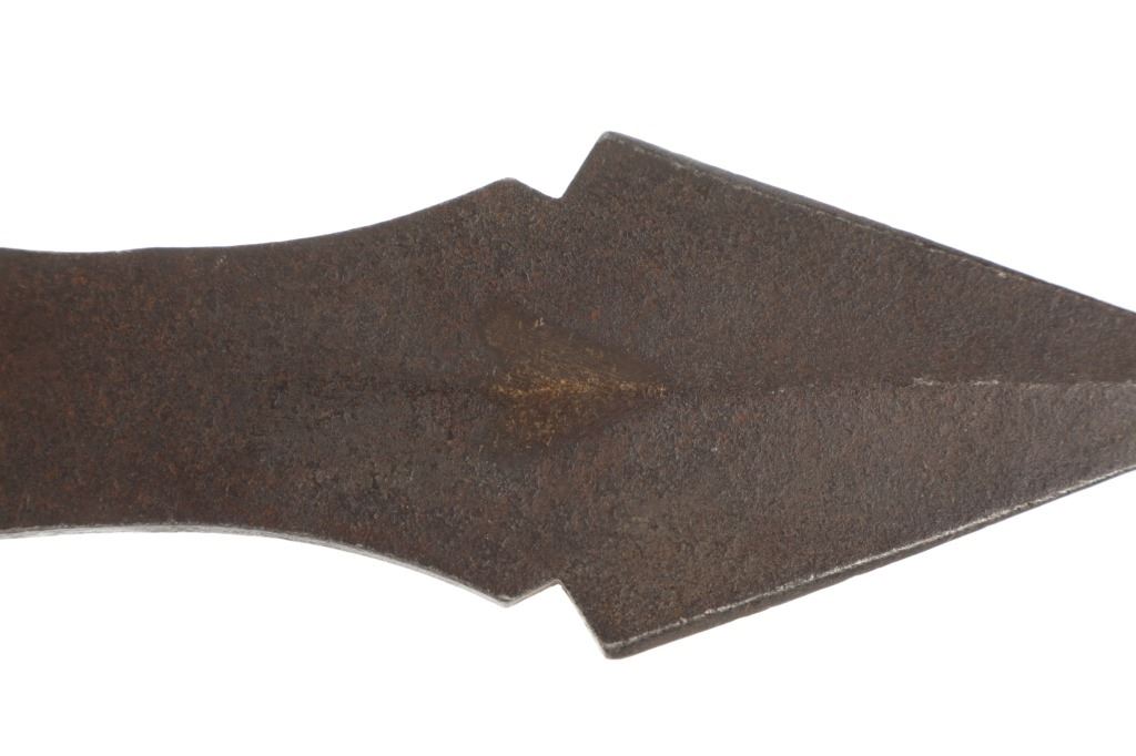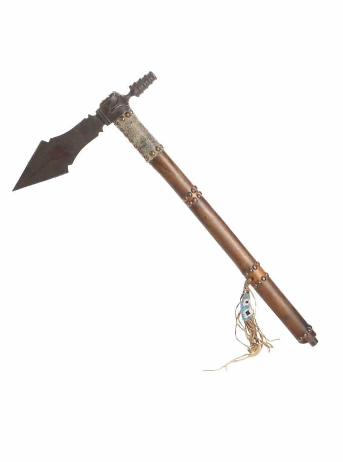 The lot features a circa 1890’s to early 1900’s Indian Reservation period spontoon pipe tomahawk. The piece shows an iron head with copper-inlaid heart at the center on both sides with the head being in a stylized spontoon shape. The piece has a tear drop eyelet hole with tall cast beehive vase like tapering bowl, stylized moldings, spike like spurs just below the filed ridges and stylized spontoon blade without basal processes. The old head is paired with an Indian Reservation period later solid ash wood haft which is accented with brass trade tacks, old-tanned leather hide, dyed or painted bands, bands of brass trade tacks and a pierced hole which holds a beadwork drop. The beaded drop is constructed of Indian tanned hide with glass trade beads in a square tab geometric pattern with colors of light blue, chalk white and black having long Indian hide fringes and ties. Provenance: From the ex-collection of Jim Bastian of Kansas City, Missouri. Measures overall 21”L without the drop with the head being 11.75”L from the pipe bowl to tip of blade.