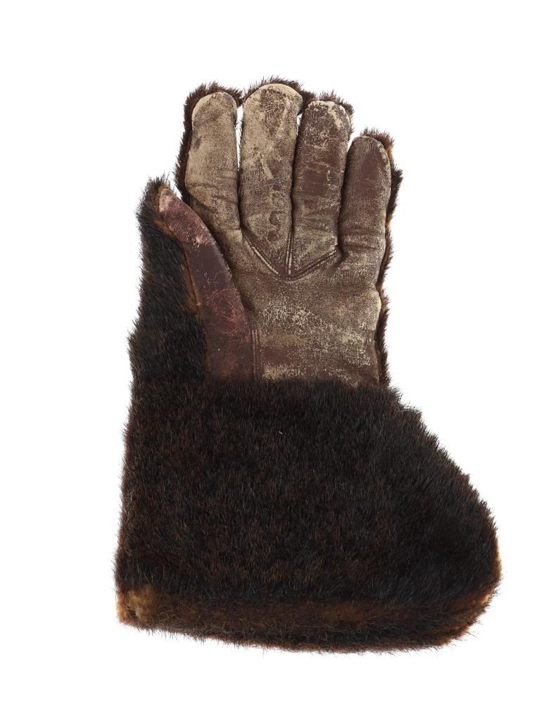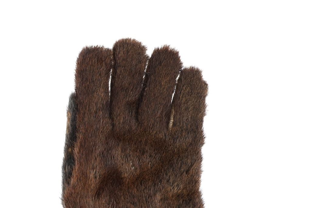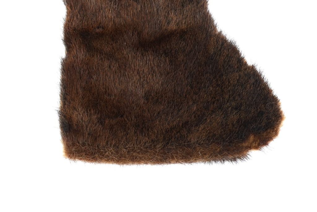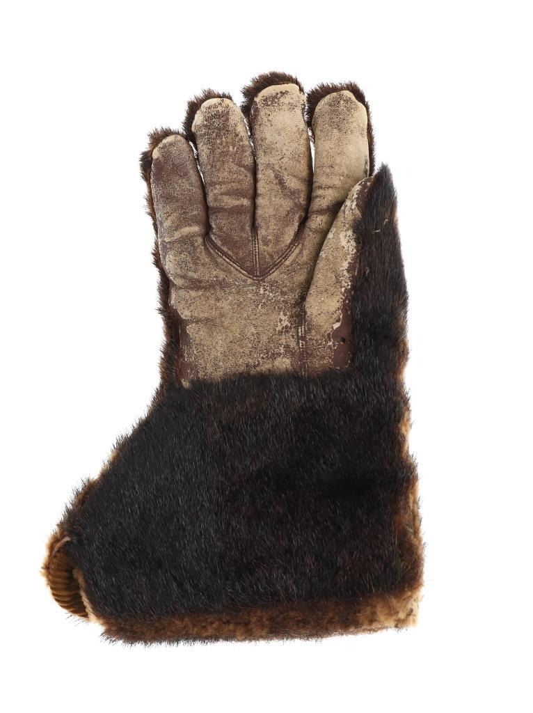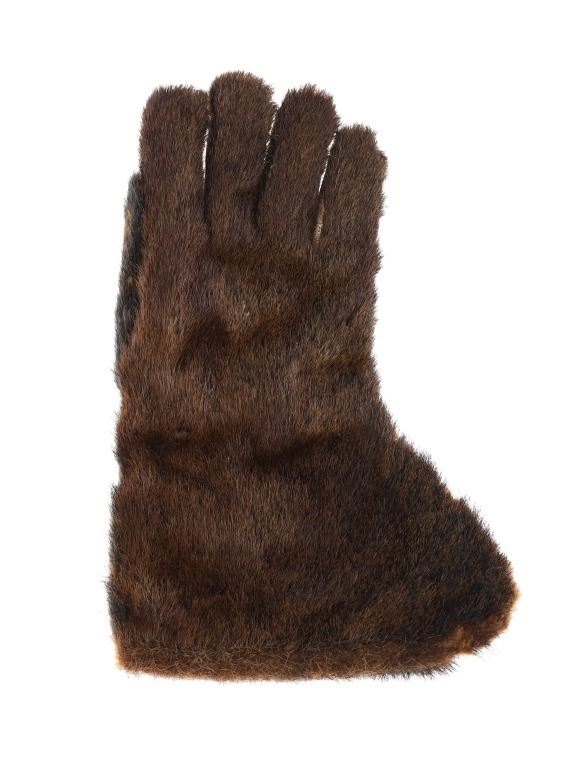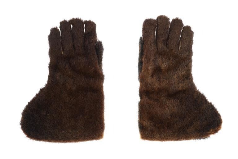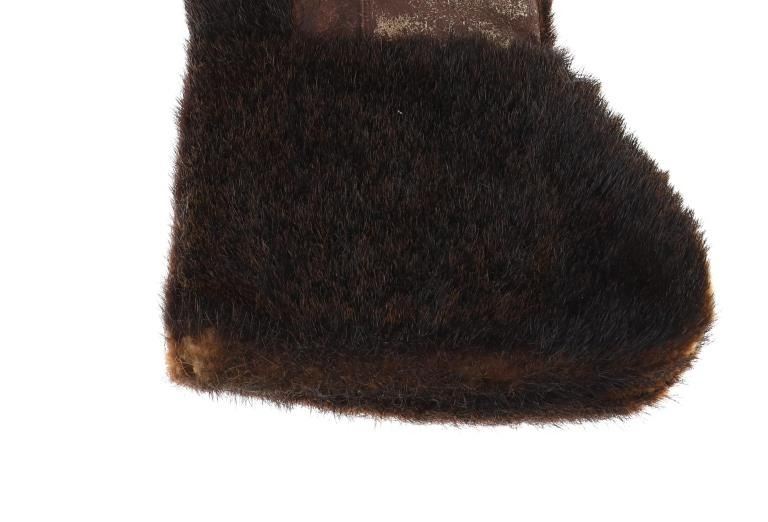 Featured in this lot is this circa 1890-1910 beaver stagecoach gauntlet gloves. The gauntlet gloves feature a wonderfully and professionally crafted beaver and leather construction. The beaver fur shows dark to light brown coloration and a light off white leather hands with all the fingers shown on the gauntlets. The condition of this pair of gauntlets shows coarse beaver fur with some wear to the leather hands of the gauntlets but otherwise is well preserved. The measurements of this pair of gauntlets is 13 1/4" x 8 3/4". The collective weight of these gauntlets is 12oz.