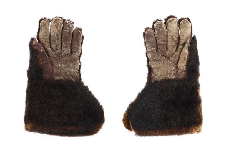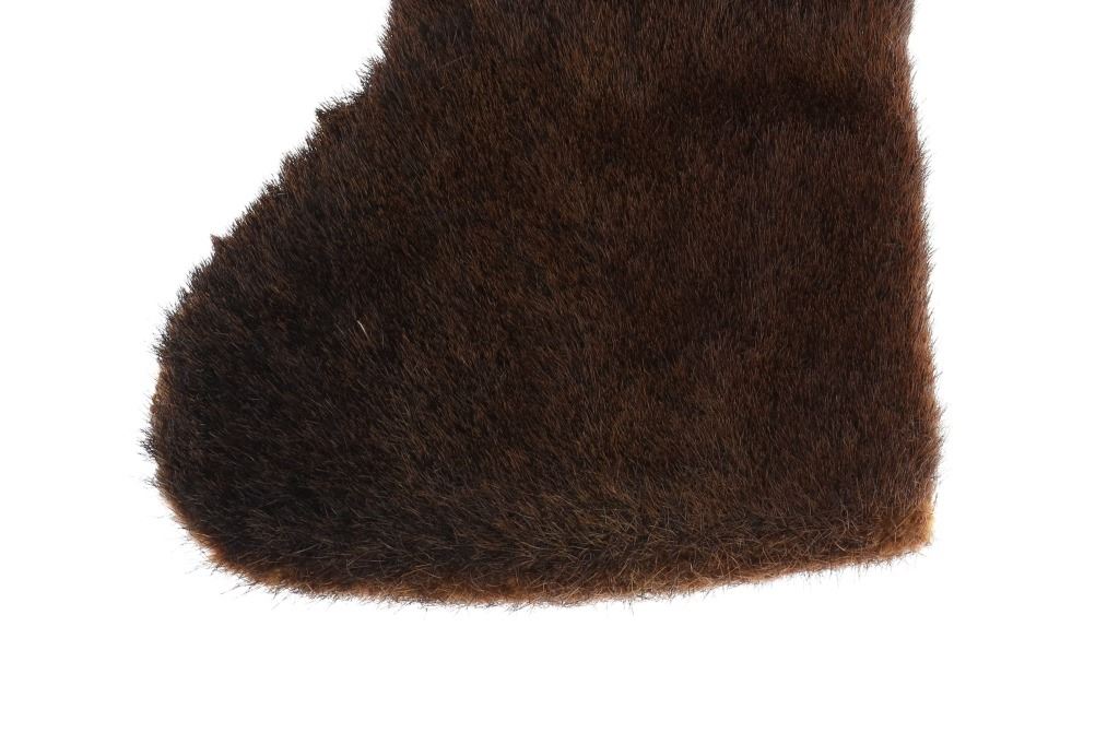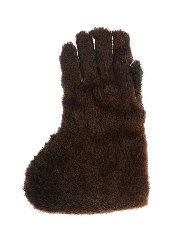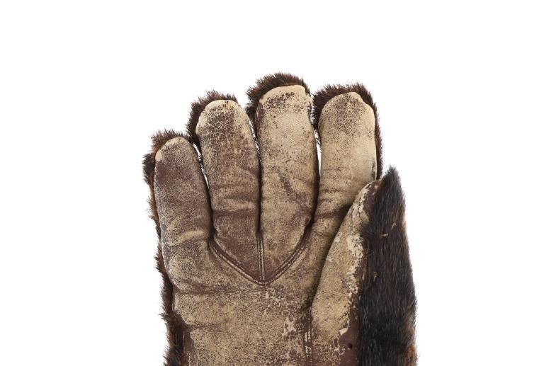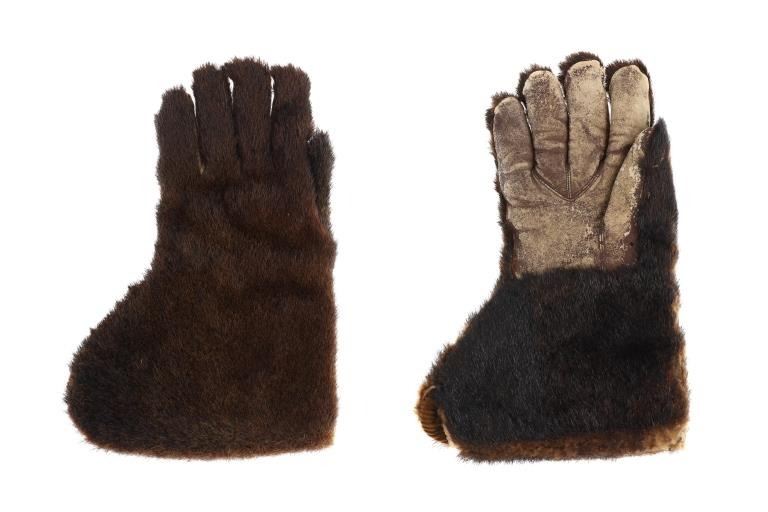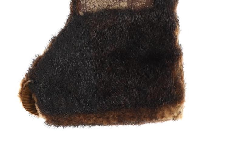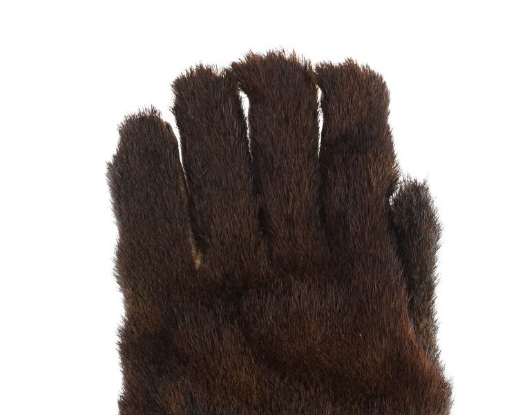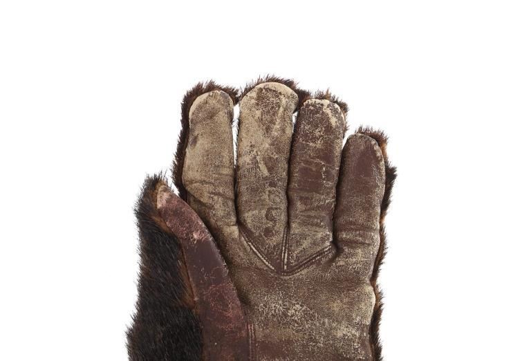 Featured in this lot is this circa 1890-1910 beaver stagecoach gauntlet gloves. The gauntlet gloves feature a wonderfully and professionally crafted beaver and leather construction. The beaver fur shows dark to light brown coloration and a light off white leather hands with all the fingers shown on the gauntlets. The condition of this pair of gauntlets shows coarse beaver fur with some wear to the leather hands of the gauntlets but otherwise is well preserved. The measurements of this pair of gauntlets is 13 1/4" x 8 3/4". The collective weight of these gauntlets is 12oz.