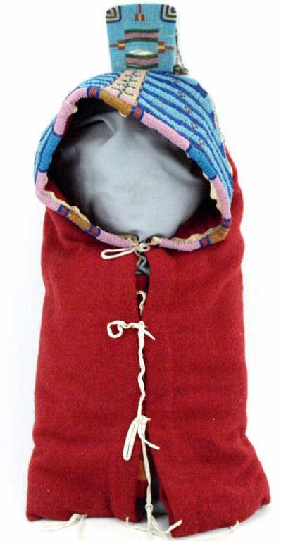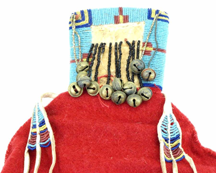 measuring 26" overall, sinew sewn beadwork on rawhide, brass hawk bells, restored red trade cloth body.