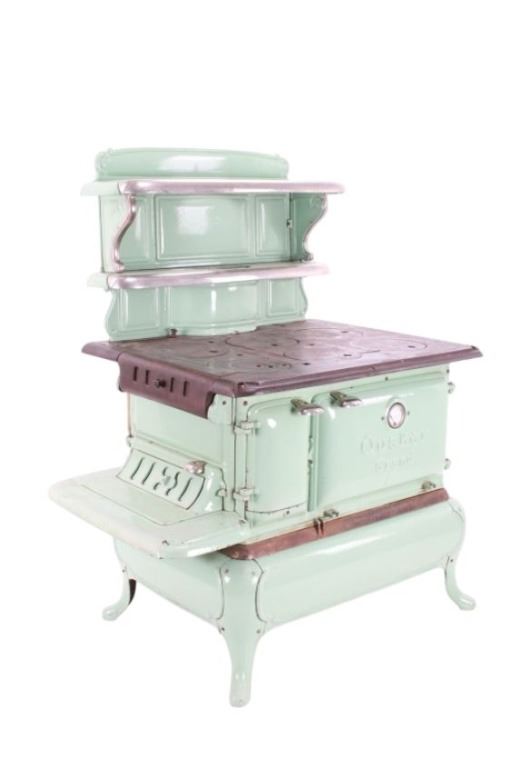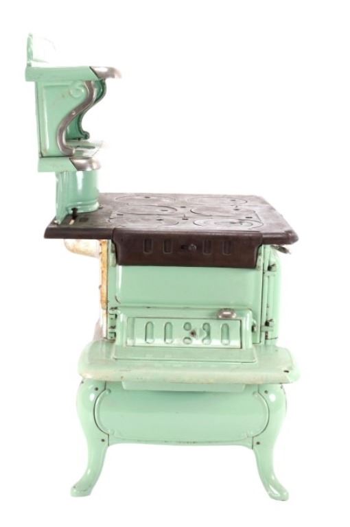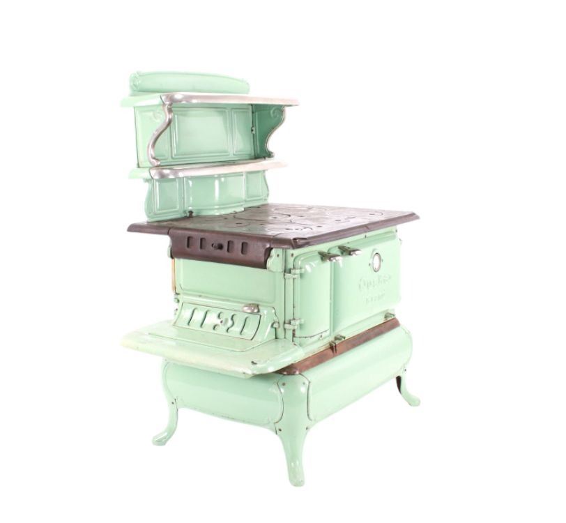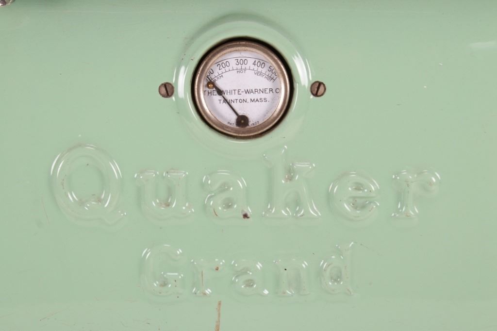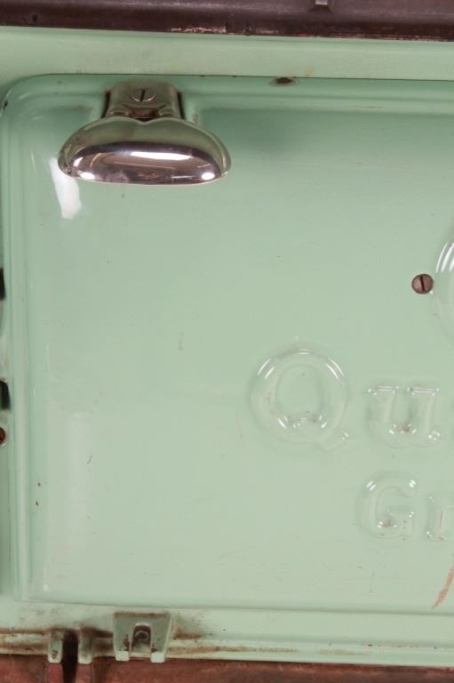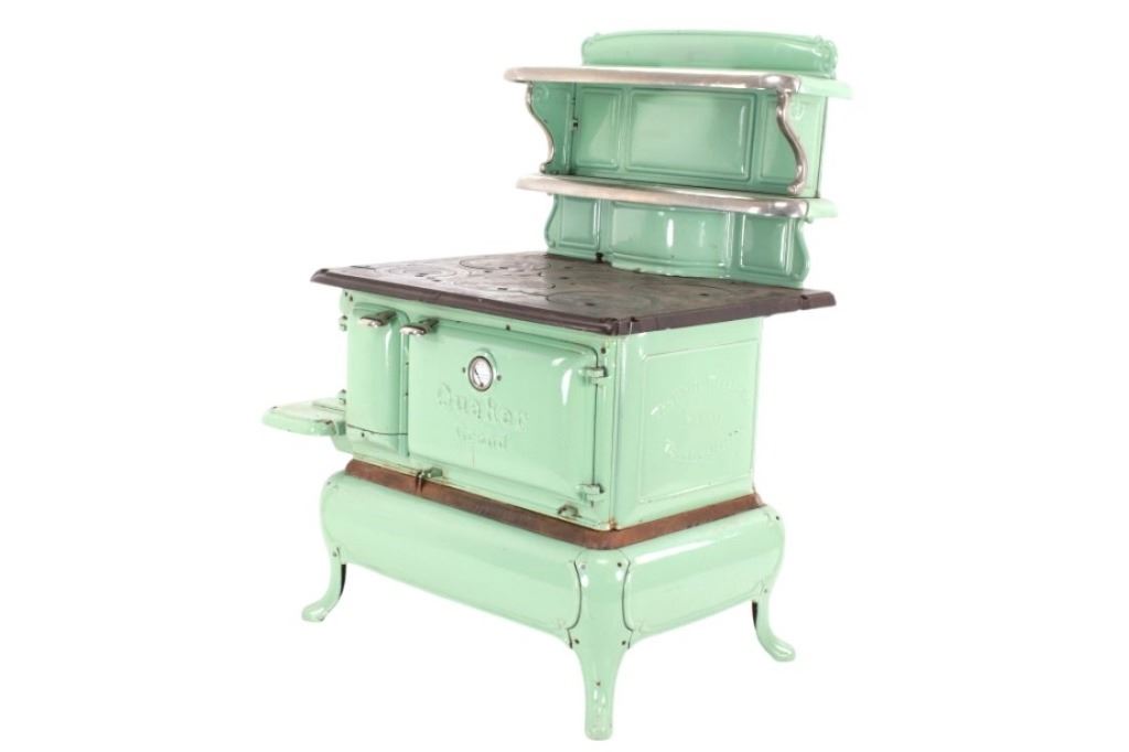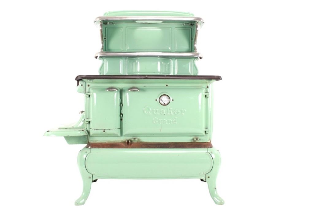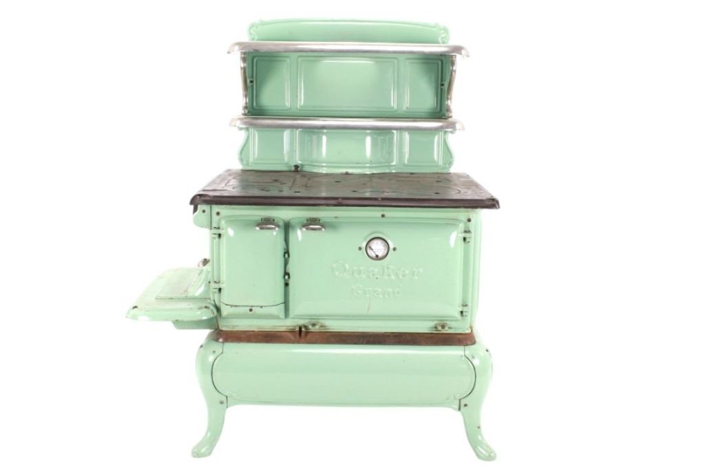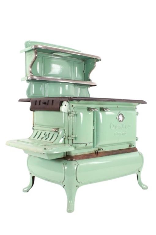 Featured in this lot is this White Warner Quaker Grand porcelain enamel cast iron stove circa 1890-1910 in a unique and rare original color. The stove features a wonderfully and professionally crafted cast iron and porcelain enamel construction that features six total stove top openings that are opened with a leveled tool and features a flute opening that is winded through two shelves. The stove is trimmed in cast iron trim with a nickel finish. The stove is marked as follows: Quaker Grand - The White-Warner Co Makers. Tauton, Mass. - Bake 8-272 Kindle - H Ideal 7&8 WW Co. 2546. This stove features multiple doors with the oven showing a temperature gauge on the front of the door with a kindling door next to it and a side vent on the left side of the stove. The condition of this of this stove is good with some wear to the to the cast iron and porcelain enamel but otherwise shows good overall condition. The measurements of this stove are 54 3/4" x 48" x 31 1/2".