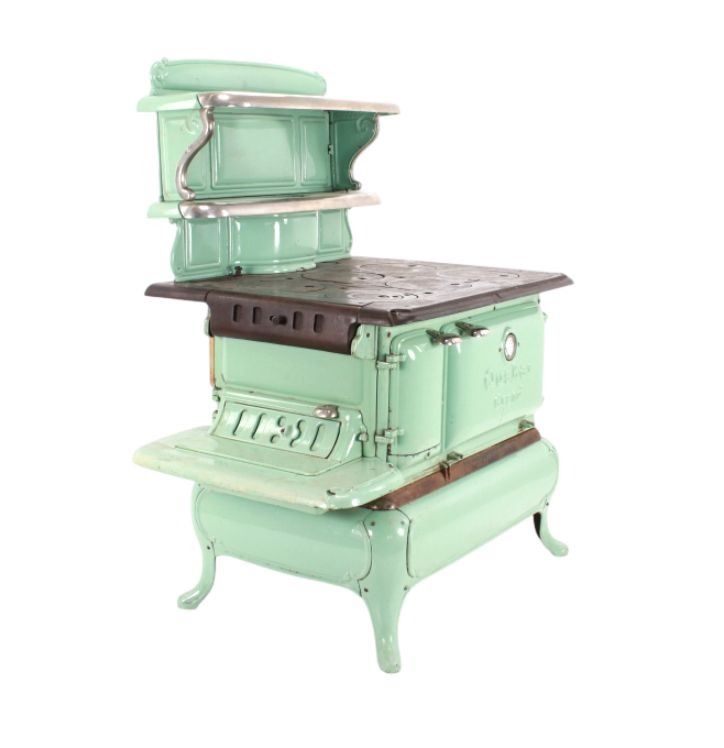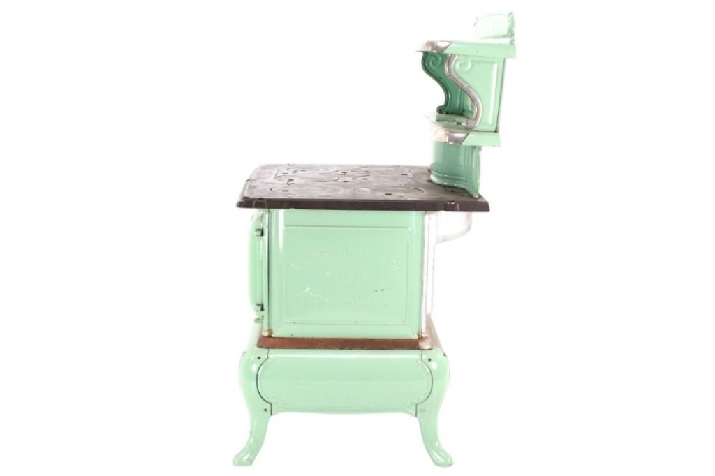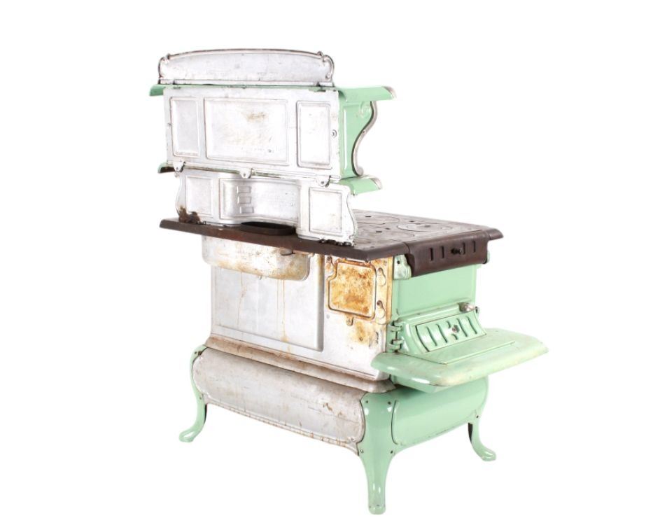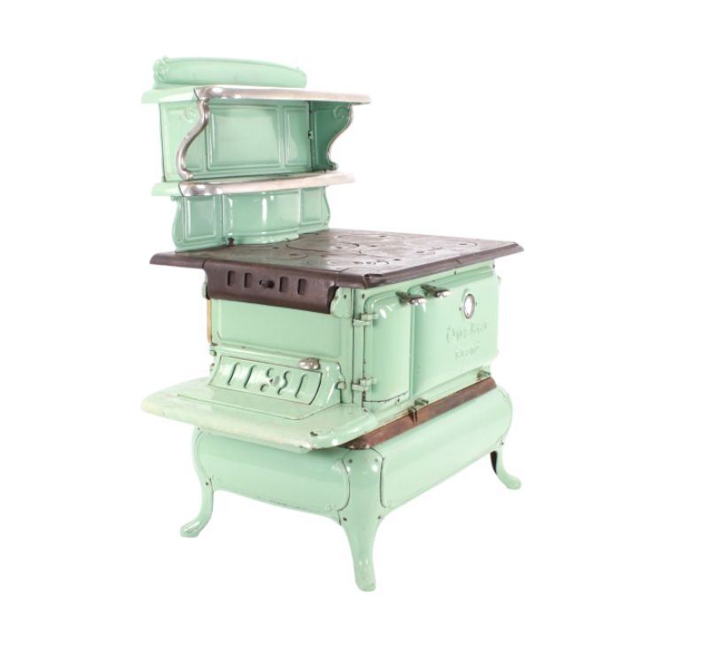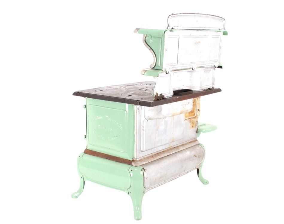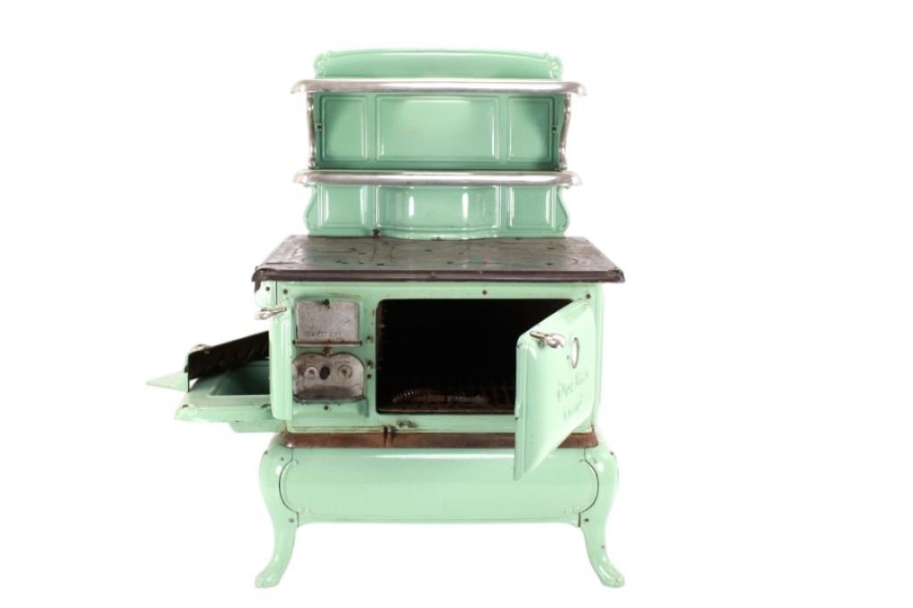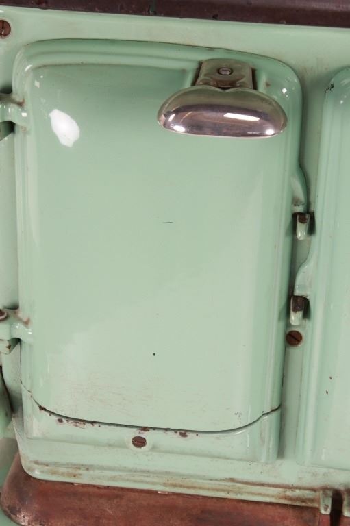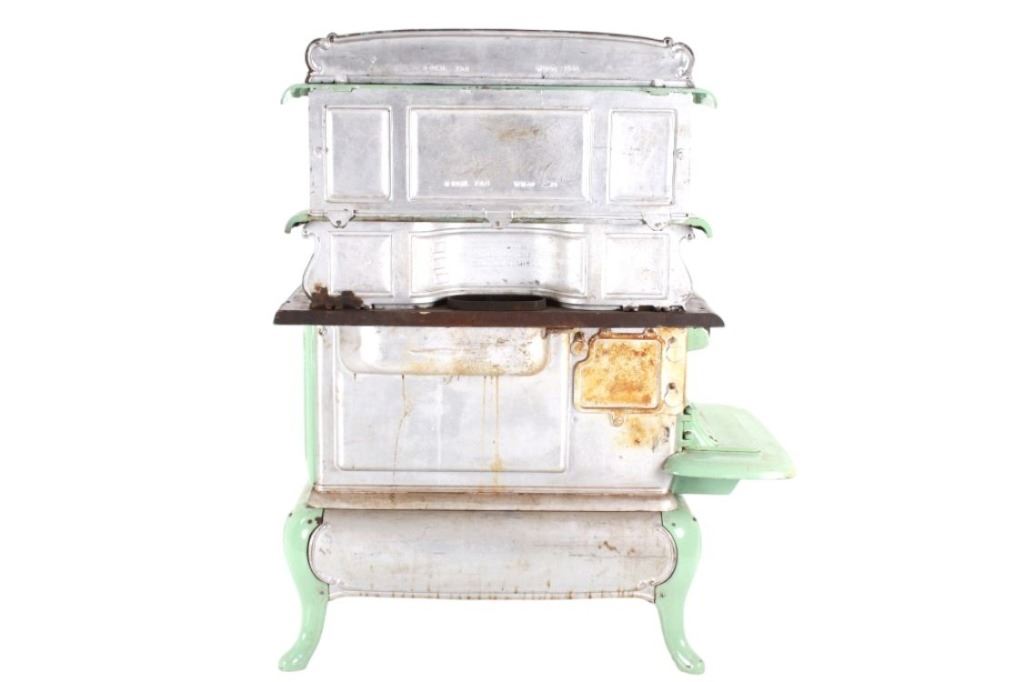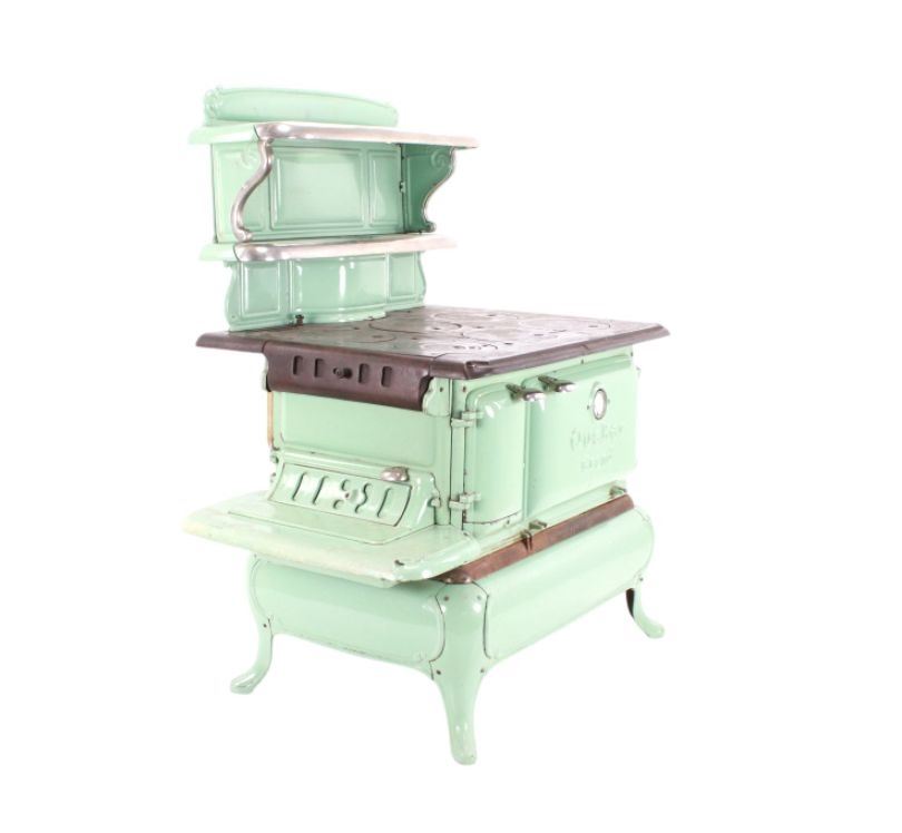 Featured in this lot is this White Warner Quaker Grand porcelain enamel cast iron stove circa 1890-1910 in a unique and rare original color. The stove features a wonderfully and professionally crafted cast iron and porcelain enamel construction that features six total stove top openings that are opened with a leveled tool and features a flute opening that is winded through two shelves. The stove is trimmed in cast iron trim with a nickel finish. The stove is marked as follows: Quaker Grand - The White-Warner Co Makers. Tauton, Mass. - Bake 8-272 Kindle - H Ideal 7&8 WW Co. 2546. This stove features multiple doors with the oven showing a temperature gauge on the front of the door with a kindling door next to it and a side vent on the left side of the stove. The condition of this of this stove is good with some wear to the to the cast iron and porcelain enamel but otherwise shows good overall condition. The measurements of this stove are 54 3/4" x 48" x 31 1/2".