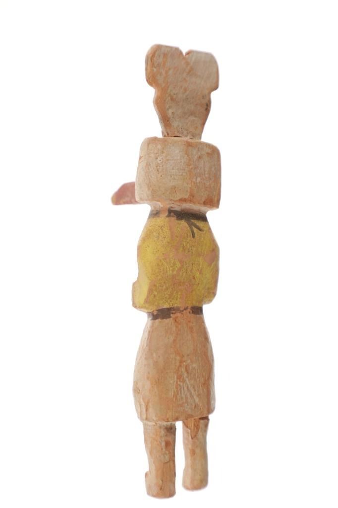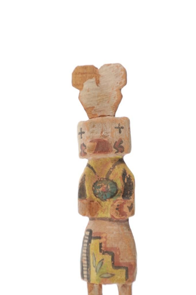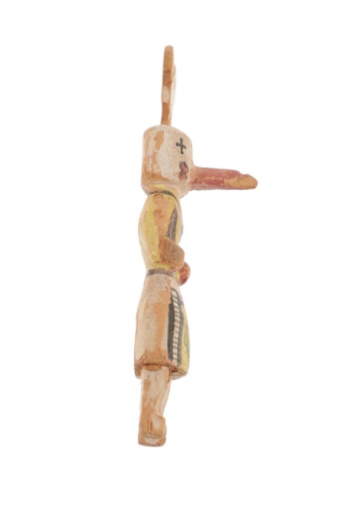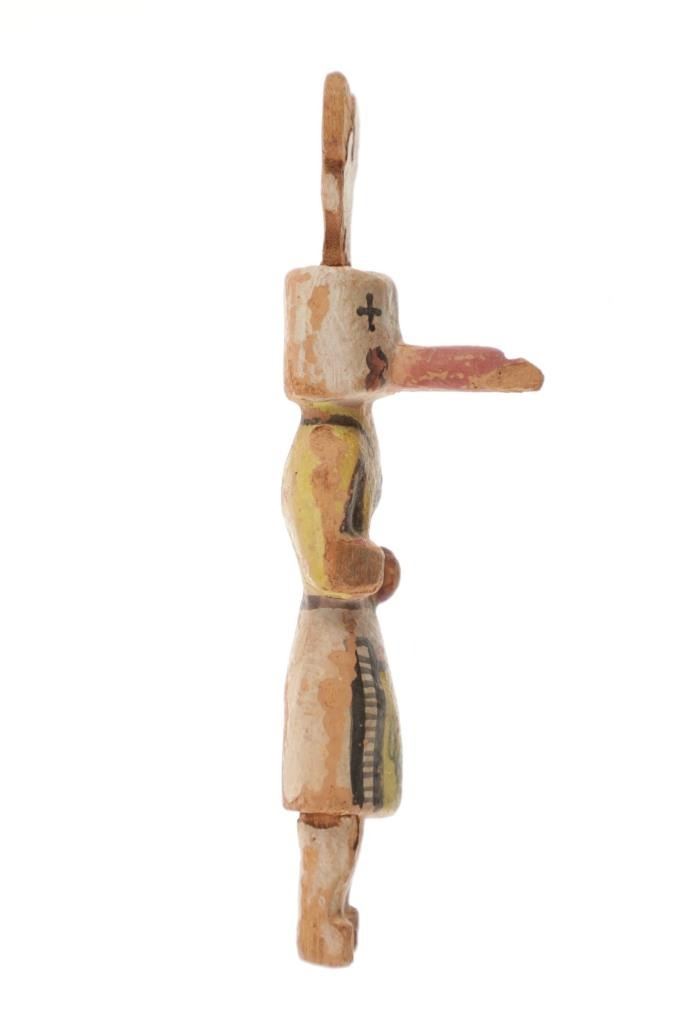 The lot features an original circa 1890-1920's cottonwood root carved Kachina doll from the Hopi Pueblo Indians and the Sundog Bruce VanLandingham collection. The piece shows in-turned hands with slightly in-turned crescent feet, indicative of its early age. The piece has a small keel crown, long beak nose and wonderful original paint. Provenance: From the renowned Sundog Fine Art Bozeman, Montana collection and acquired by Bruce VanLandingham. Bruce VanLandingham was a pillar in the American Indian collecting community and a respected expert. Along with being an avid collector Bruce also was the sole owner of Sundog Fine Art Gallery in Bozeman which was both part museum and gallery. Measures overall 6.75"H by 1 5/8"W by 2"D.