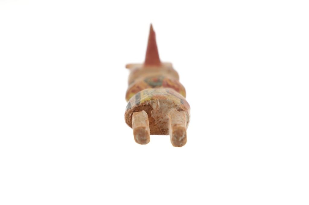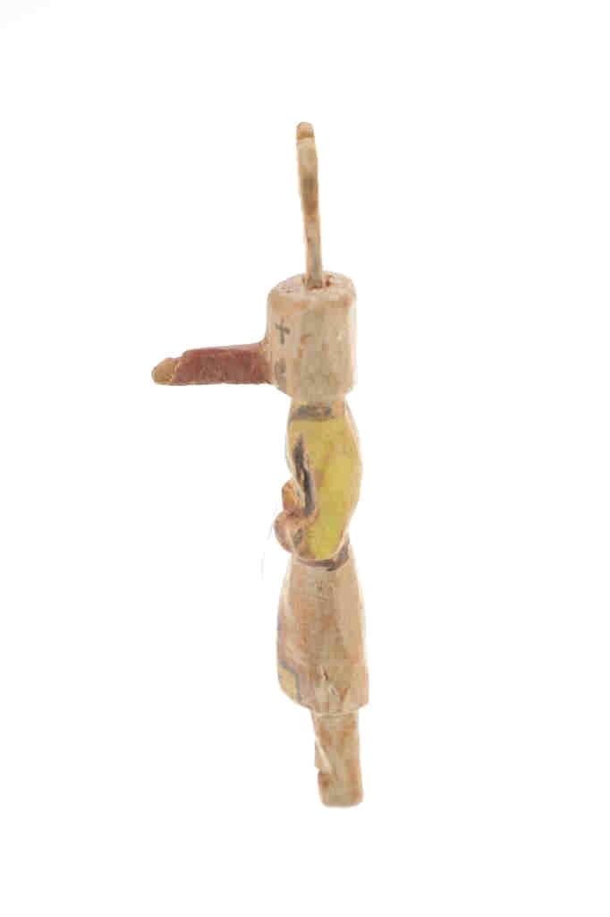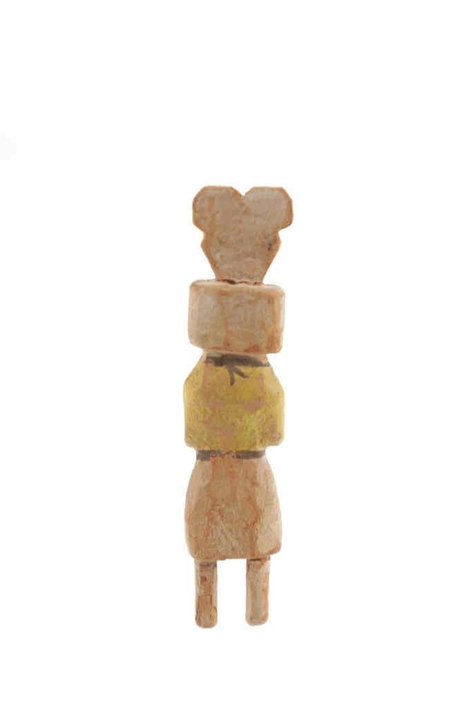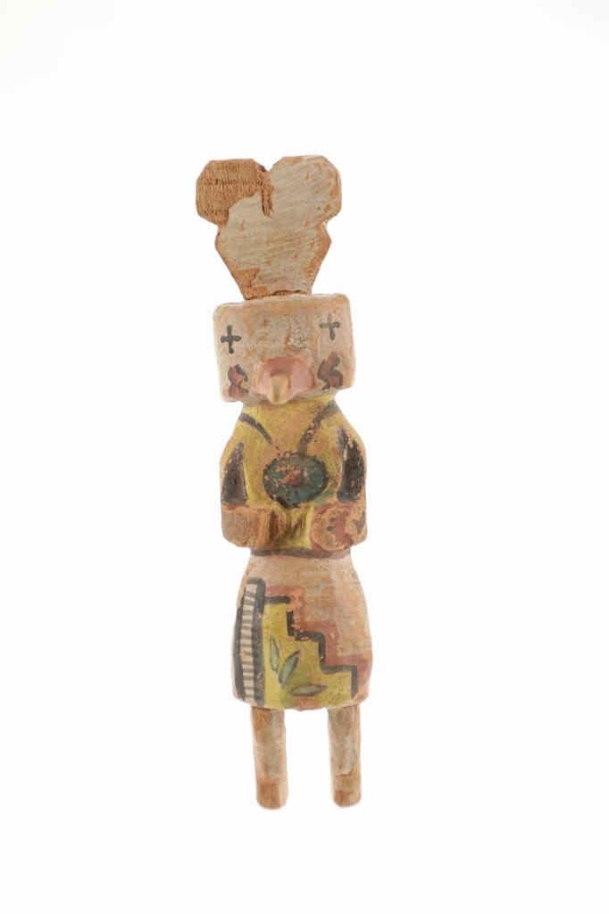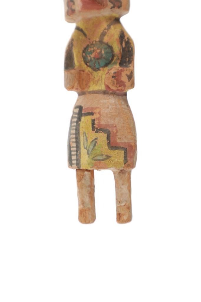 The lot features an original circa 1890-1920's cottonwood root carved Kachina doll from the Hopi Pueblo Indians and the Sundog Bruce VanLandingham collection. The piece shows in-turned hands with slightly in-turned crescent feet, indicative of its early age. The piece has a small keel crown, long beak nose and wonderful original paint. Provenance: From the renowned Sundog Fine Art Bozeman, Montana collection and acquired by Bruce VanLandingham. Bruce VanLandingham was a pillar in the American Indian collecting community and a respected expert. Along with being an avid collector Bruce also was the sole owner of Sundog Fine Art Gallery in Bozeman which was both part museum and gallery. Measures overall 6.75"H by 1 5/8"W by 2"D.