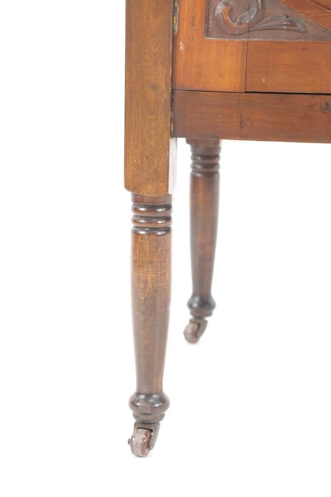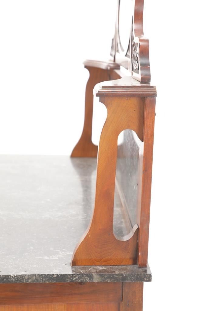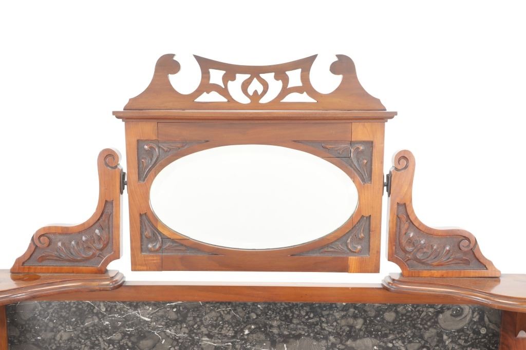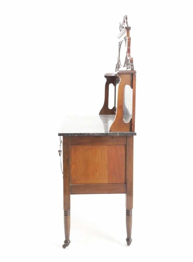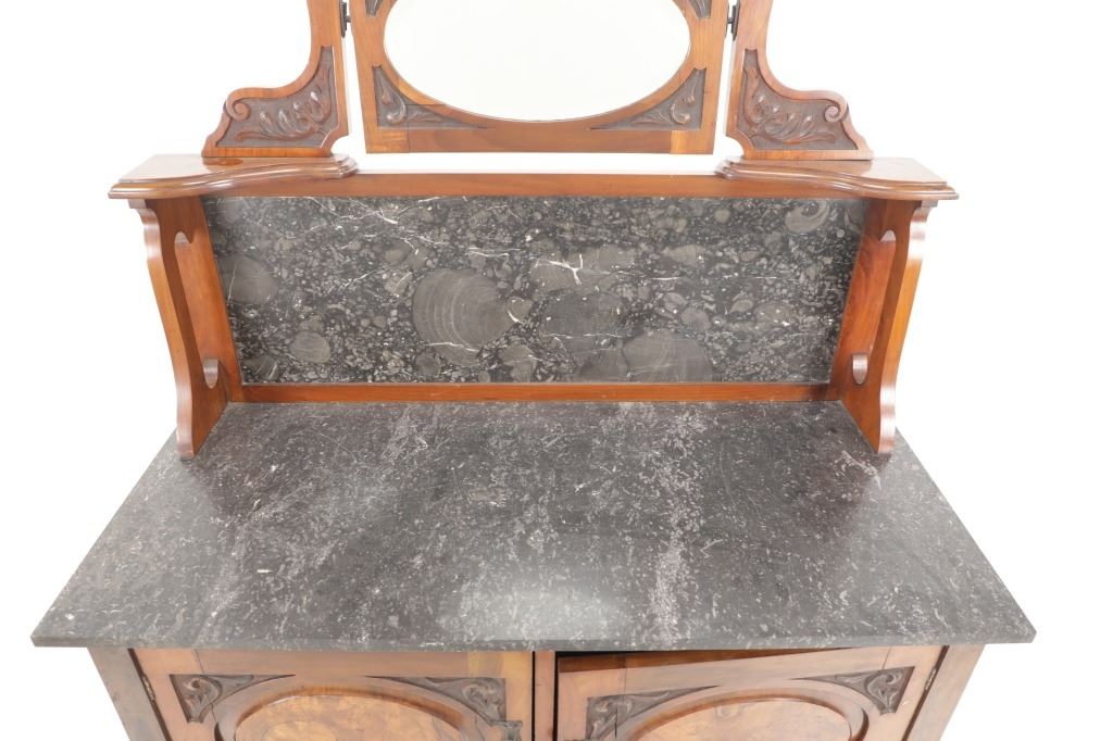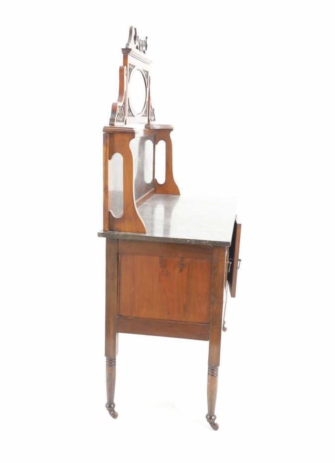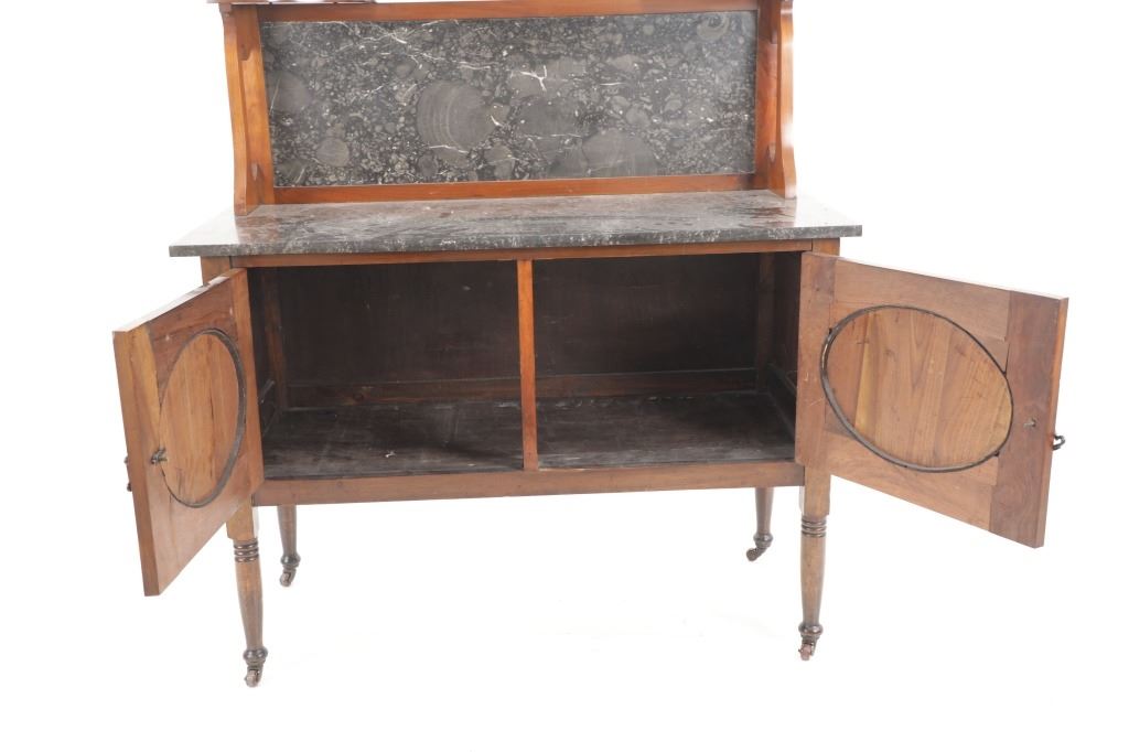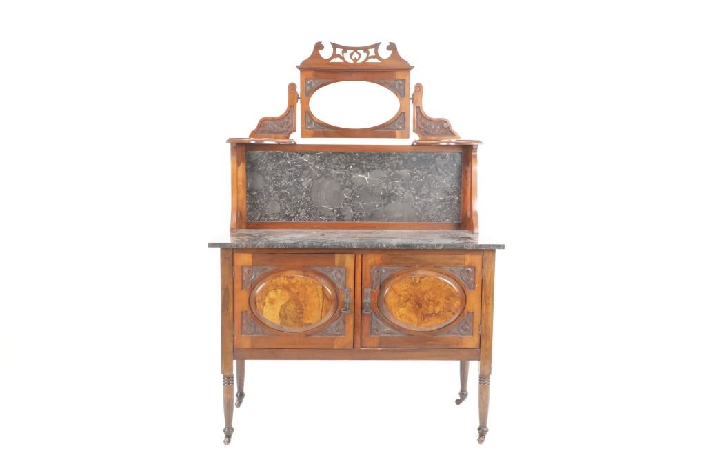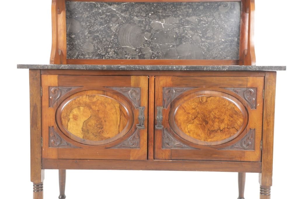 Featured in this lot is this Edwardian washstand marble-top cabinet circa 1890-1910. The washstand features a wonderfully and professionally crafted walnut and marble construction that shows a cabinet design in the bottom half of the piece with two double doors and shows four legs for this cabinet. The condition of this of this Edwardian wash station is good with some wear to the wood but otherwise shows good overall condition. The measurements of this wash station is 60 1/4" x 12 1/4" x 19".