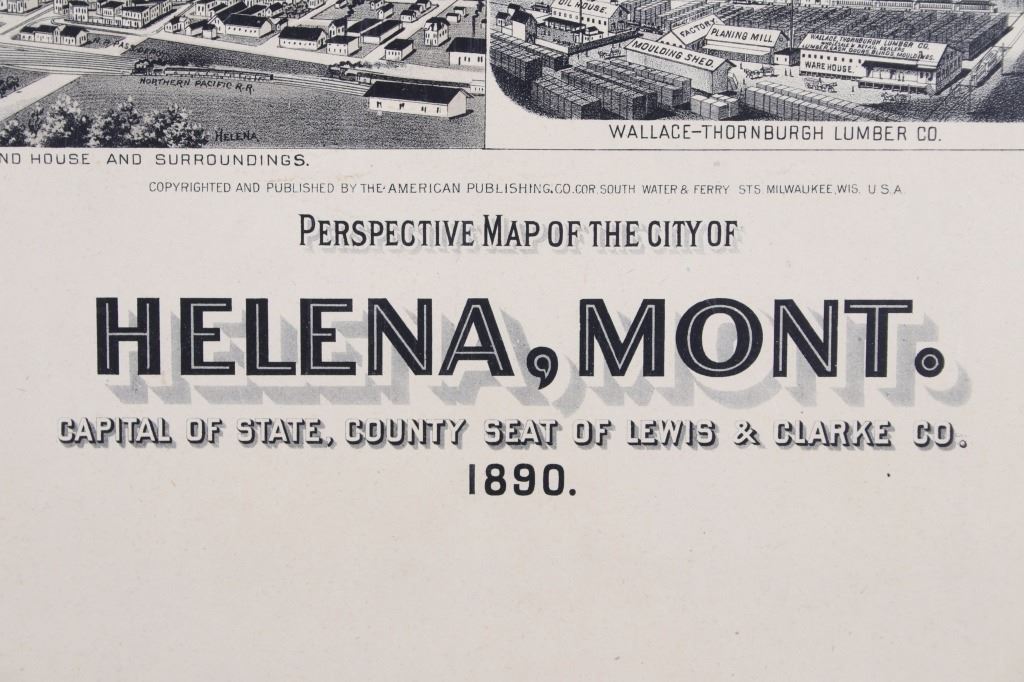 Featured in this lot is this Perspective Map of the City of Helena, Mont. circa 1890. This is a wonderfully and professionally crafted perspective map of the city of Helena, Mont. that shows the city from a air sketched perspective complete with topographical annotations of the hills surrounding the town and shows the layout of the city with time specific annotations of the houses and streets of the city. The map is marked at the bottom that reads as follows: Copyrighted and Published by the American Publishing Co. cor South Water & Ferry STS Milwaukee. WIs U.S.A. - Perspective Map of the City of Helena, Mont. Capital of State. Count Seat of Lewis & Clarke Co. - 1890. The condition of this this perspective map is good with no obvious signs of damage and shows good overall condition. The measurements of this map is 28" x 41".
