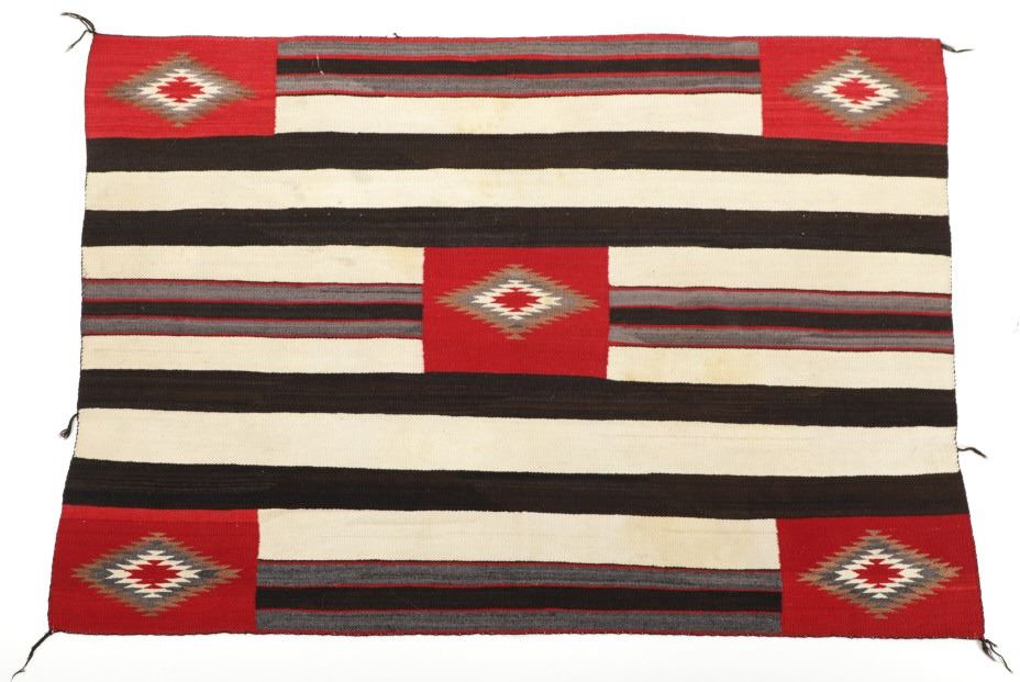 Featured in this lot is this Navajo third phase Chief's Blanket rug circa 1890's from the Bruce VanLandingham Sundog collection. This rug features a wonderfully and professionally crafted wool construction that features a beautiful banded decoration with stepped medallions in the corners with a central medallion shown in its center and shows coloration of medium red, light brown, dark grey, and off white. The Third Phase Navajo Chief’s Blanket, for many collectors, may be the most artistic of the Chief’s Blankets. Composed of nine diamond or Cross formations, these blankets were made in the 1860 to 1890 time frame. Composed of raveled natural dyed cochineal red yarns, natural churro indigo blue and white and/or brown stripes, third phase blankets can command prices upward of $175,000, though a good example usually brings closer to $75,000 – $100,000. The condition of this Navajo Third Phase rug is good with no obvious signs of damage and shows good overall condition for its age. The measurements of this Navajo Third Phase rug is 74" x 51". Provenance: From the renowned Sundog Fine Art Bozeman, Montana collection and collected by Bruce VanLandingham. Bruce VanLandingham was a pillar in the American Indian collecting community and a respected expert. Along with being an avid collector, Bruce also was the sole owner of Sundog Fine Art Gallery in Bozeman, which was both part museum and gallery.
