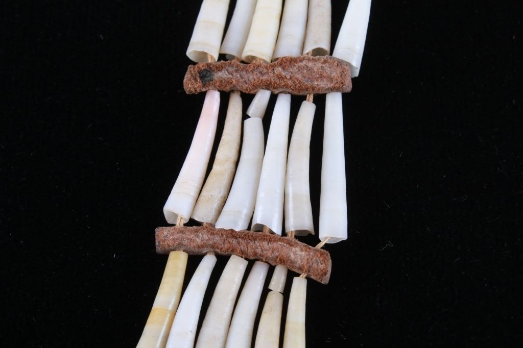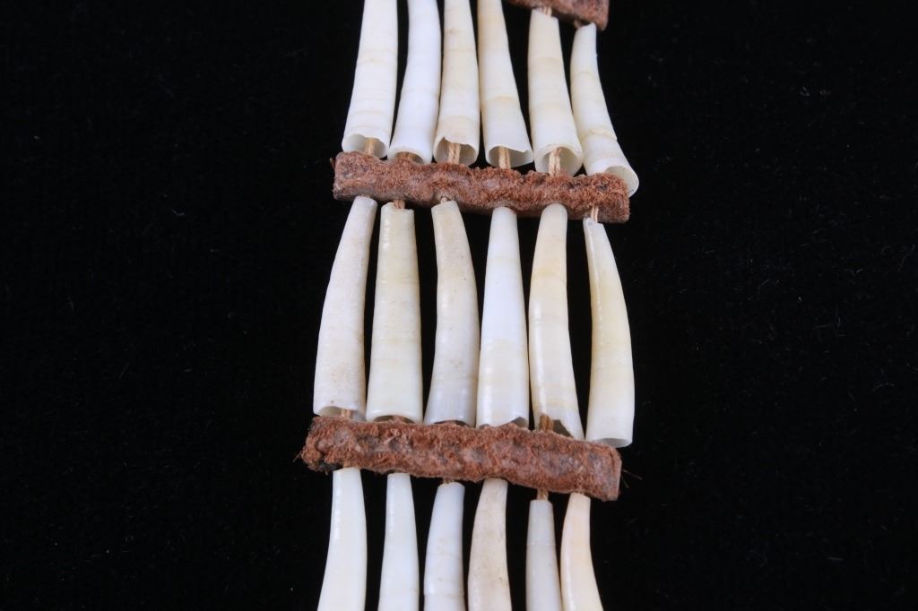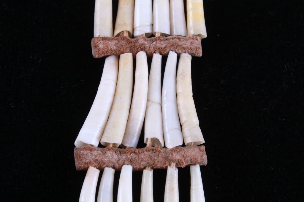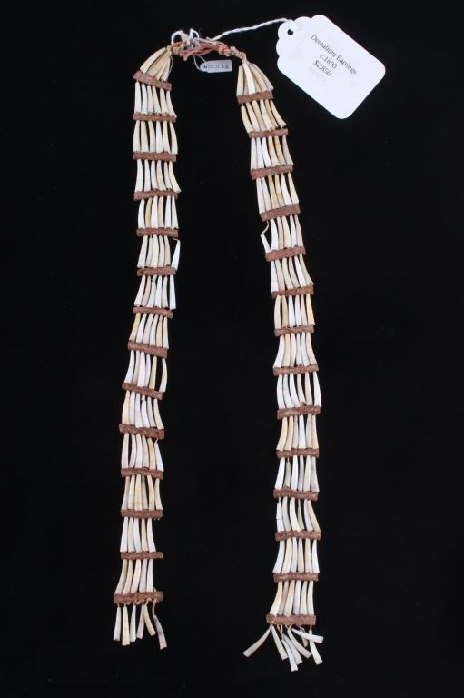 This is an outstanding set of circa 1890's dentalium shell earrings from the Northern Plains Native American Indians and the Sundog Gallery Bruce VanLandingham collection. The set shows fifteen rows of five to six dentalium shells strung with trade cotton thread with rawhide parfleche spacers. The piece has two of the original museum collection tags; one marked 05.11.28 and the other the Sundog tag marked "Dentalium Earrings c. 1890 $2,850 BV0283 and "C RICH ABROMEIT (billings). Provenance: From the renowned Sundog Fine Art Bozeman, Montana collection and collected by Bruce VanLandingham. Bruce VanLandingham was a pillar in the American Indian collecting community and a respected expert. Along with being an avid collector, Bruce also was the sole owner of Sundog Fine Art Gallery in Bozeman, which was both part museum and gallery. The set is in good condition with some slight shell loss. Measures each 15.5"L.