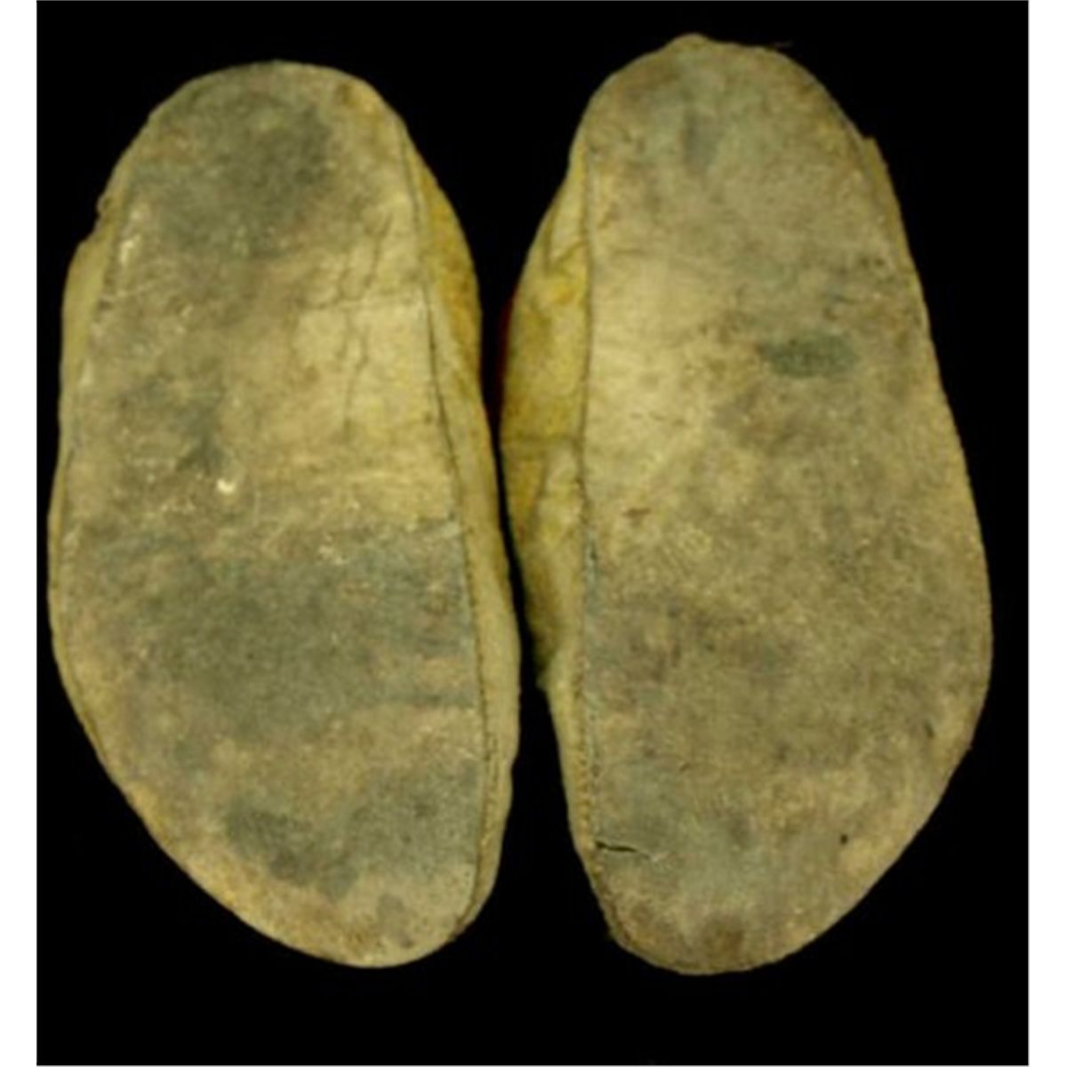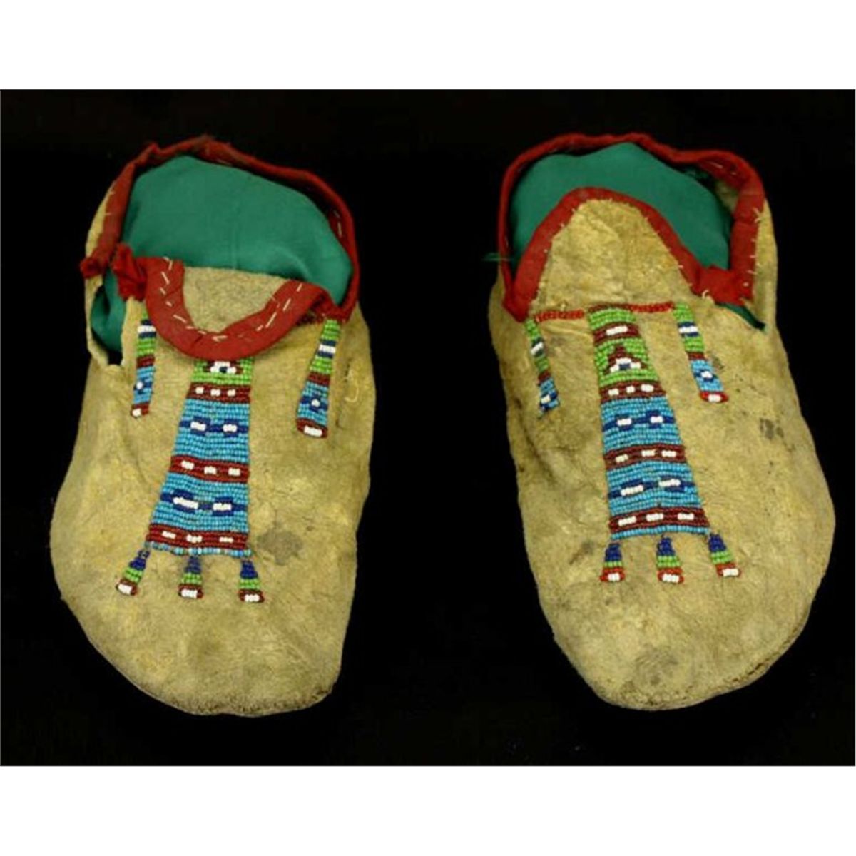 C. 1890 Northern Plains partially beaded moccasins red cloth lined openings, 10" long.