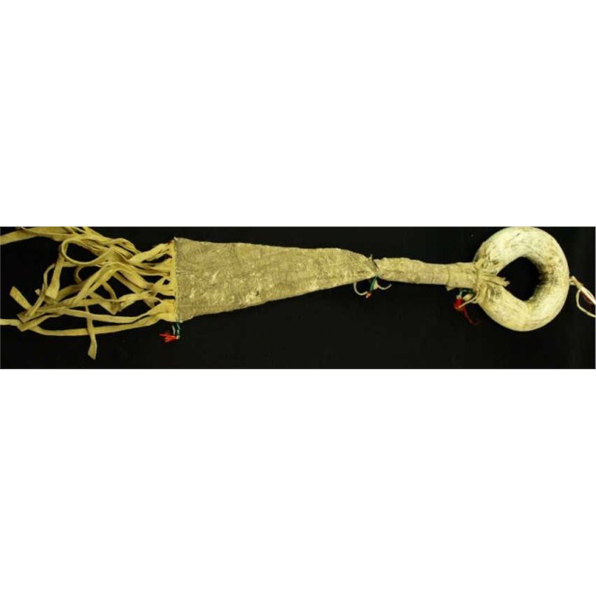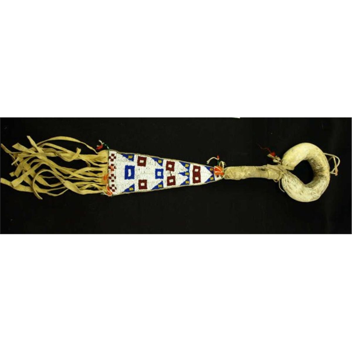 C. 1890 Sioux grass dance rattle warrior society sinew sewn with beaded and fringed drop, 25" long with drop.