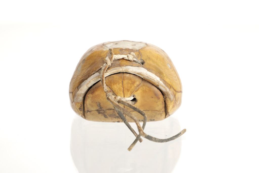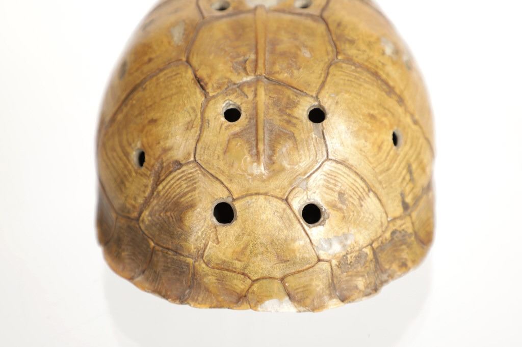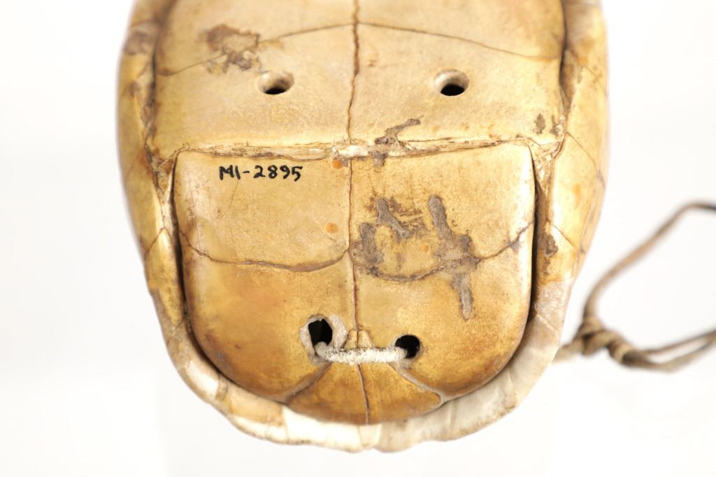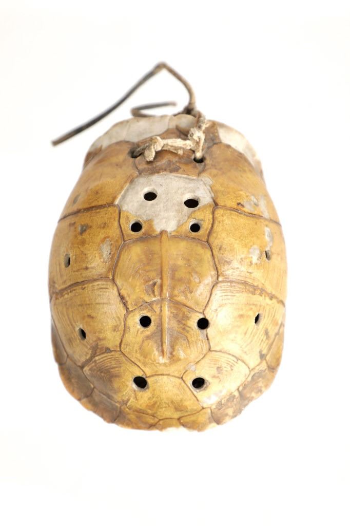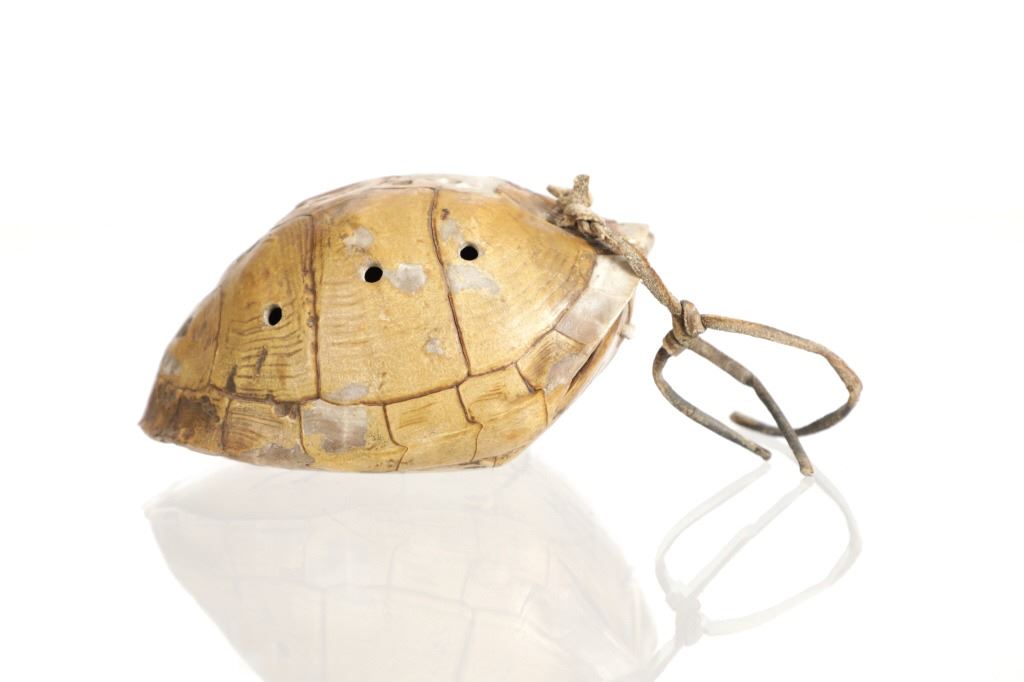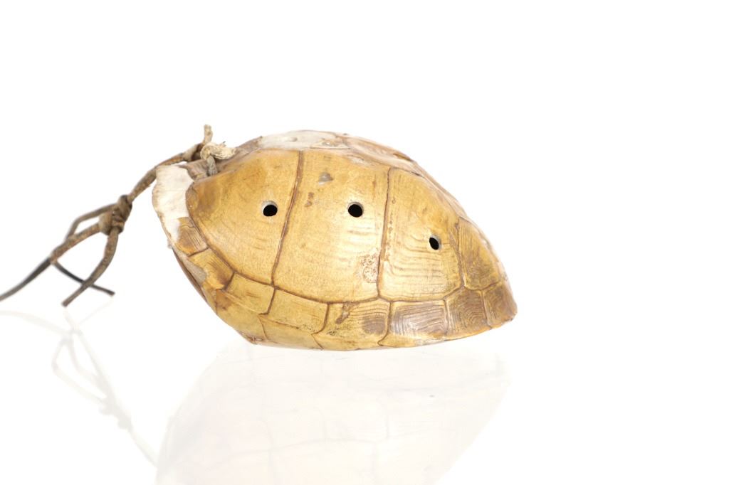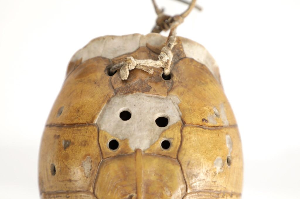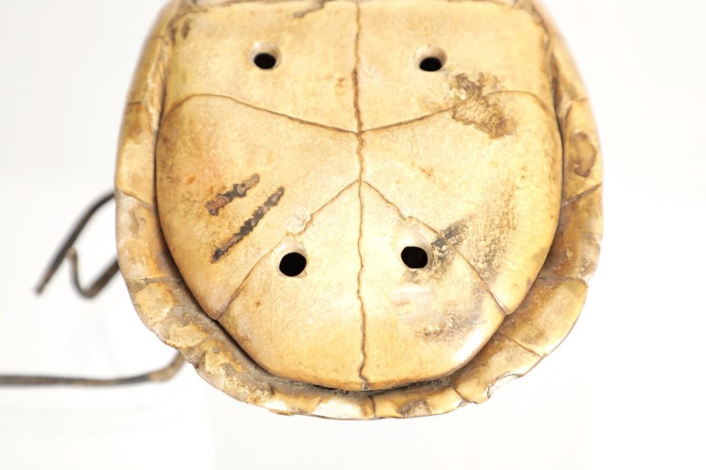 This is an unusual circa 1890-1900’s turtle shell rattle from the Southeastern Native American Indians and from the Bruce VanLandingham Sundog collection. The piece exhibits a full sized turtle shell with hand drilled pierced holes, a tie of Indian tanned hide and filled with stones, early metal bottle caps and whatever else could be found at the time. These pieces in this form with the drilled holes and no handle are documented as originating from the Southeastern tribes being worn around the legs for the “stomp dance”. Turtle shell gorget and rattles with the similar drilled pierced hole pattern have been documented as being used by Indigenous peoples of the Americas in the southeastern United States back to the Archaic (circa 8000-1000 BC) through Mississippian periods (circa 800-1500) typically with Eastern box turtle (Terrapene Carolina shells. For an example see catalog number 2011.27.26.1 from the McClung Museum of National History and Culture, University of Tennessee, Knoxville, Tennessee. The piece could very likely be of a substantially earlier age with the metal bottle caps being a later addition, as remnants were commonly used in Native American culture. The bottom has a collection museum number of MI-2895 and is in the Sundog Bruce VanLandingham catalog as being a 19th Century example. Provenance: Provenance: From the renowned Sundog Fine Art Bozeman, Montana collection and collected by Bruce VanLandingham. Bruce VanLandingham was a pillar in the American Indian collecting community and a respected expert. Along with being an avid collector, Bruce also was the sole owner of Sundog Fine Art Gallery in Bozeman, which was both part museum and gallery. Condition is very good and measures 5 1/8”L by 4.25”W by 3”D with an additional approx. 6”L hide tie. Museum collection number: E1046.