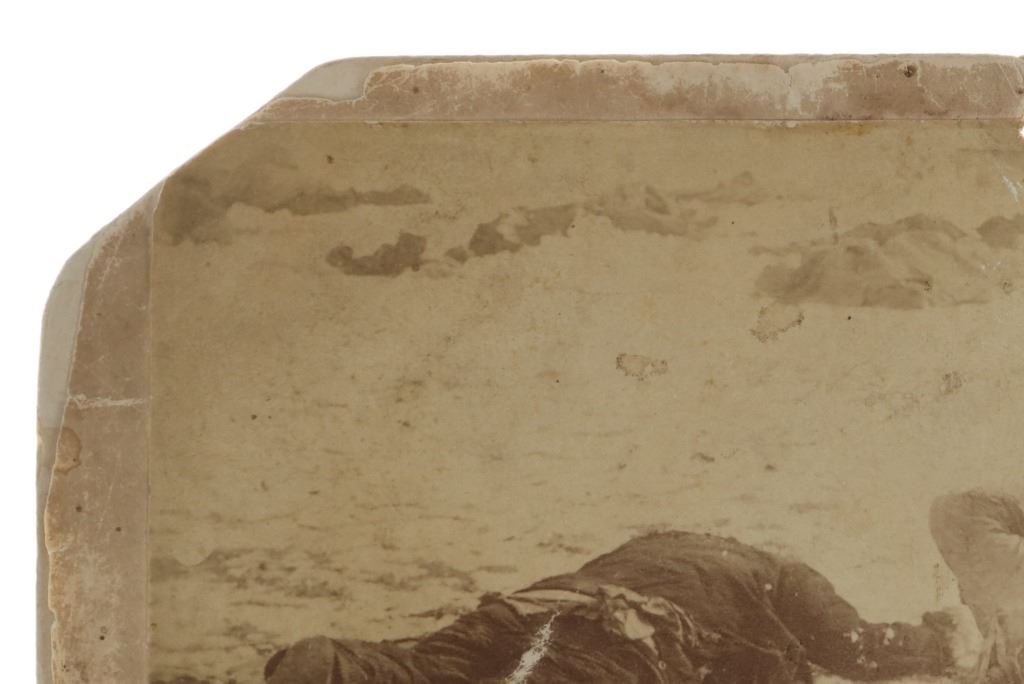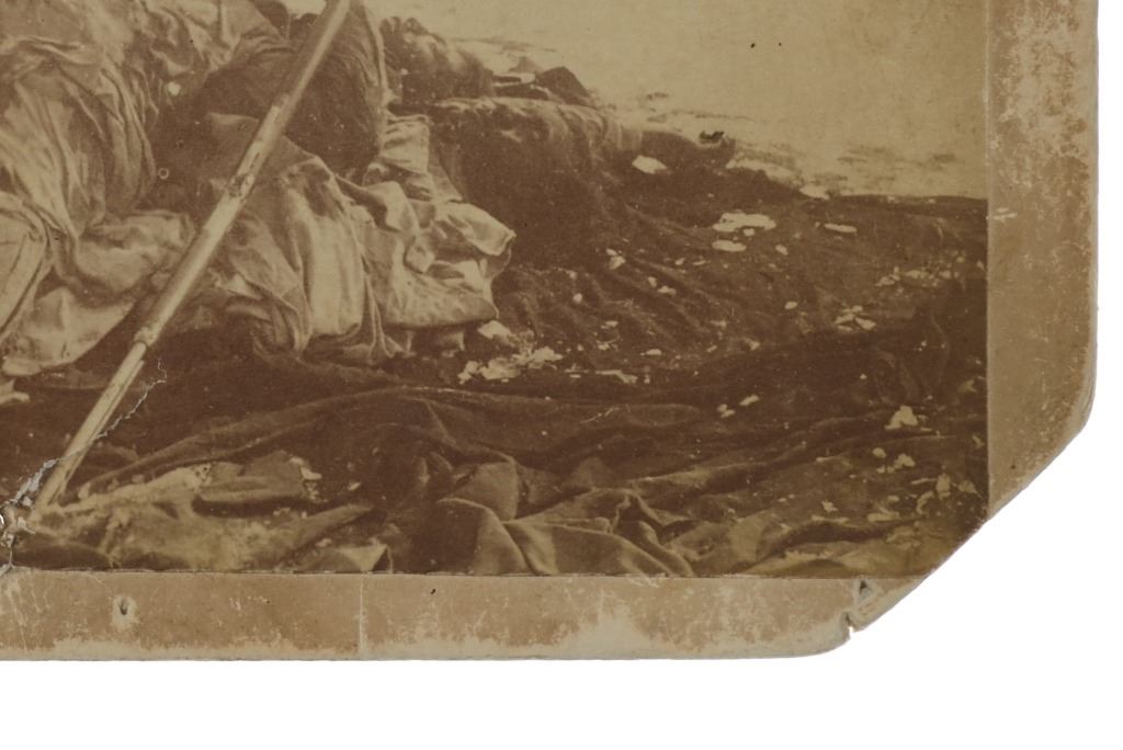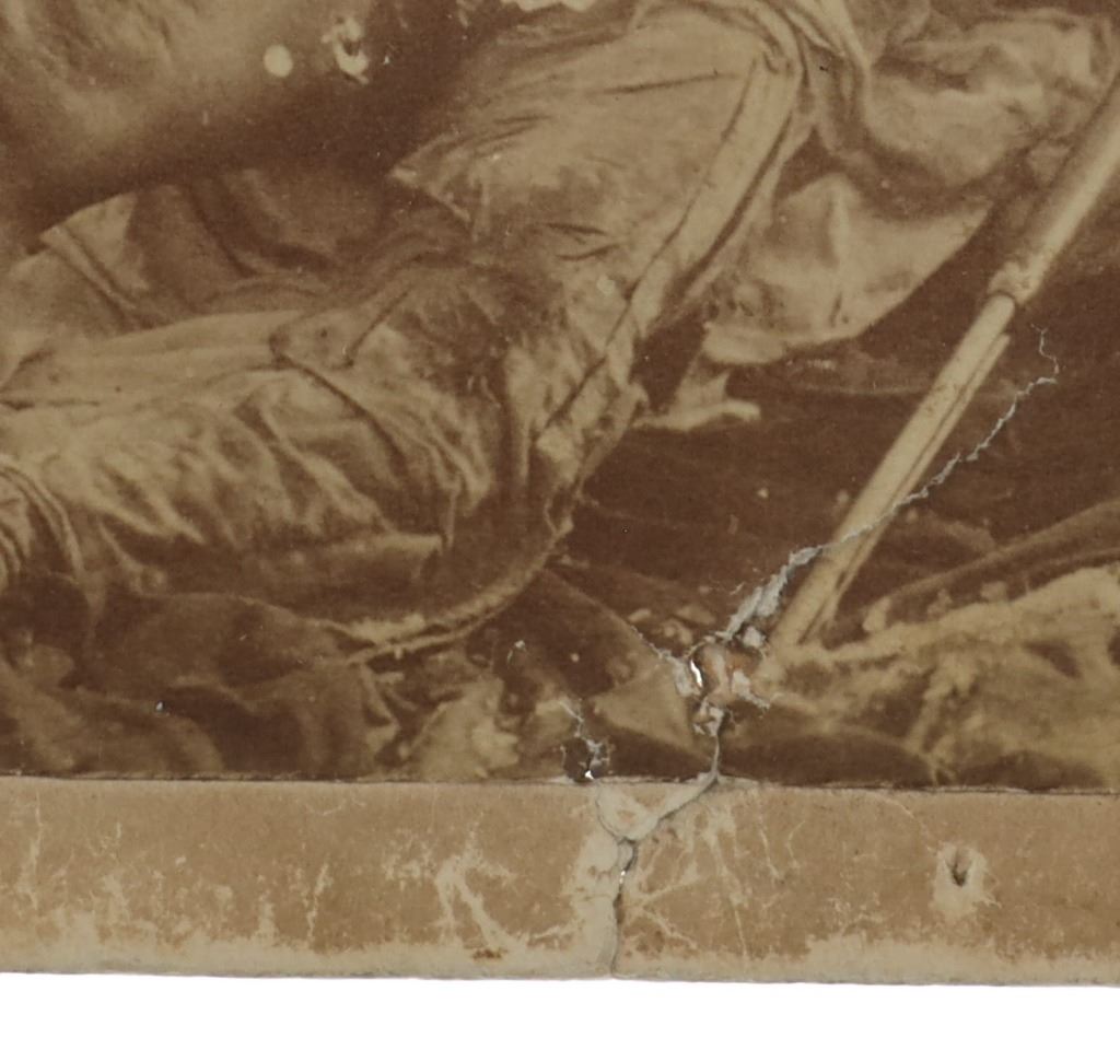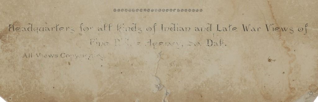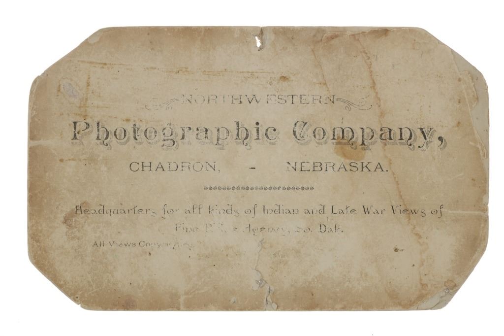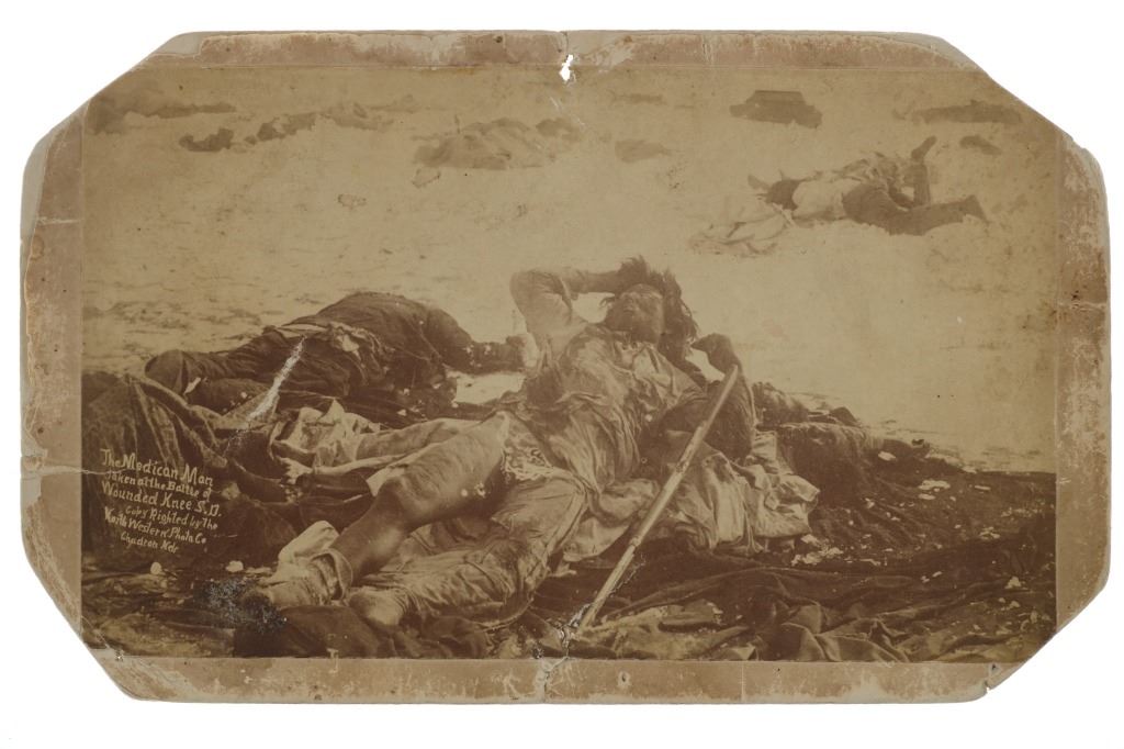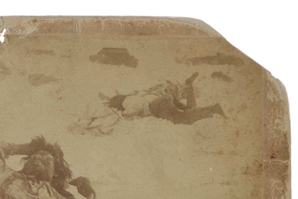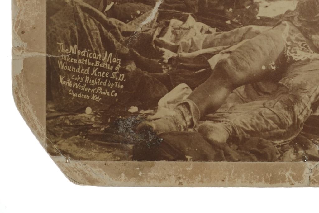 This is an original photograph of The Medicine Man, a slain Sioux at the Wounded Knee Massacre taken on January 1st, 1891 by George Trager of The Northwestern Photographic Company Chadron, Nebraska. The piece shows the gruesome image of a killed Sioux warrior amongst his fallen brothers, identified as The Medicine Man. This is the earliest edition of this albumen photograph boudoir card, other examples showed more advertisement and additional writing in the negative. This example is marked in the image / negative, “The Medicine Man taken at the Battle of Wounded Knee S.D. Copy Righted by the Northwestern Photo. Co. Chadron Neb.” And the back is marked, “Northwestern Photographic Company Chadron, Nebraska Headquarters for all kinds of Indian and Late War Views of Pine Ridge Agency So. Dak. All Views Copyrighted.” George Trager, of nearby Chadron, NE, was the first photographer on the scene after the Wounded Knee debacle, and took a number of photographs in January 1891 as US troops began collecting and burying bodies left on the field. An iconic image from the series of plates he exposed. The Wounded Knee Massacre, also referred to as the Battle of Wounded Knee, was the massacre of nearly 300 Lakota Indians by the 7th Cavalry Soldiers of the Untied States Army and was part of what the U.S. military called the Pine Ridge Campaign. The event occurred on December 29th, 1890 near Wounded Knee Creek on the Lakota Pine Ridge Indian Reservation in South Dakota. Provenance: From the Jim Aplan Piedmont, South Dakota collection. The large boudoir card measures 8.5” by 5.25”. The card shows some small tearing, a hole where the photo was hung, and each corner cut for display. A historic piece.