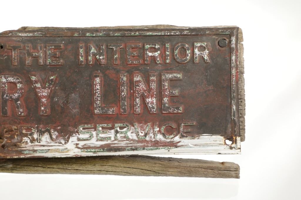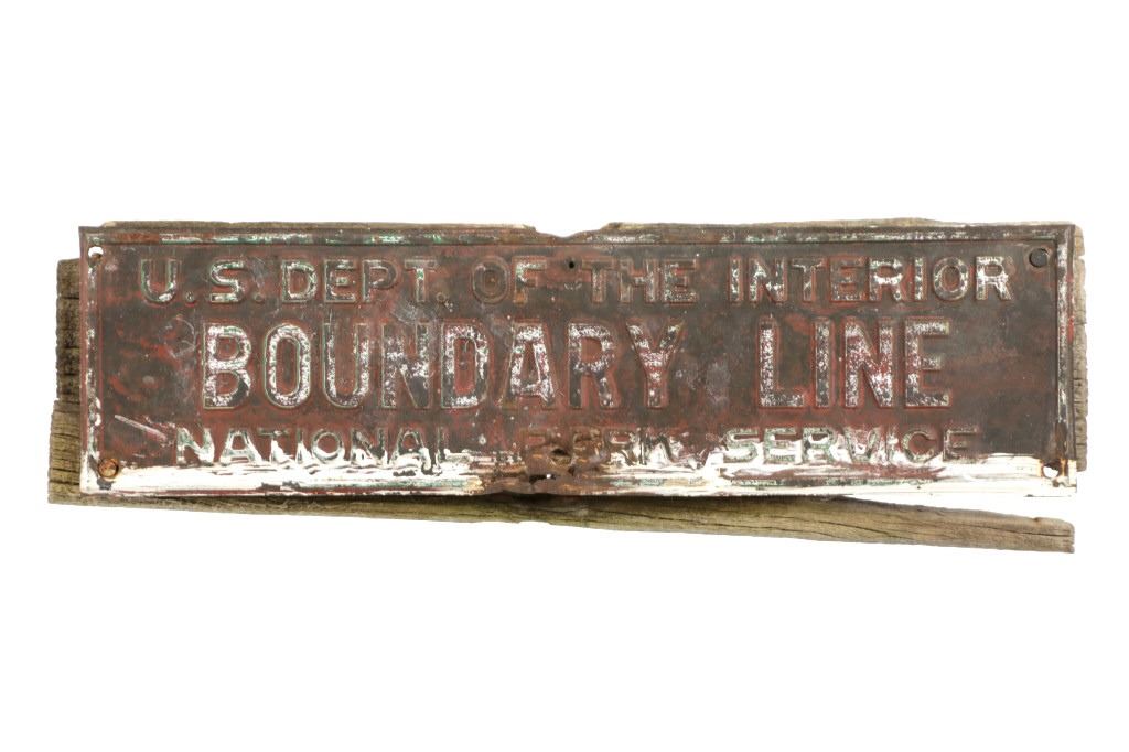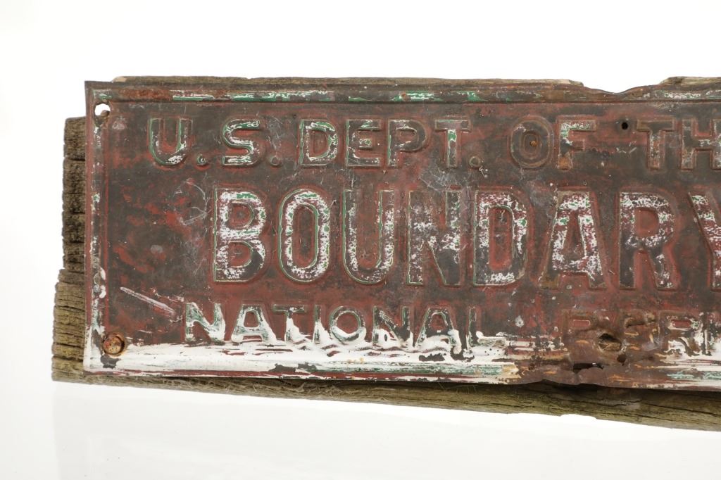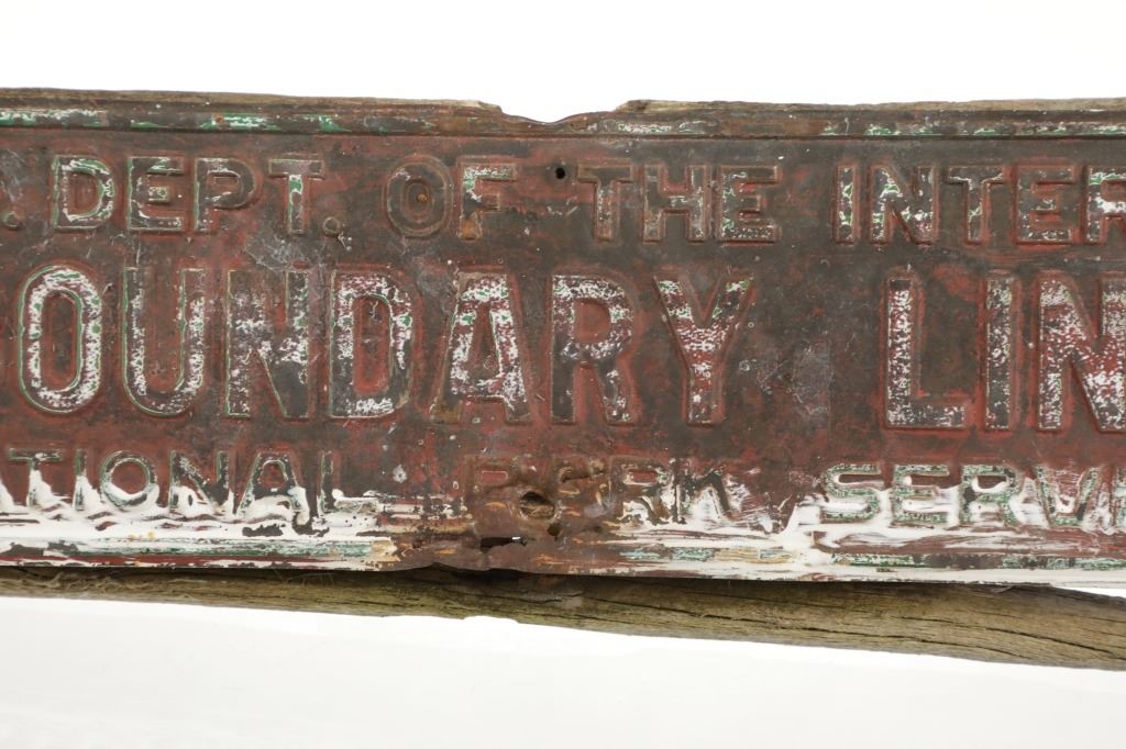 This is an original authentic circa 1890 to early 1900's Yellowstone National Park Boundary sign. The sign reads "U.S. Dept of the Interior Boundary Line National Park Service. This is an early sign used to designate boundary lines for the Park. The sign is nailed to the same wood from when it was used as a boundary marker. The sign is in good condition. It measures 4 1/4" x 15".