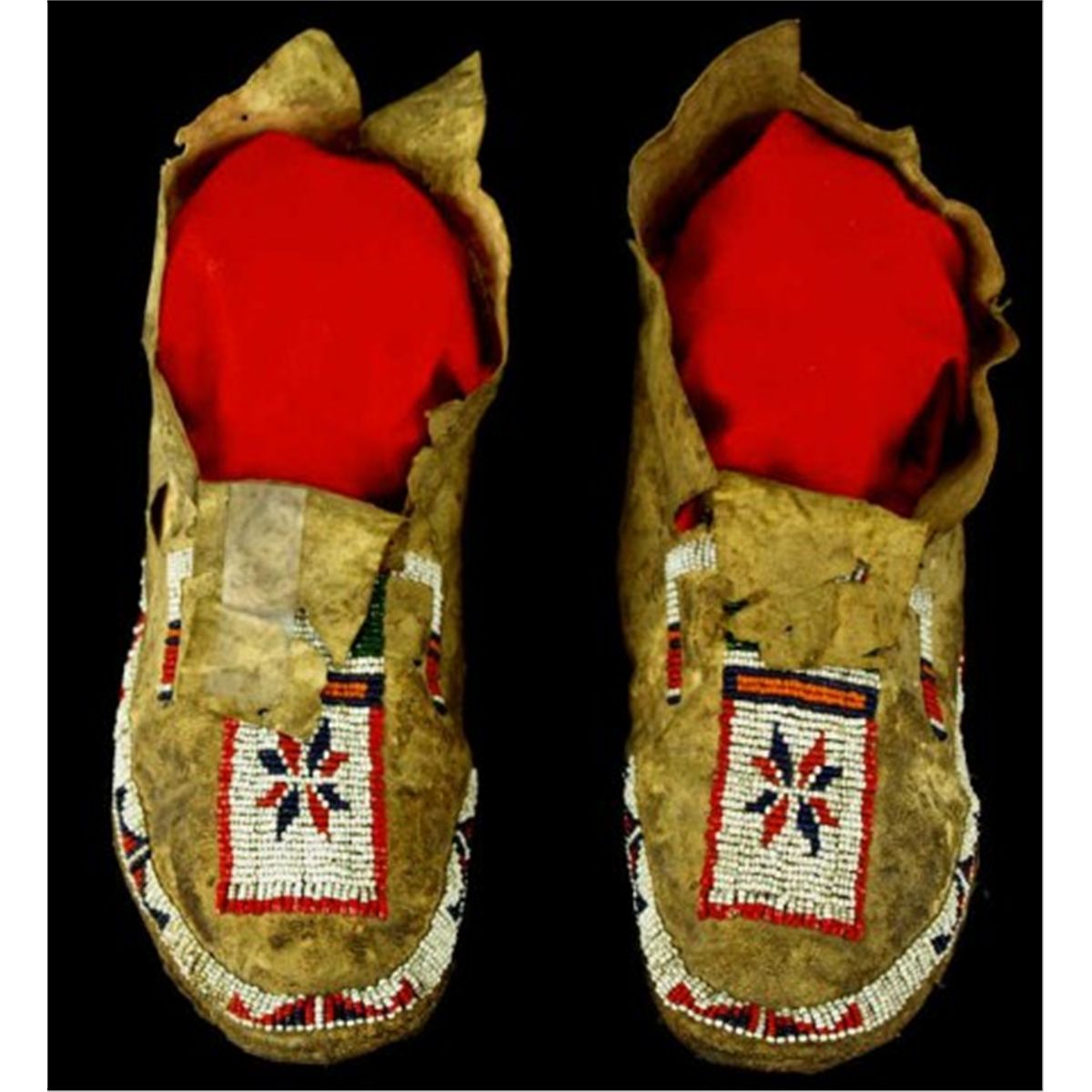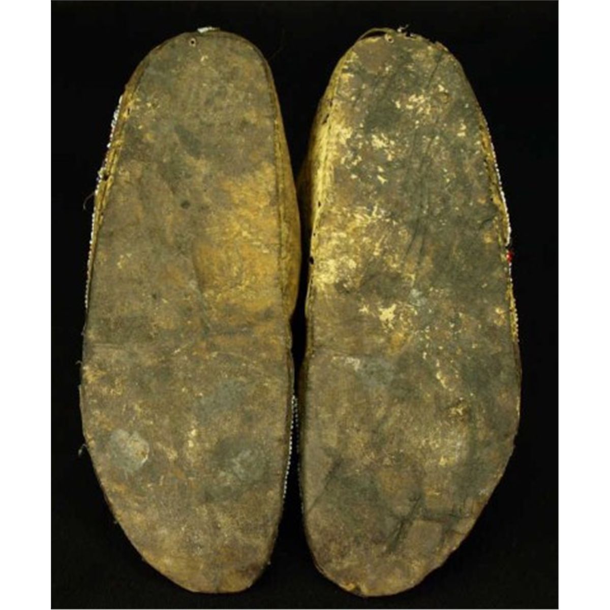 C. 1890's Arapaho moccasins beaded uppers, hard soles, leather shows deterioration and some separation but complete, 10" long.