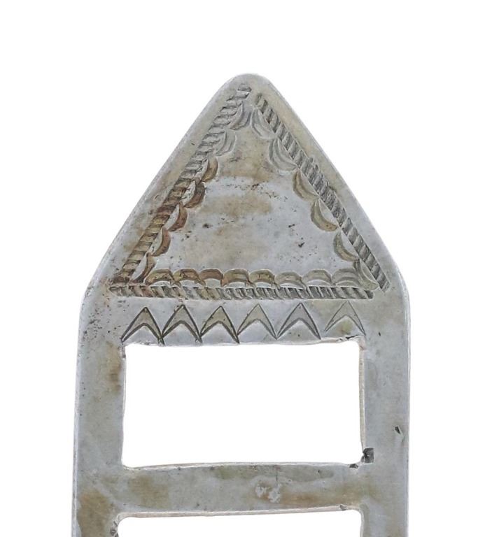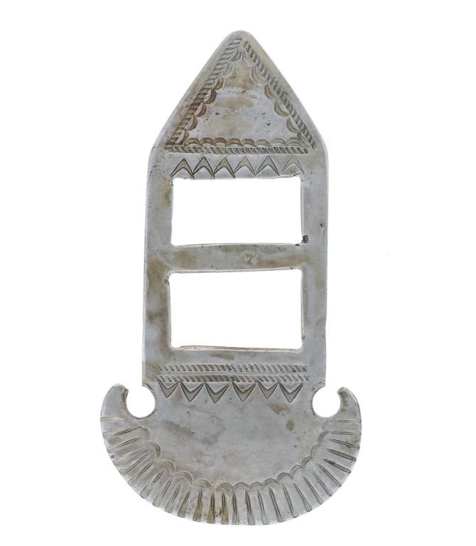 This is an outstanding circa 1890's Southern Plains Indian German Silver Peyote Religion Church / Chapel scarf slide. The piece is one of the earlier examples offered for sale showing a stamped German silver / nickel silver with carved ends, rocker engraving and stamping. The piece comes from the Sundog Bruce VanLandingham collection where it was found to be authentic. Provenance: From the renowned Sundog Fine Art Bozeman, Montana collection by Bruce VanLandingham. Bruce VanLandingham was a pillar in the American Indian collecting community and a respected expert. Along with being an avid collector, Bruce was also the sole owner of Sundog Fine Art Gallery in Bozeman, which was both part museum and gallery, this piece is directly from the collection. Measures 2"L by 1"W. Good condition.