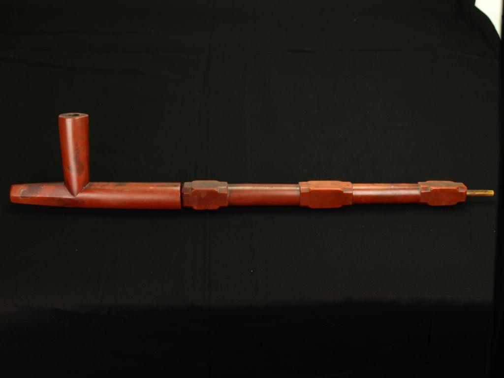 24" long with accompanying tattered note which reads "collected in 1912 at Chadron Nebraska from Little Deer Pine Ridge, S. Dak-he owned pipe for 10 years- made before he owned it" Pipe displays great patina, stem carved in circular and faceted square form, bowl flattened bottom undercoated. Collector consignor disclosed an undetectable repair to stem. Interesting pipe with good history.