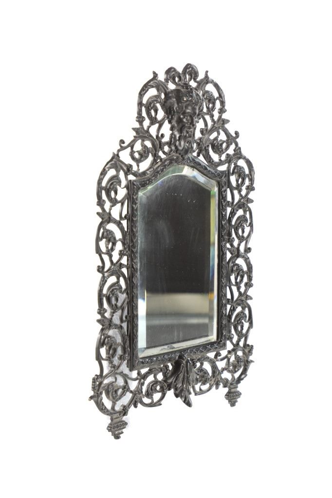 Featured in this lot is this Victorian era cast iron wrought iron man of the north / grotesque face black gilt wall mirror circa 1890-1910. The wall mirror features a wonderfully and professionally crafted lead core and black gilt construction. The wall mirror features a winding decoration that shows floral decoration and pillar bottom corners with a face of Poseidon above the mirror. The condition of this of this Victorian era small vanity mirror is good with no obvious signs of damage and shows good overall condition. The measurements of this Victorian mirror is 15 1/4" x 10" x 3/4". The collective weight of this mirror is 4lb 2oz.