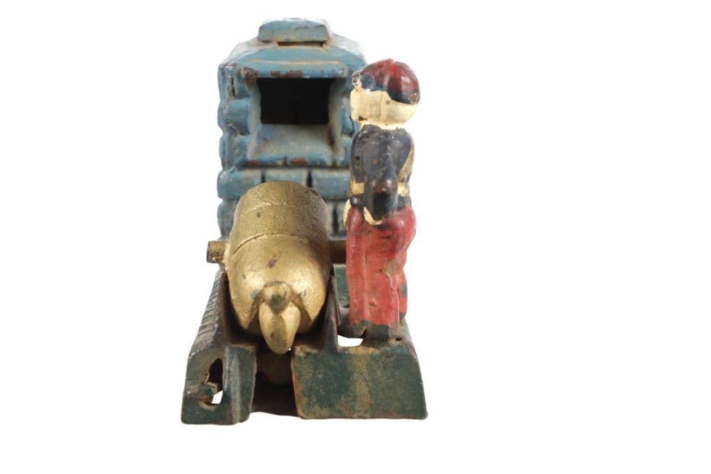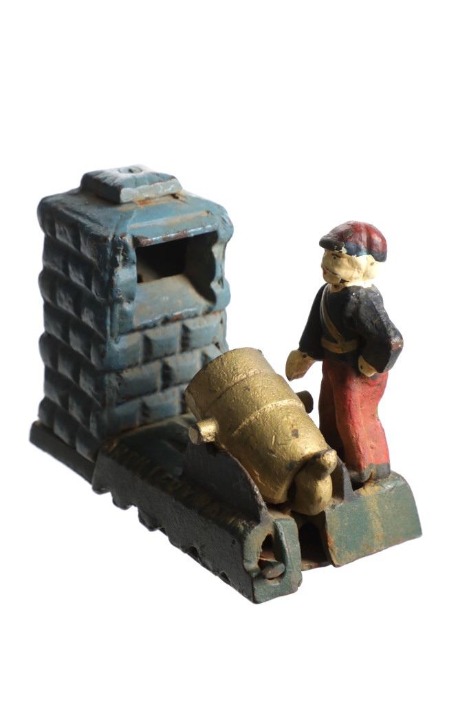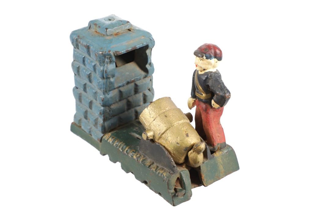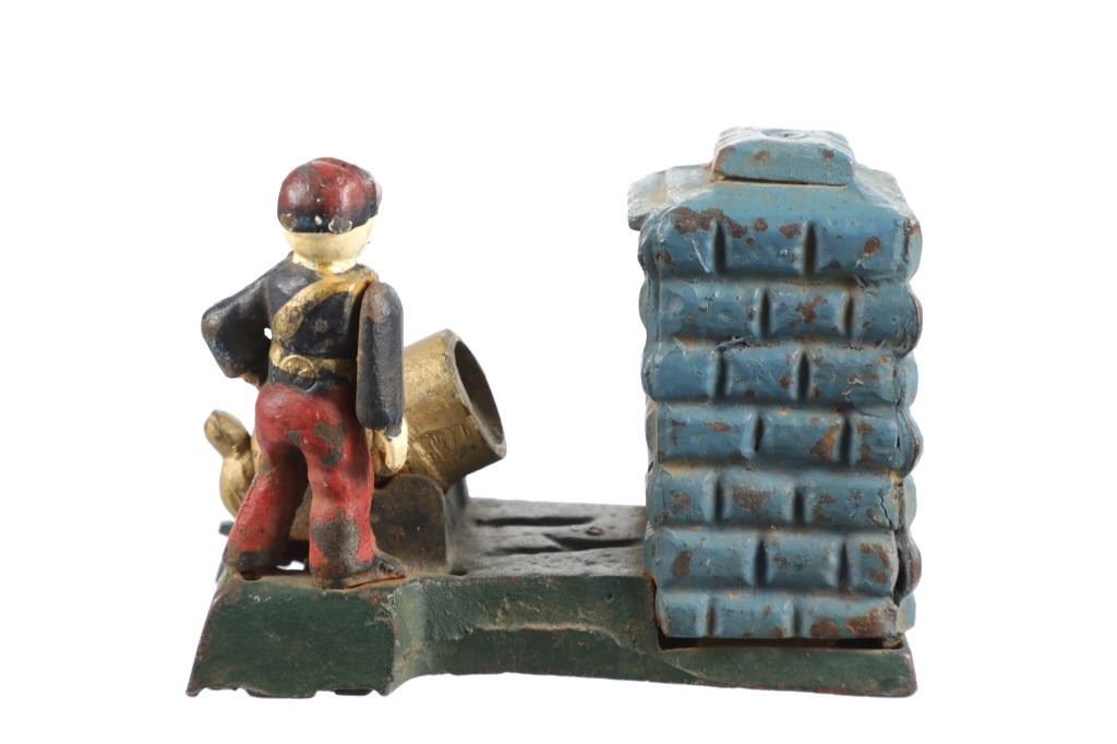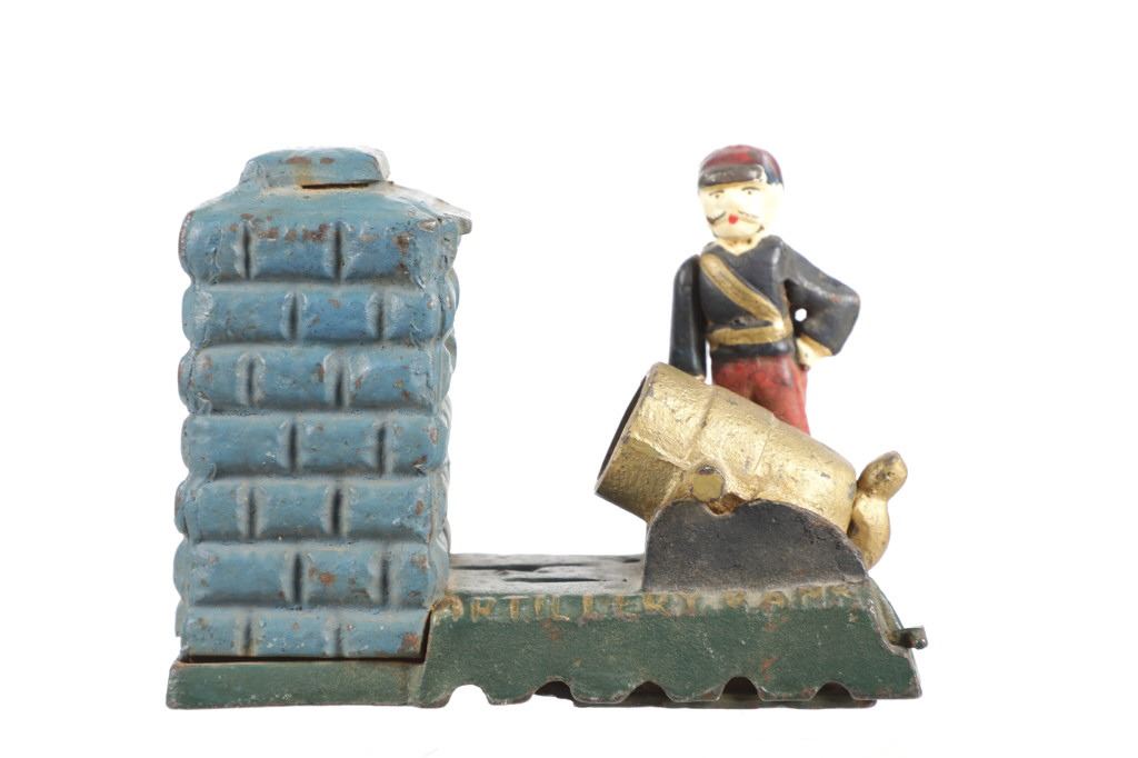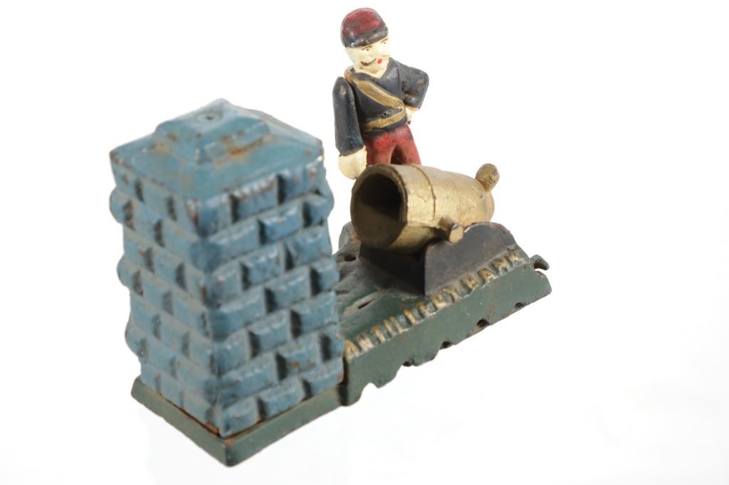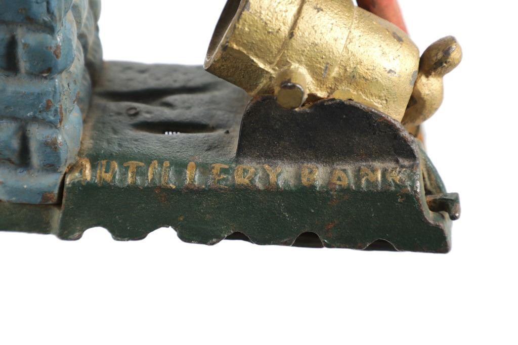 Featured in this lot is this hand painted cast iron "Artillery Bank" by J.E. Stevens circa 1892. The bank features a wonderfully and professionally crafted cast iron and hand painted construction that shows a Union officer standing beside a Howitzer cannon aimed at a tower; the action of inserting a coin includes the cannon hammer is cocked back and the basin can be loaded with a coin with the trigger on the model to the right and is fired into the bank. The plug on the bottom of the bank is missing but the action works as intended. The outside of the bank is marked as folows: Artillery Bank. The condition of this cast iron bank is preserved with some wear to the paint and show some under oxidation to the cast iron due to age and exposure but otherwise shows a preserved overall condition. The measurements of this cast iron bank is 5" x 3 1/2" x 6 1/2". The collective weight of this cast iron bank is 4lb 12oz.