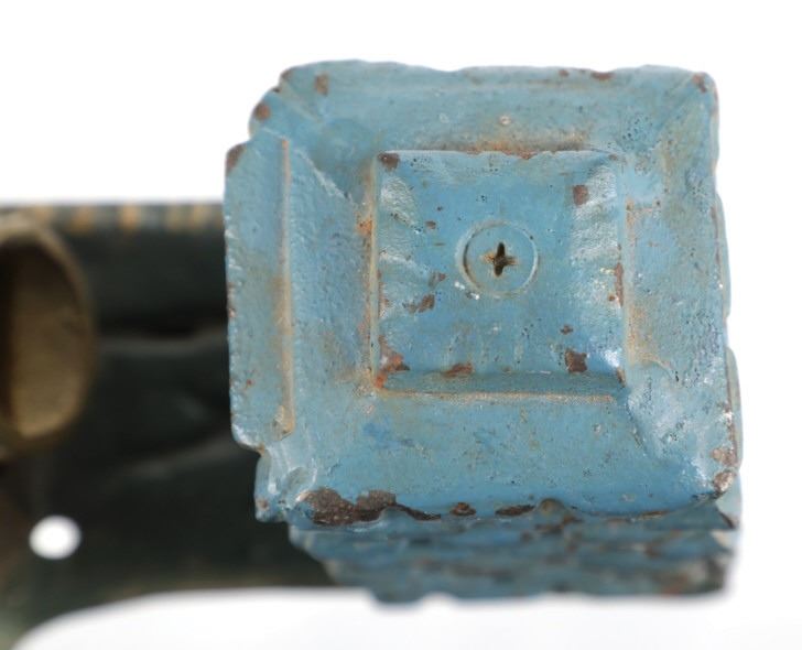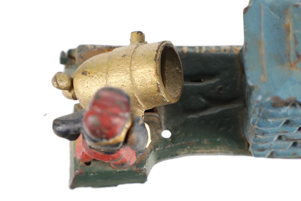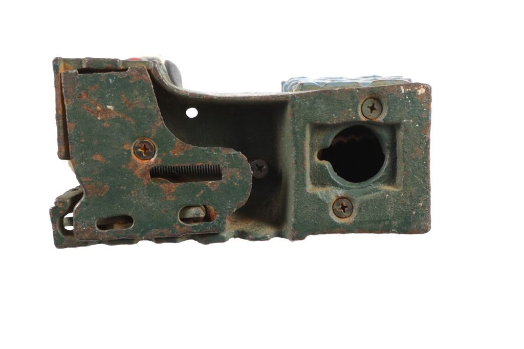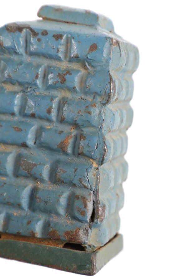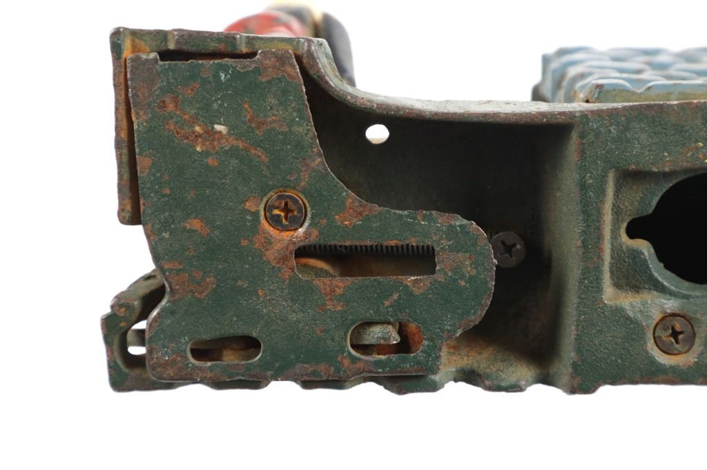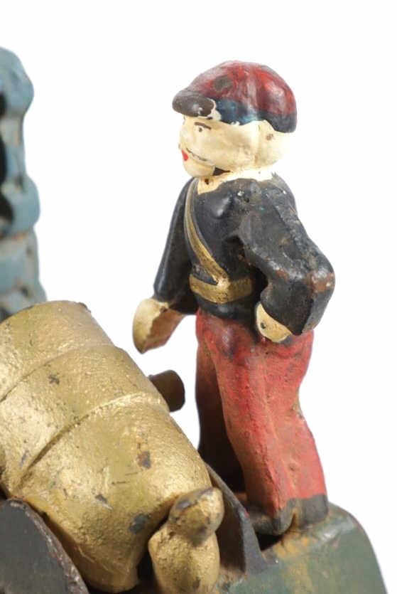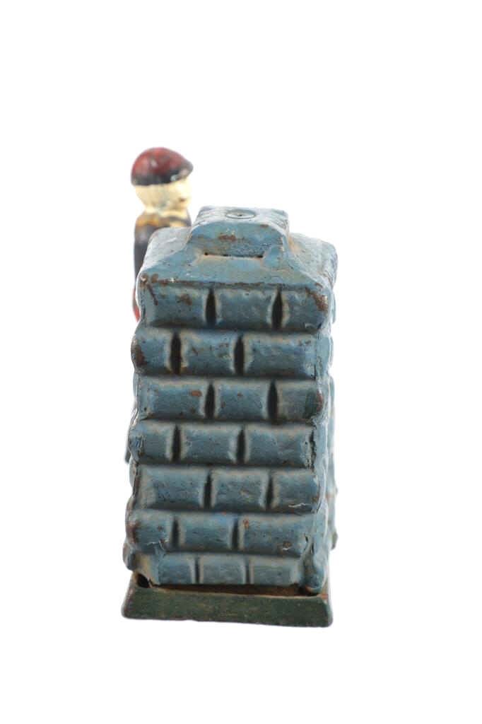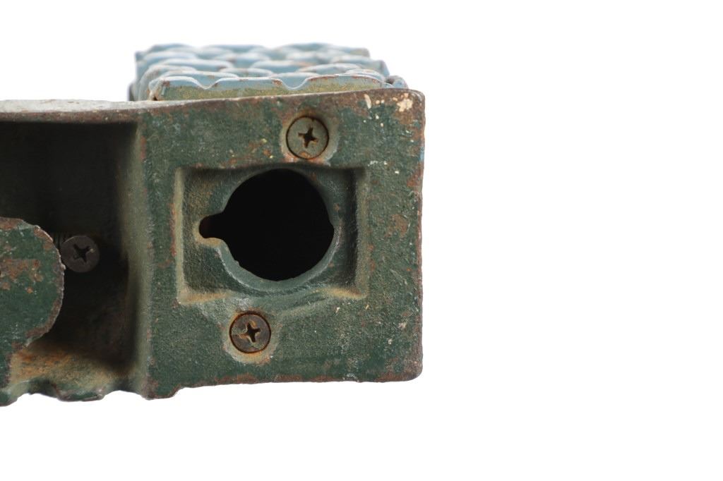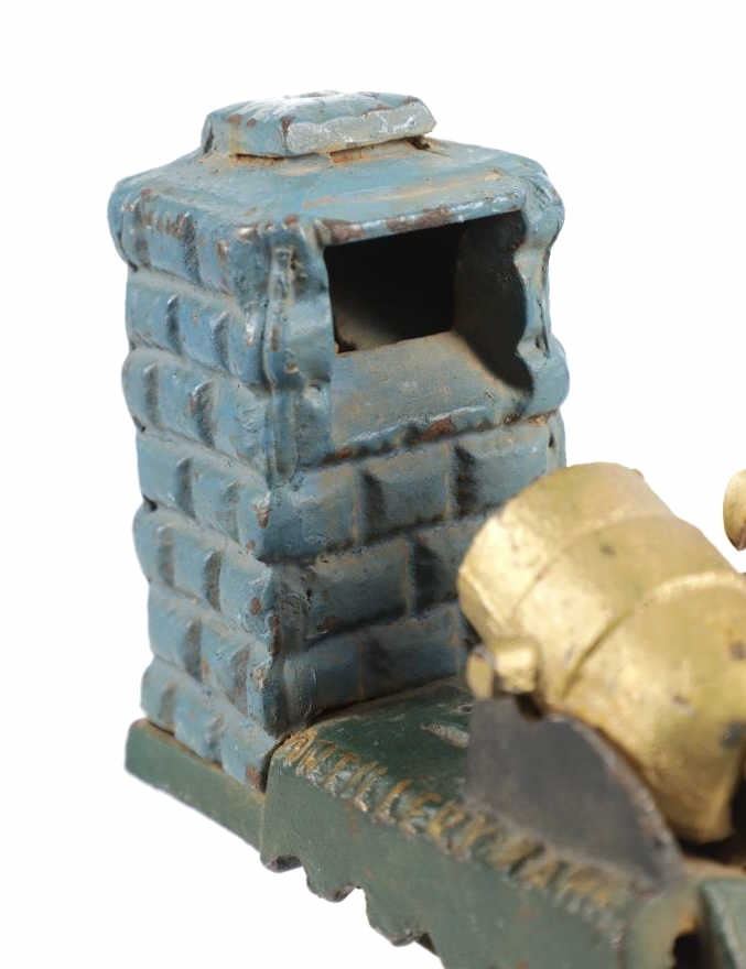 Featured in this lot is this hand painted cast iron "Artillery Bank" by J.E. Stevens circa 1892. The bank features a wonderfully and professionally crafted cast iron and hand painted construction that shows a Union officer standing beside a Howitzer cannon aimed at a tower; the action of inserting a coin includes the cannon hammer is cocked back and the basin can be loaded with a coin with the trigger on the model to the right and is fired into the bank. The plug on the bottom of the bank is missing but the action works as intended. The outside of the bank is marked as folows: Artillery Bank. The condition of this cast iron bank is preserved with some wear to the paint and show some under oxidation to the cast iron due to age and exposure but otherwise shows a preserved overall condition. The measurements of this cast iron bank is 5" x 3 1/2" x 6 1/2". The collective weight of this cast iron bank is 4lb 12oz.