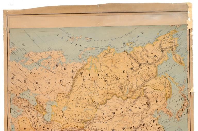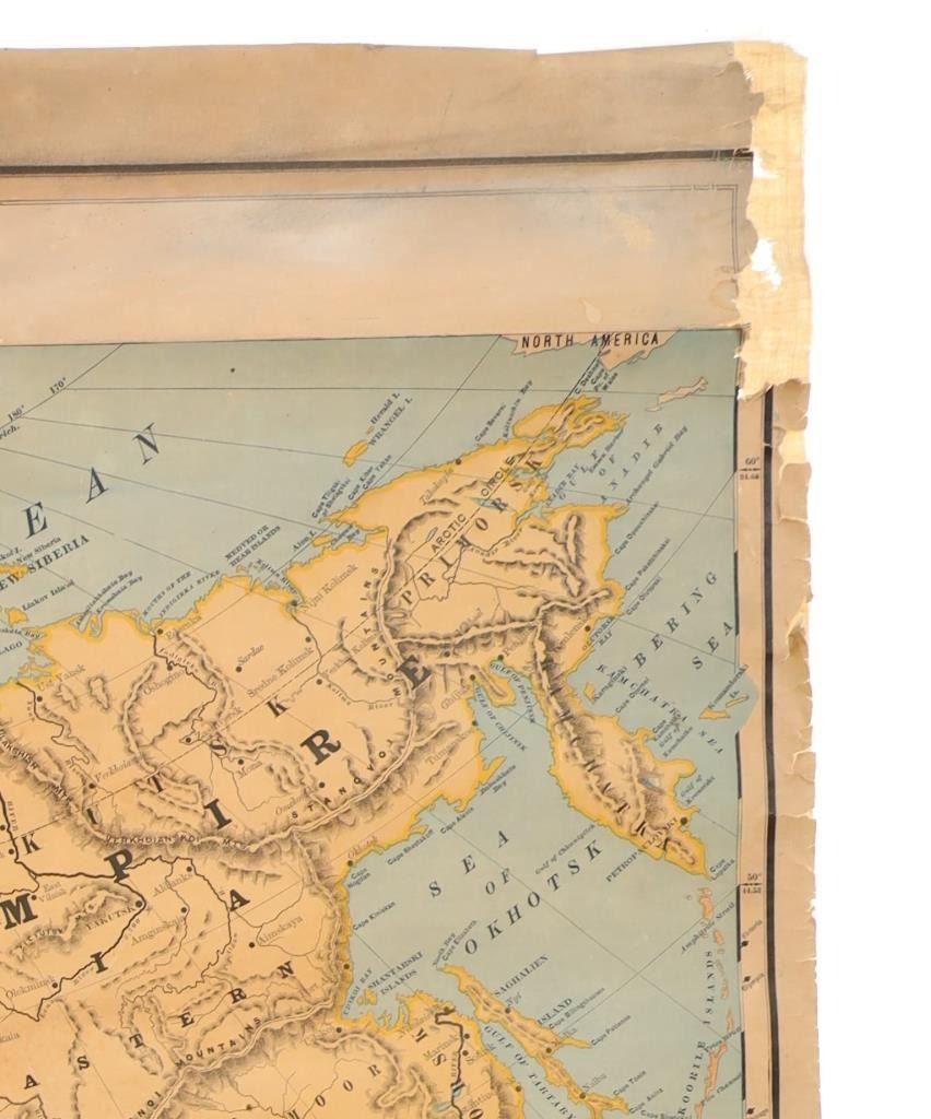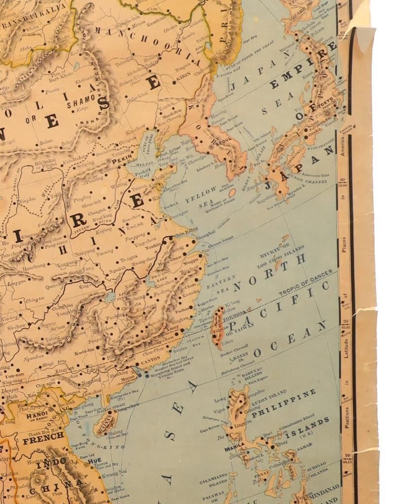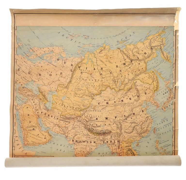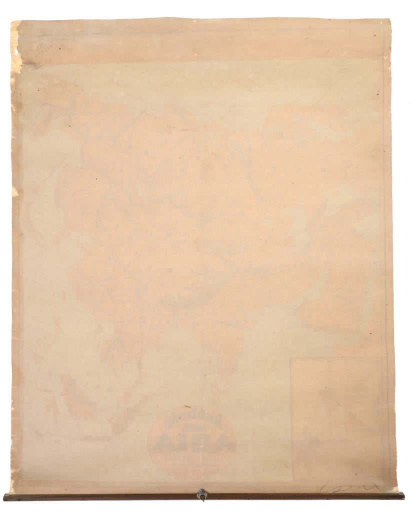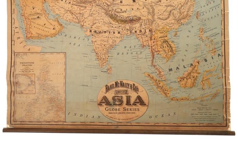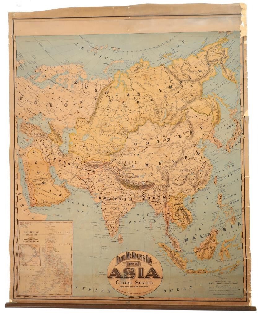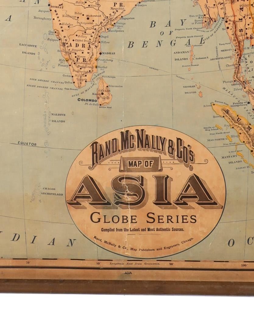Featured in this lot is this Rand McNally & Co. Globe Series Asia map circa 1894. The cartography map is wonderfully and professionally crafted construction. The map is marked as follows: Rand McNally & Co. Globe Series - Asia - Compiled form latest and Most Authentic Sources - Rand, McNally & Co. Map Publishers and Engravers, Chicago - Copyright 1894. The condition of this map shows some browning to the canvas mounted paper and shows wear to the wooden rode the map is attached to. The measurements of this map is 49 1/2" x 40 3/4".