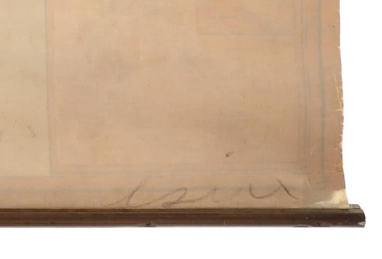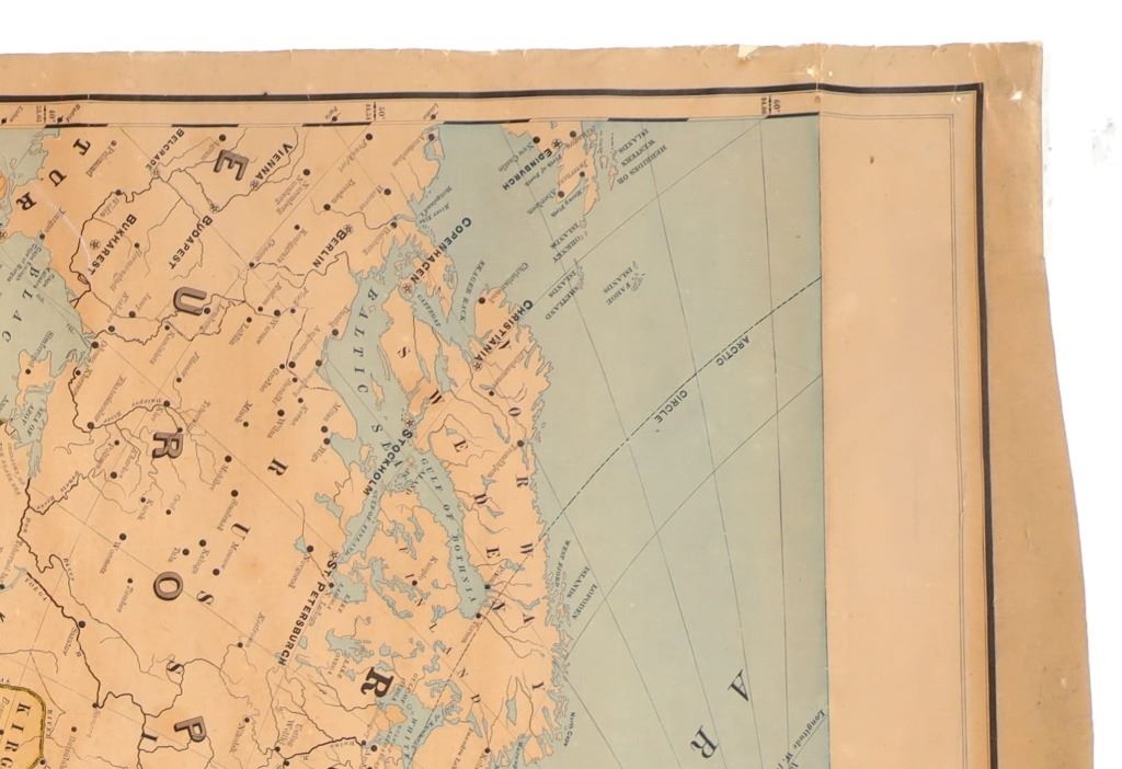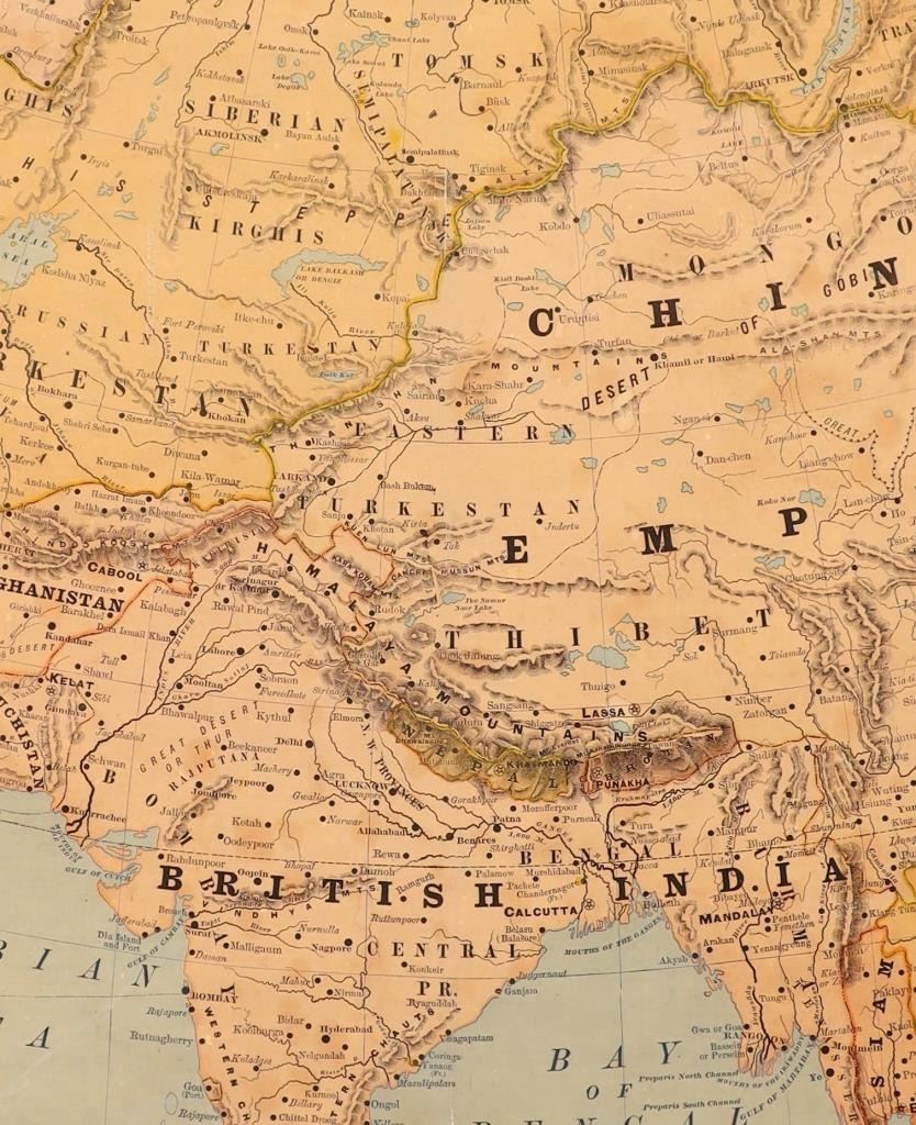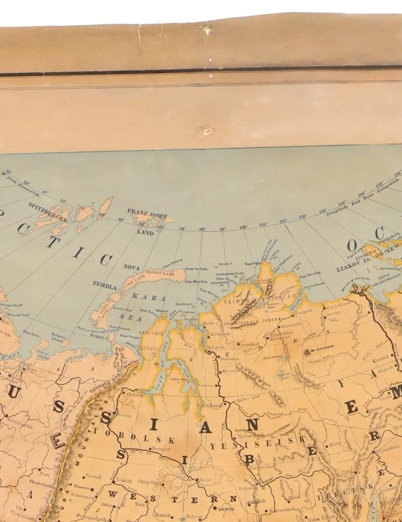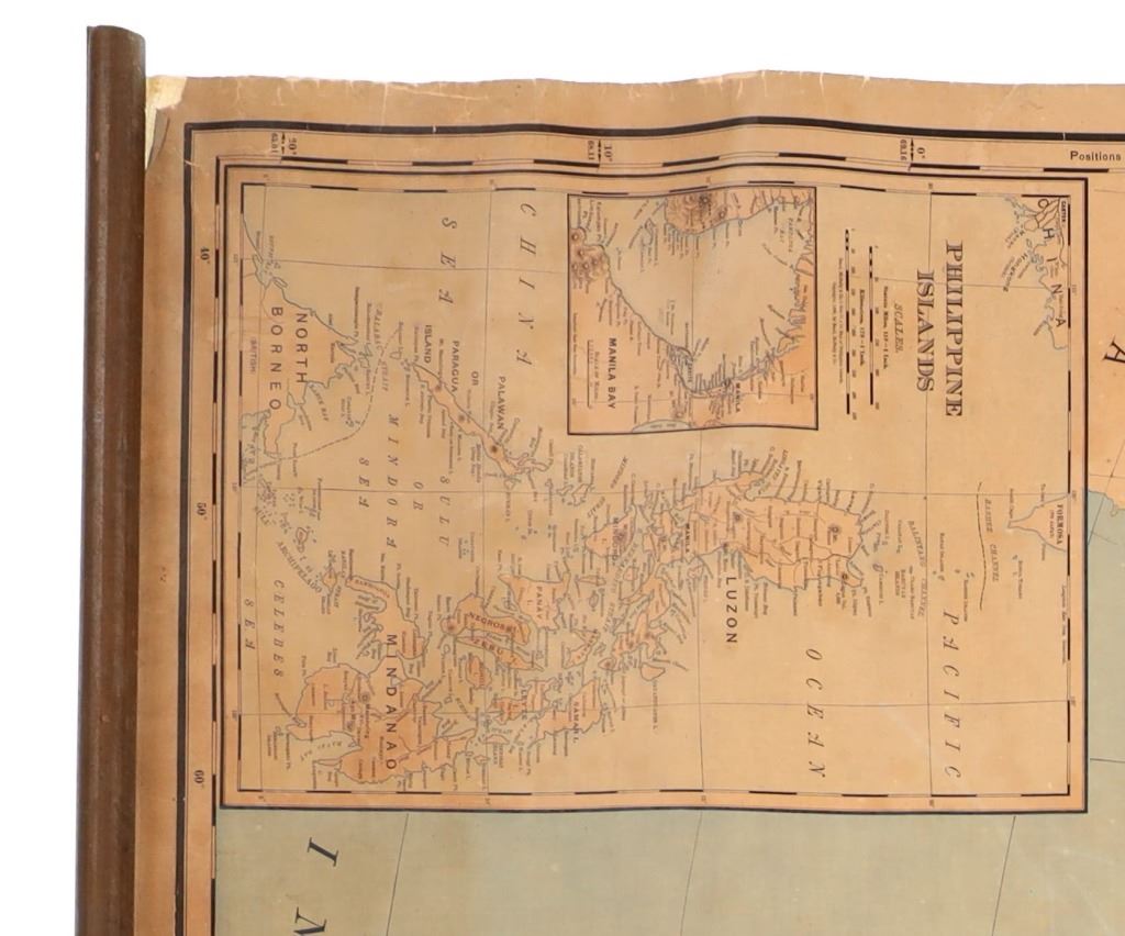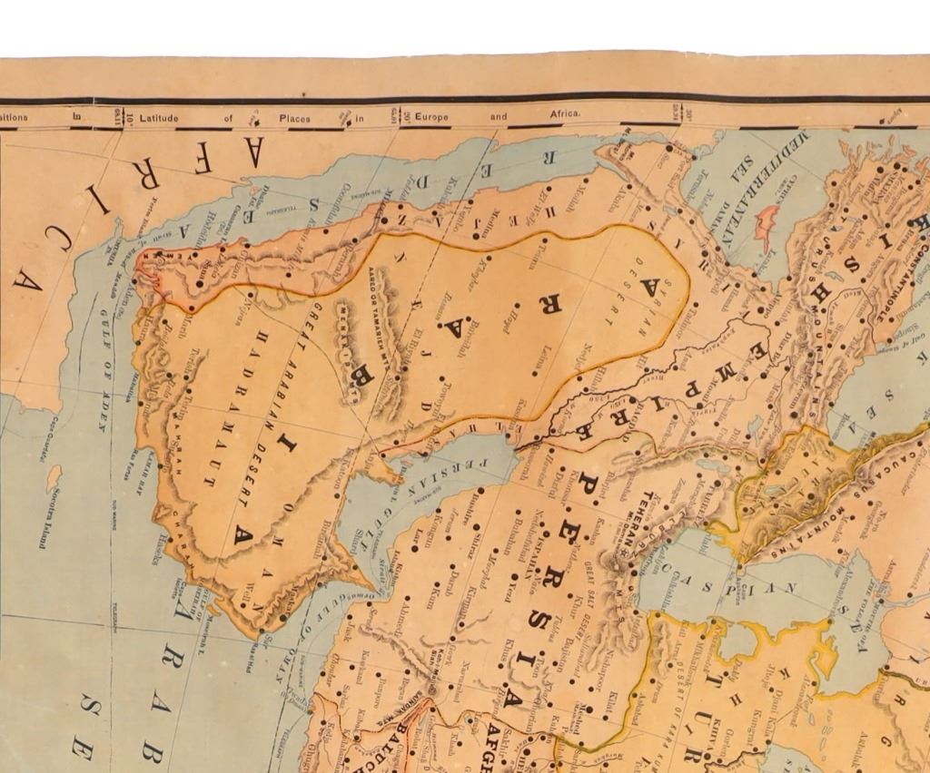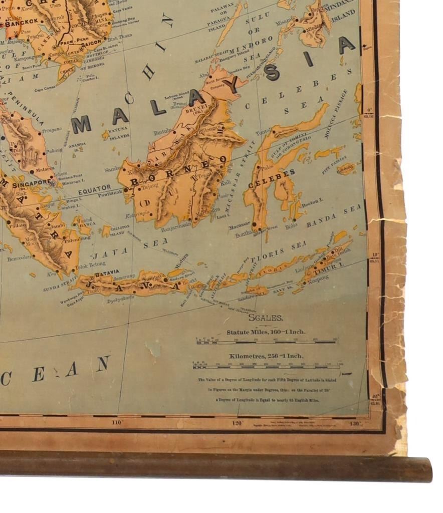 Featured in this lot is this Rand McNally & Co. Globe Series Asia map circa 1894. The cartography map is wonderfully and professionally crafted construction. The map is marked as follows: Rand McNally & Co. Globe Series - Asia - Compiled form latest and Most Authentic Sources - Rand, McNally & Co. Map Publishers and Engravers, Chicago - Copyright 1894. The condition of this map shows some browning to the canvas mounted paper and shows wear to the wooden rode the map is attached to. The measurements of this map is 49 1/2" x 40 3/4".