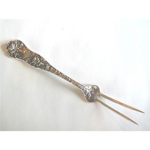 BURTON BROOK FARM ANTIQUES presents a splendid sterling silver circa June 29, 1897 "Potato" Fork made by George W. Shiebler, New York, New York . This 7" long fork has deeply hand-chased roses, leaves and stems trailing on the front and rose clusters on back handle. The fork is heavy sterling and stamped: Sterling / June 29, 1897 and the Shiebler Hallmark of S in an oval between angel wings. This fine example dates to the great era of American silversmiths now long past. The JPG image was very difficult to capture and does not do any justice to this stunning fork server.