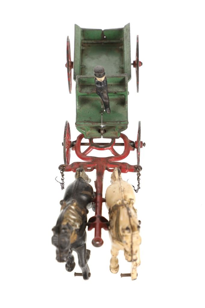 Offered in this lot is a Rare Kenton Cast Iron Two Horse Delivery Wagon With Rider, circa 1900-1920s. The Kenton Hardware Company was promoted as "the largest factory in the USA exclusively making cast iron toys" at the turn of the twentieth century. One of Hardin County, Ohio's largest employers, the factory produced a variety of toys that were miniature versions of fire engines, circus wagons, carriages, banks, trains, and stoves. Toy production began in 1894 because of patent disputes with a line of horse-drawn fire equipment, banks, and toy stoves and the name was changed to the Kenton Hardware Manufacturing Co. Very early Kenton toys were not marked; only about ten percent of everything they made was marked. Those toys that were marked are plainly imprinted with the company name on the underside of the toy. In 1927 most of the company's toy production was horsedrawn toys, but this was phased out to be replaced by automotive toys. This toy has a seated driver with a team of two draft horses pulling a delivery wagon. The wagon is green, the spoked wheels and yoke assembly are red with one white horse and one black horse. Rider is painted blue and wearing a cap. Both horses are missing front wheel/tires from their right legs. Mold #2 stamped under yoke. Original paint has flaked off in places though most is intact. No other obvious damages noted. Measures 4.25"W x 14.5"L x 5"H